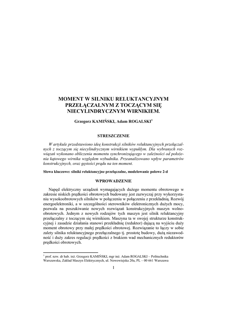 MOMENT W SILNIKU RELUKTANCYJNYM PRZEŁĄCZALNYM Z TOCZĄCYM SIĘ NIECYLINDRYCZNYM WIRNIKIEM. Grzegorz KAMIŃSKI, Adam ROGALSKI1 STRESZCZENIE W artykule przedstawiono ideę konstrukcji silników reluktancyjnych przełączalnych z toczącym się niecylindrycznym wirnikiem wypukłym. Dla wybranych rozwiązań wykonano obliczenia momentu synchronizującego w zależności od położenia kątowego wirnika względem wzbudnika. Przeanalizowano wpływ parametrów konstrukcyjnych, oraz gęstości prądu na ten moment. Słowa kluczowe: silniki reluktancyjne przełączalne, modelowanie polowe 2-d WPROWADZENIE Napęd elektryczny urządzeń wymagających dużego momentu obrotowego w zakresie niskich prędkości obrotowych budowany jest zazwyczaj przy wykorzystaniu wysokoobrotowych silników w połączeniu w połączeniu z przekładnią. Rozwój energoelektroniki, a w szczególności sterowników elektronicznych dużych mocy, pozwala na poszukiwanie nowych rozwiązań konstrukcyjnych maszyn wolnoobrotowych. Jednym z nowych rodzajów tych maszyn jest silnik reluktancyjny przełączalny z toczącym się wirnikiem. Maszyna ta w swojej strukturze konstrukcyjnej i zasadzie działania stanowi przekładnię (reduktor) dającą na wyjściu duży moment obrotowy przy małej prędkości obrotowej. Rozwiązanie to łączy w sobie zalety silnika reluktancyjnego przełączalnego tj. prostotę budowy, dużą niezawodność i duży zakres regulacji prędkości z brakiem wad mechanicznych reduktorów prędkości obrotowych. 1 prof. nzw. dr hab. inż. Grzegorz KAMIŃSKI, mgr inż. Adam ROGALSKI – Politechnika Warszawska, Zakład Maszyn Elektrycznych, ul. Nowowiejska 20a, PL – 00 661 Warszawa 1 Wśród wielu rozwiązań tego rodzaju maszyny elektrycznej z toczącym się wirnikiem: reluktancyjnym biernym cylindrycznym i niecylindrycznym, magnetoelektrycznym oraz hybrydowym na uwagę zasługuje silnik z wirnikiem biernym niecylindrycznym i on będzie przedmiotem tego artykułu. 1. BUDOWA I ZASADA DZIAŁANIA Cechą różniącą silnik reluktancyjny przełączalny z toczącym się wirnikiem niecylindrycznym od silnika tego samego typu lecz z wirnikiem cylindrycznym jest trajektoria ruchu wirnika [1]. W przypadku wirnika cylindrycznego, toczącego się po wewnętrznej (lub po zewnętrznej) powierzchni wzbudnika, poszczególne punkty jego przekroju poruszają się po trajektoriach, które są hipocykloidami. W przypadku wirnika niecylindrycznego, trajektorie ruchu poszczególnych punktów są zróżnicowane i zależą od kształtu wirnika, który ściśle warunkuje sposób rozwiązania podstawowych węzłów konstrukcyjnych. Rysunek 1. Przykładowe konstrukcje silników z niecylindrycznym wypukłym wirnikiem dla liczby pasm fazowych m=2, 3, 4, 5 Wirnik niecylindryczny może być wielokątem wypukłym o liczbie ścian bocznych n>=2 (rys. 1) lub wielokątem wklęsłym o liczbie ścian bocznych n>2 (rys. 2). W przypadku wielokątów wypukłych wzbudnik jest cylindryczny, zaś dla wielokątów wklęsłych wzbudnik ma strefę aktywną w postaci wielokąta wypukłego. 2 Rysunek 2. Przykładowe konstrukcje silników z niecylindrycznym wklęsłym wirnikiem dla liczby pasm fazowych m=3, 4. a) b) Rysunek 3. Schemat budowy silników: a) pięciofazowego m=5 z wirnikiem wypukłym – wirnik wewnętrzny; b) trójfazowego z wirnikiem cylindrycznym wewnętrznym – wzbudnik wewnętrzny niecylindryczny. Rozpatruje się tu dwa główne przypadki (I, II) z dwoma podprzypadkami każdy: Ia) – wirnik niecylindryczny wewnętrzny (wielokąt wypukły) i wzbudnik cylindryczny (rys. 3a), Ib) – wirnik cylindryczny zewnętrzny, toczący się po niecylindrycznym wzbudniku w formie wielokąta wypukłego (rys. 3b), IIa) – wirnik niecylindryczny wewnętrzny w formie wielokąta wklęsłego toczący się po wzbudniku o kształcie wielokąta wypukłego (rys. 2), IIb) – wirnik niecylindryczny wypukły zewnętrzny, toczący się po zewnętrznej niecylindrycznej powierzchni wzbudnika wewnętrznego (wielokąt wklęsły). 3 2. MODEL MATEMATYCZNY W celu zbadania wpływu struktury geometrycznej wirnika opracowano model matematyczny w układzie płaskorównoległym. Do obliczeń rozkładu pola magnetycznego i wielkości całkowych w modelowanym silniku, wykorzystano program PC-OPERA firmy Vector Fields [2]. W opisie modelu uwzględniono strukturę magnetowodu, parametry pasm fazowych (rozłożenie i gęstość prądu płynącego przez pasma) oraz zmianę położenia kątowego wirnika (toczenie się wirnika). Opracowany model pozwala na automatyczną zmianę parametrów (np.: położenia wirnika), wykonanie obliczeń całkowych (np.: momentu elektromagnetycznego) i zapis obliczonych wartości do zewnętrznego pliku w celu ich wizualizacji, a wszystko to bez ingerencji użytkownika. Najważniejszą wielkością całkową liczoną w programie był moment elektromagnetyczny synchronizujący, działający na wirnik. Zmienność momentu w funkcji obrotu wirnika (względem środka wzbudnika) wyznaczona jest dla jednego modułu silnika. Zakładając niezmienność rozkładu pola wzdłuż osi maszyny, wykonano do modelowania silnika, dwuwymiarowy model rozkładu pola magnetycznego. Wartość momentu synchronizującego wyznaczona jest w oparciu o wzór (wynikający z tensora naprężeń Maxwella): 2π T =r l∫ 2 0 Bn Bt dα µ0 (1) gdzie: r – promień okręgu w szczelinie powietrznej – droga całkowania gęstości kątowej siły stycznej, l – długość silnika, Bn , Bt – składowe indukcji magnetycznej, normalna i styczna do łuku. Przy dyskretnym wyznaczeniu rozkładu pola (składowych indukcji) np. metodą elementów skończonych wyrażenie przyjmie postać 2π T =r l k 2 k ( Bn Bt )i µ0 i =1 ∑ (2) gdzie: k – liczba punktów równomiernie rozłożonych na okręgu o promieniu r, w których obliczono składowe indukcji. Poprawne obliczenie momentu zgodnie z uwagami firmy Vector Fields [2] wymaga uśrednienia wartości momentów policzonych na kilku okr