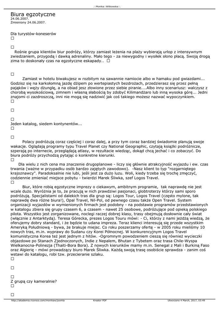 .::Monika::Witkowska::. Biura egzotyczne 24.06.2007. Zmieniony 24.06.2007. Dla turystów-koneserów Rośnie grupa klientów biur podróży, którzy zamiast leżenia na plaży wybierają urlop z intensywnym zwiedzaniem, przygodą i dawką adrenaliny. Mało tego - za niewygodny i wysiłek słono płacą. Swoją drogą zima to doskonały czas na egzotyczne eskapady.. Zamiast w hotelu biwakujesz w rozbitym na sawannie namiocie albo w hamaku pod gwiazdami... Godzisz się na karkołomną jazdę dżipem po wertepiastych bezdrożach, przedzierasz się przez pełną pająków i węży dżunglę, a na obiad jesz złowione przez siebie piranie....Albo inny scenariusz: walczysz z chorobą wysokościową, zimnem i własną słabością by zdobyć Kilimandżaro lub inną wysoka górę... Jedni znajomi ci zazdroszczą, inni nie mogą się nadziwić jak coś takiego możesz nazwać wypoczynkiem. Jeden katalog, siedem kontynentów... Polacy podróżują coraz częściej i coraz dalej, a przy tym coraz bardziej świadomie planują swoje wakacje. Oglądają programy typu Travel Planet czy National Geographic, czytają książki podróżnicze, szperają po internecie, przeglądają atlasy, w rezultacie wiedząc, dokąd chcą jechać i co zobaczyć. Do biura podróży przychodzą pytając o konkretne kierunki. Dla wielu z nich cena ma znaczenie drugoplanowe - liczy się głównie atrakcyjność wyjazdu i ew. czas trwania (ważne w przypadku osób bardzo zajętych zawodowo). -Nasz klient to typ "rozgarniętego krajoznawcy". Paradoksalnie nie lubi, jeśli jest za dużo luzu. Woli, kiedy trzeba się trochę zmęczyć, codziennie zmieniać miejsce pobytu - twierdzi Marek Śliwka, szef Logos Travel. Biur, które robią egzotyczne imprezy o ciekawym, ambitnym programie, tak naprawdę nie jest wcale dużo. Wyróżnia je to, że pracują w nich prawdziwi pasjonaci, globtroterzy którzy sami sporo podróżują. Specjalistami od dalekich tras dla grup są: Logos Tour, Logos Travel (często mylone, tak naprawdę dwa różne biura!), Opal Travel, Nil-Pol, od pewnego czasu także Open Travel. System organizacji wyjazdów w wymienionych firmach jest podobny - na podstawie programów przedstawionych w katalogu zbiera się grupy czasem 6, a czasem - nawet 25 osobowe, podróżujące pod opieką polskiego pilota. Wszystko jest zorganizowane, noclegi raczej dobrej klasy, trasy obejmują dosłownie cały świat (włącznie z Antarktydą). Teresa Górecka, prezes Logos Touru mówi: - Ci, którzy z nami jeżdżą wiedzą, że oferujemy dobry standard, i że będzie to udana impreza. Teraz klienci interesują się przede wszystkim Ameryką Południową - bywa, że brakuje miejsc. Co roku poszerzamy ofertę - w 2005 roku mieliśmy 10 nowych tras, m.in. wyprawy do Sudanu czy Korei Północnej. W konkurencyjnym Logos Travel komunistyczna Korea też jest jednym z hitów. -Ogromnym powodzeniem cieszą się również wycieczki objazdowe po Stanach Zjednoczonych, Indie z Nepalem, Bhutan z Tybetem oraz trasa Chile-Wyspa Wielkanocna-Polinezja (Thaiti-Bora Bora). Z nowych kierunków mamy m.in. Senegal z Mali i Burkiną Faso oraz Algierię - mówi prowadzący biuro Marek Śliwka. Każdą swoją trasę osobiście sprawdza - zanim coś wstawi do katalogu, robi tzw. przecieranie szlaku. Z grupą czy kameralnie? http://akademia.ricoroco.com/monikaw/joomla Kreator PDF Utworzono 4 March, 2017, 03:49 .::Monika::Witkowska::. Kim właściwie są uczestnicy egzotycznych wyjazdów grupowych? Reprezentują różne zawody, choć wyraźnie dominują prawnicy, lekarze oraz właściciele prywatnych firm. Dużo zarabiający menadżerowie rzadko jeżdżą - pochłonięci robieniem kariery po prostu nie mogą pozwolić sobie na urlop. Ci, którzy decydują się na takie oryginalne trasy to na ogół ludzie oczytani, wyedukowani (niekiedy wykładowcy wyższych uczelni), przygotowani do podróży (często zabierają mapy i książki dotyczące danej trasy). Ciekawe, że intensywność programu nie zniechęca osób starszych - na zorganizowanych wycieczkach po dalekiej Azji czy Afryce bardzo często zdarzają się uczestnicy w okolicach 70-tki. Trzeba przy tym przyznać, że tego typu osoby świetnie sobie radzą i mają kondycję, której pozazdrościć może współczesna młodzież (w pilotowanej przez siebie na Madagaskarze grupie miałam 68-latka który codziennie rano robił... 70 pompek!). O dziwo - zdecydowanie częściej jeżdżą na wycieczki kobiety! Dlaczego młodzież na zorganizowanych wycieczkach jest raczej nieliczna? Cóż, zwykle jest tak zajęta dorabianiem się, że szkoda jej pieniędzy na wojaże, a jeśli już zarazi się nałogiem podróżowania, zwykle jest na tyle samodzielna, że nie potrzebuje pomocy biura. W przeciwieństwie do osób starszych, młodzież jest bardziej śmiała, zaradna językowo, umie znaleźć w internecie tanie przeloty, wie jak sobie radzić np. w szukaniu noclegów. Zwłaszcza studenci wolą jeździć na własną rękę. "Młodzi", którzy trafiają do biur to już zwykle 30-40 latkowie, z ustawioną karierą zawodową, często z podchowanymi dziećmi, którzy po prostu nie mają czasu ani głowy na organizowanie wyjazdu. Wolą zapłacić i mieć wszystko przygotowane. Bardzo często zamawiają wyjazdy w małej grupce - czasem są to np. zaprzyjaźnione rodziny, czasem paczka kumpli lub wyjazd tylko we dwoje. Wielu klientów nie patrzy wcale w katalogi, nie sprawdza cen mówią krótko ile mają czasu, co chcieliby zaliczyć i na tej podstawie biuro robi im kalkulację. W tego typu indywidualnych wyjazdach specjalizuje się Alco Tours Kafarski. Prowadzone przez globtroterską rodzinę biuro z Ostrowa Wielkopolskiego praktycznie nie reklamuje się w mediach. Na brak klientów nie narzeka - ci którzy ich znają, polecają następnym. -Przychodzi klient i mówi, że chce ponurkować na Galapagos, zobaczyć Pigmejów w Kamerunie albo sfotografować goryle w Ugandzie - nie ma sprawy! Zrealizujemy nawet najbardziej wy