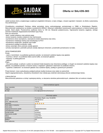Oferta nr SAJ-DS-383 Jeżeli szukasz domu urządzonego w pięknym angielskim klimacie, w stylu vintage, z dużym ogrodem i tarasem, ta oferta z pewnością Cię zainteresuje:) Chcielibyśmy przedstawić Państwu ofertę sprzedaży domu wolnostojącego wzniesionego w 1986r w Wodzisławiu Śląskim. Nieruchomość usadowiona na działce o powierzchni 850m2. Głównym materiałem budulcowym wykorzystanym w trakcie budowy jest pustak. Dach płaski. Powierzchnia użytkowa domu to 140 m2. Budynek podpiwniczony. Ogrzewanie budynku węglowe, istnieje również możliwość dogrzewania kominkiem typu Koza. Dom po remoncie: -dach, został ocieplony oraz pokryty papą -ściany budynku zostały ocieplone oraz otynkowane -wymieniono drzwi zewnętrzne, wewnętrzne (białe drewniane) oraz okna, -wymieniono instalację wodną oraz kanalizację na PCV -wymieniony został piec, grzejniki oraz bojler -wymieniono podłogi na panele i kafle, -ściany wewnątrz domu pokryte zostały gipsem. -schody wewnętrzne: podnóżki pokryte zostały dębowym drewnem, przednóżki pomalowano na biało. OPIS POMIESZCZEŃ Parter - salon z kominkiem: na podłodze gustowne panele, na ścianach ozdobne tapety oraz gładzie - kuchnia z oknem: na podłodze biało-czarne kafle, na ścianach gładzie - łazienka: w pełnej glazurze - gabinet Piętro - trzy jasne pokoje: w jednym z pokoi na ścianach biała boazeria oraz drewniana podłoga; w drugim na ścianach ozdobne tapety oraz gładzie, na podłodze panele; w trzecim ściany w tapetach i gładziach natomiast na podłodze drewno. - sypialnia z balkonem: na ścianach gładzie oraz ozdobne tapety, podłogi w gustownych panelach Przed domem: nowo wybudowany podjazd pokryty kostka brukowa oraz wiata na samochód. Ogród zagospodarowany, obsadzony drzewkami oraz rabatą typu skalniak stanowiącą zbocze zadaszonego tarasu. LOKALIZACJA: Nieruchomość położona w cichej i spokojnej okolicy, w otoczeniu domków jednorodzinnych, zaledwie 2km od centrum miasta. Dane kontaktowe agenta Imię i nazwisko Telefon E-mail Natalia Kijas 519 519 899 [email protected] Informacje ogólne Lokalizacja Cena Pow. całkowita [m2] Standard Ilość pięter w budynku Ilość pokoi Zagospodarowanie działki Ukształtowanie działki Kształt działki Ogrodzenie działki Okna Instalacje Balkon Ilość balkonów Wodzisław Śląski, (woj. ŚLĄSKIE) 390 000,00 zł 140,00 2 6 Zagospodarowana płaska prostokat mieszane nowe PCV wymienione jest 1 Sajdak Nieruchomości ul. Turystyczna 15 44-335 Jastrzębie-Zdrój, tel. 519-130-820 www.sajdaknieruchomosci.pl Copyright 2017 by Sajdak Nieruchomości Oferta nr SAJ-DS-383 Rodzaj domu Pokrycie dachu Pozwolenie na użytkowanie Podpiwniczenie Stan budynku Rok budowy dom jednorodzinny papa Tak Tak do zamieszkania 1986 Sajdak Nieruchomości ul. Turystyczna 15 44-335 Jastrzębie-Zdrój, tel. 519-130-820 www.sajdaknieruchomosci.pl Copyright 2017 by Sajdak Nieruchomości