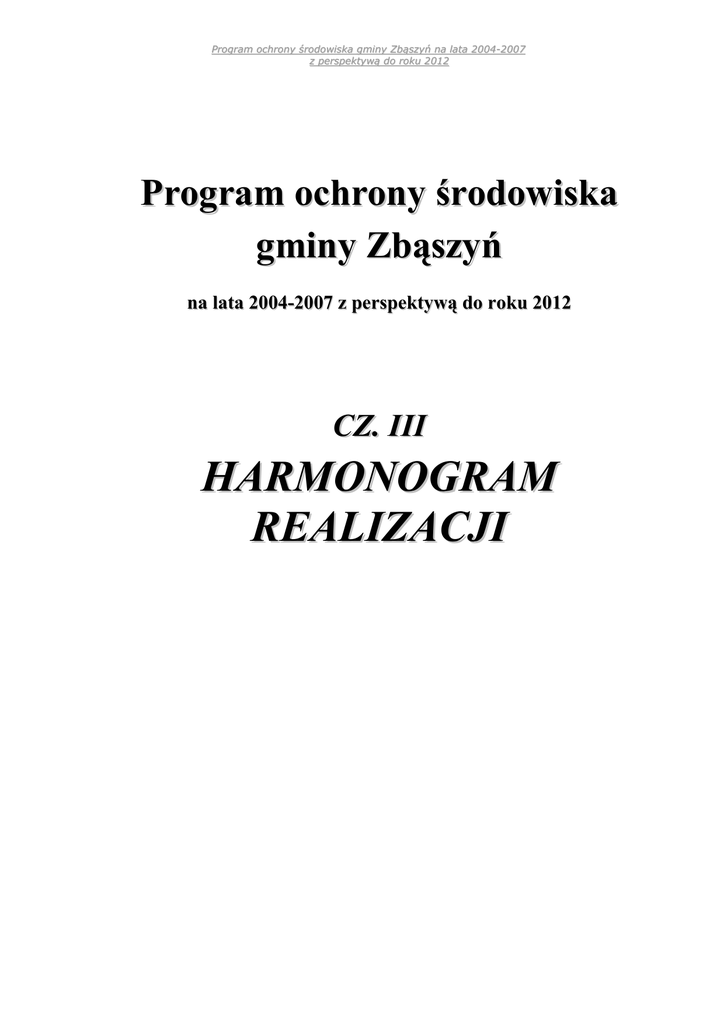 Program ochrony środowiska gminy Zbąszyń na lata 2004-2007 z perspektywą do roku 2012 Program ochrony środowiska gminy Zbąszyń na lata 2004-2007 z perspektywą do roku 2012 CZ. III HARMONOGRAM REALIZACJI Program ochrony środowiska gminy Zbąszyń na lata 2004-2007 z perspektywą do roku 2012 Spis treści 1. ANALIZA SWOT ..................................................................................................................... 3 2. PODSTAWY PRAWNE DZIAŁAŃ WYTYCZONYCH W PROGRAMIE OCHRONY ŚRODOWISKA GMINY ZBĄSZYŃ ..................................................................................................................... 17 3. HARMONOGRAM REALIZACJI ZADAŃ Z ZAKRESU PROGRAMU OCHRONY ŚRODOWISKA DLA GMINY ZBĄSZYŃ ..................................................................................................................... 19 4. RAMY ORGANIZACYJNE REALIZACJI PROGRAMU OCHRONY ŚRODOWISKA......................... 31 5. PODSTAWY ORGANIZACYJNE FINANSOWYCH ASPEKTÓW REALIZACJI PROGRAMU OCHRONY ŚRODOWISKA – UNIJNE MOŻLIWOŚCI FINANSOWANIA PRZEDSIĘWZIĘĆ Z ZAKRESU OCHRONY ŚRODOWISKA ......................................................................................................... 32 6. ZARZĄDZANIE WDRAŻANIEM I REALIZACJĄ STRATEGII OCHRONY ŚRODOWISKA ............. 42 6.1. Ogólny system zarządzania strategią ........................................................................... 42 7. STRESZCZENIE W JĘZYKU NIESPECJALISTYCZNYM ............................................................. 44 2 Program ochrony środowiska gminy Zbąszyń na lata 2004-2007 z perspektywą do roku 2012 1. Analiza SWOT Elementem pomocniczym przy tworzeniu dokumentów o charakterze strategicznym, takich jak plany i programy jest analiza SWOT, której nazwa wywodzi się angielskich słów Strengths (mocne strony), Weaknesses (słabe strony), Opportunities (szanse) oraz Threats (zagrożenia). Wykonaniem tego typu analizy poprzedzone zostało sporządzenie Programu ochrony środowiska dla gminy Zbąszyń. Dla potrzeb Programu analiza SWOT oparta została na schemacie klasyfikacji dzielącym wszystkie czynniki mające wpływ na bieżący i przyszły stan gminy na czynniki: • • zewnętrzne w stosunku do gminy oraz takie, które mają charakter uwarunkowań wewnętrznych, wywierające na nią negatywny lub pozytywny wpływ. Ze skrzyżowania tych dwóch podziałów powstały cztery kategorie czynników: • wewnętrzne pozytywne – mocne strony, czyli walory gminy, które w pozytywny sposób wyróżniają ją z otoczenia; • wewnętrzne negatywne – słabe strony, czyli konsekwencje różnego rodzaju ograniczeń i niedostatków (organizacyjnych, technologicznych, bądź finansowych) • zewnętrzne pozytywne – szanse – zjawiska i tendencje w otoczeniu, które odpowiednio wykorzystane mogą stać się impulsem rozwoju oraz osłabią zagrożenia; • zewnętrzne negatywne – zagrożenia – wszystkie czynniki zewnętrzne, które są postrzegane jako bariery dla rozwoju. Istnienie zagrożeń ma destrukcyjny wpływ na powodzenie zaproponowanych przedsięwzięć. Schemat organizacyjny analizy SWOT dla Programu ochrony środowiska gminy Zbąszyń przedstawiono poniżej: WEWNĘTRZNE Silne strony Słabe strony urozmaicony krajobraz przyrodniczy płytkie, eutroficzne zbiorniki wodne, podatne na degradację ZEWNĘTRZNE Szanse Zagrożenia poprawa stanu czystości wód zlewni Obry przecinanie obszarów o najwyższych walorach przyrodniczych przez drogi szybkiego ruchu Identyfikacja słabych i silnych stron gminy oraz szans i zagrożeń, jakie stoją przed nią, dokonane zostało na czterech poziomach operacyjnych: • wywiady z pracownikami Urzędu Miejskiego i ankiety przeprowadzone z mieszkańcami gminy Zbąszyń, • badania terenowe: inwentaryzacja i waloryzacja krajobrazowa oraz badania fitoindykacyjne, • analiza dokumentów strategicznych gminy oraz dokumentów o charakterze nadrzędnym w stosunku do gminnego programu ochrony środowiska, • debaty strategiczne z udziałem przedstawicieli zróżnicowanych grup społecznych. Debaty strategiczne zostały przeprowadzone dwukrotnie: 03.12.2003 r. oraz 02.04.2004 r. 3 Program ochrony środowiska gminy Zbąszyń na lata 2004-2007 z perspektywą do roku 2012 Lista uczestników debat strategicznych w Urzędzie Miejskim w Zbąszyniu w dniach: 03.12.2003 r. oraz 02.04.2004 r. Nazwisko i imię uczestnika debaty Bielaszewski Robert Borkowski Grzegorz Chlebowski Stanisław Drogla Franciszek Jankowiak Jarosław Kardaszewski Walerian Konieczek Eugeniusz Kotlarski Krzysztof Krawczyk Hubert Łodyga Zenon Nazimek Henryk Orzechowski Marek Pękala Jan Przybyła Edmund Rzepa Edmund Skubiszyński Mirosław Sołtysik Marek Suchorski Rafał Szymczak Bogdan Zych Stefan Bielaszewski Robert Chlebowski Stanisław Drogla Franciszek Jankowiak Jarosław Kardaszewski Walerian Konieczek Eugeniusz Kozłowski Zygmunt Krawczyk Hubert Łodyga Zenon Nazimek Henryk Orzechowski Marek Pacholak-Laskowska Zofia Pękala Jan Przybyła Edmund Rzepa Edmund Skubiszyński Mirosław Sołtysik Marek Suchorski Rafał Szymczak Bogdan Wojciechowska Ewa Zych Stefan 03.12.2003 r. Miejsce pracy/funkcja Radny UAM Radny Radny Zespół Szkół nr 1 w Zbąszyniu Radny Radny Nadleśnictwo Wolsztyn Radny Radny Radny Kierownik Referatu Ochrony Środowiska, Rolnictwa, Rozwoju Wsi i Ochrony Przeciwpożarowej Radny WOPR Przewodniczący Rady Radny Radny Burmistrz Radny Radny 02.04.2004 r. Radny Radny Radny Zespół Szkół nr 1 w Zbąszyniu Radny Radny Strażnik Ekologiczny Radny Radny Radny Kierownik Referatu Ochrony Środowiska, Rolnictwa, Rozwoju Wsi i Ochrony Przeciwpożarowej Starostwo Powiatowe Nowy Tomyśl Radny WOPR Przewodniczący Rady Radny Radny Burmistrz Radny Radna Radny 4 Program ochrony środowiska gminy Zbąszyń na lata 2004-2007 z perspektywą do roku 2012 Na pierwszym ze spotkań przedstawiony został proponowany zakres i metodyka sporządzenia Programu och