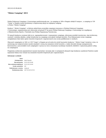 2012-01-03 09:48:54 "Mister Camping" 2011 Polska Federacja Campingu i Caravaningu poinformowała nas , że camping nr 180 w Stegnie zdobył II miejsce , a camping nr 159 "Camp" w Stegnie został wyróżniony w tegorocznej edycji na najlepszy camping w Polsce "Mister Camping". Konkurs " Mister Camping", w którym udział biorą wszystkie campingi zrzeszone w Polskiej Federacji Campingu i Caravaningu, organizowany jest rokrocznie od ponad 47 lat przez Polską Federację Campingu i Caravaningu we współpracy z Ministerstwem Sportu i Turystyki oraz Polską Organizacją Turystyczną. W ramach konkursu oceniane były m.in. zagospodarowanie i wyposażenie campingu, oferowany produkt turystyczny, stan techniczny, czystość i estetyka obiektu, usługi świadczone na campingu oraz jakość obsługi turystów. Przy dokonywaniu oceny campingu uwzględniane były także opinie turystów krajowych i zagranicznych oraz oceny publikowane w mediach. Obecność campingów nr 180 i nr 159 "Camp" w Stegnie już od wielu lat wśród laureatów konkursu " Mister Camp" świadczy o tym, że zachowują one nieprzerwalnie wysoki standard i cieszą się uznaniem wśród turystów, a także dowodzi dużego zaangażowania kierownictwa i pracowników tych campingów w pracę na rzecz utrzymania wysokiego standardu obiektów i najwyższej jakości usług na campingach. Pragniemy serdecznie pogratulować naszym laureatom i życzymy aby w następnych edycjach tego konkursu uzyskiwali Państwo nadal najwyższe lokaty oraz cieszyli się uznaniem turystów krajowych jak i zagranicznych. Informacje o artykule Autor: Zredagował(a): Rafał Tokarski Data powstania: 03.01.2012 09:48 Data ostatniej modyfikacji: 03.01.2012 09:49 Liczba wyświetleń: Wydrukowano z serwisu: Wydrukowano dnia: 402 stegna.pl 2017-03-04 03:47:05