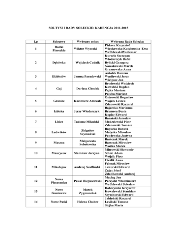 SOŁTYSI I RADY SOŁECKIE: KADENCJA 2011-2015 Lp Sołectwo 1 Budki Piaseckie 2 Dębówka 3 Elżbietów 4 Gaj 5 Granice 6 Izbiska 7 Lisice 8 Ludwików 9 Maszna 10 Maurycew 11 Mikołajew 12 Nowa Piasecznica 13 Nowe Gnatowice 14 Nowe Paski Wybrany sołtys Wybrana Rada Sołecka Piskorz Krzysztof Wiktor Wysocki Więckowska Kutyłowska Ewa WróblewskiWaldemar Kurzela Szczepan Włodarczyk Rafał Wojciech Cudnik Bylicki Grzegorz Nowakowski Marek Grzanowska Anna Antolak Damian Janusz Paradowski Wasilewski Jerzy Wielgosz Jan Brodowski Wojciech Kowalski Bogdan Dariusz Chodak Pajka Mariusz Pałuba Mariusz Ostrowski Bogusław Kazimierz Antczak Wójcik Leszek Zdanowski Ryszard Bajurska Marianna Jerzy Włodarczyk Brymora Beata Kopiec Edward Barański Jarosław Tadeusz Mikulski Modzelewski Piotr Zdanowski Tomasz Bogucka Danuta Zbigniew Matyska Mirosław Szymański Pawłowska Justyna Bartczak Marek Małgorzata Bartczak Mirosław Sobolewska Wódka Marek Mitrowski Sławomir Stanisław Jarzyna Solski Adam Wójcik Piotr Cieślik Anna Felczak Mirosław Andrzej Szufliński Jaworski Edward Zając Józef Zdanikowski Andrzej Maciag Jan Paweł Bieguszewski Parzydeł Włodzimierz Wróblewski Bolesław Dobrzyński Krzysztof Marek Kowalewski Stanisław Zygmunciak Szymborski Edward Jabłoński Ryszard Helena Chaber Lesiński Tomasz Siejka Maria 15 Paprotnia Jan Mitrowski 16 Pawłowice Sylwester Gmurek 17 Pawłówek Jan Bluszcz 18 Seroki-Parcela Krystyna Pietrzak 19 Seroki-Wieś Krzysztof Antczak 20 Skrzelew Maria Tondera 21 Stare Paski Andrzej Szymański 22 Szymanów Hanna Jankowska 23 Teresin-Gaj Kazimierz Dąbrowski 24 Topołowa Halina Ziółkowska 25 Witoldów Witold Zdanikowski Beta Krzysztof Kalinowski Jacek Radkowski Piotr Wysocka-Klimek Bernarda Goszcz Józef Mularczyk Mirosław Wróbel Marcin Banaszek Jadwiga Lisek Maciej Sobota Sylwester Latoszewski Dariusz Jasiński Zbigniew Kuźmińska Pelagia Szymański Piotr RożnowskaMałgorzata Bajurski Grzegorz Drzewicz Mieczysław Rosa-Zdanowska Katarzyna Włodarski Grzegorz Cuper Marcin Grzegorek Grażyna Lipiński Krzysztof Misiak Piotr Szymańczak Ewa Tondera Andrzej Jaczyński Stanisław Kacprzak Damian Smoliński Wiesław Jankowski Zbigniew KomorowskiSylwester Kupski Jarosław Dymińska Jadwiga Trzos Bogumiła Winczewski Wincenty Ziąbski Mirosław Zych Julita Dzikowska Renata Grzegorek Mieczysław Misiak Lucjan Sitek Barbara Wieczorek Zofia Grzelak Elżbieta Wasilewska Teresa Zając Wacława