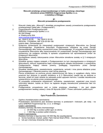 Postępowanie nr EKO/HU/D023/12 Warunki przetargu przeprowadzanego w trybie przetargu otwartego określone przez ENERGA Kogeneracja Spółka z o.o. z siedzibą w Elblągu §1 Warunki prowadzenia postępowania 1. 2. 3. 4. 5. 6. Warunki (dalej jako „Warunki”) określają szczegółowe zasady prowadzenia postępowania przetargowego (dalej jako „Postępowanie”). Organizatorem Postępowania jest: ENERGA Kogeneracja Spółka z o.o. 82-300 Elbląg ul. Elektryczna 20A www.energa-kogeneracja.pl, tel.: 55/612 20 00, fax: 55/612 20 05 REGON: 170356044, NIP 578-20-58-156 zwana dalej „Zamawiającym”. Wyłączne uprawnienie do interpretacji postanowień niniejszych Warunków ma Zarząd Zamawiającego. Wyjaśnienia dotyczące Postępowania udzielane są przez Zarząd Zamawiającego albo osoby wyznaczone przez Zamawiającego. W przypadku konieczności uzupełnienia Warunków albo sprecyzowania ich postanowień Zarząd Zamawiającego jest uprawniony do podjęcia uchwały w sprawie uzupełnienia lub wprowadzenia zmian do niniejszych Warunków. Szczegółowe zasady dokonywania zmian Warunków określone zostały w § 3 niniejszych Warunków. Wszelkie sprawy mające związek z Postępowaniem (w tym nieuregulowane w niniejszych Warunkach), których wyjaśnienia bądź rozstrzygnięcia zaŜąda którykolwiek z uczestników Postępowania mający interes prawny, podlegają rozpoznaniu przez Zarząd Zamawiającego. Wszelkie oświadczenia, zawiadomienia, wyjaśnienia, wnioski i inne pisma składane przez Zamawiającego i Oferenta powinny mieć formę pisemną. Pisma przekazane za pomocą poczty elektronicznej lub faksu (z wyjątkiem oferty, która powinna być złoŜona w sposób określony w § 5 Warunków) uwaŜa się za złoŜone w terminie, jeŜeli ich treść dotarła do adresata przed upływem terminu i została niezwłocznie potwierdzona na piśmie przez przekazującego. W przypadku przekazania oświadczeń, wniosków, zawiadomień, wyjaśnień oraz innych informacji faksem, kaŜda ze Stron na Ŝądanie drugiej niezwłocznie potwierdza fakt ich otrzymania. Postępowanie prowadzone jest w trybie przetargu otwartego i nie jest objęte postępowaniem według ustawy z dnia 29 stycznia 2004 r. Prawo zamówień publicznych. §2 Opis Przedmiotu Zamówienia 1. Ogólna charakterystyka zamówienia: Przedmiotem Zamówienia jest dostawa biomasy w postaciach i ilościach, jak niŜej - na rzecz ENERGA Kogeneracja Sp. z o.o. w Elblągu: Część I zamówienia: Dostawy biomasy dla bloku biomasowego: • 24 000 Mg w postaci pellet agro ze słomy, • 1 500 Mg w postaci pellet drzewny, Część II zamówienia: Dostawy biomasy w łącznej ilości 35 000 Mg dla współspalania: a. forma handlowa: brykiet, pellet, Palm Kernel Shell (PKS) – biomasa drzewna I/lub agro b. lub pył z biomasy drzewnej i/lub agro. 1 Postępowanie nr EKO/HU/D023/12 2. 3. 4. 5. 6. 7. 8. 9. 10. 11. 12. 13. Dane techniczne: zakres wymagań technicznych (parametry fizyko-chemiczne), jakie powinna posiadać biomasa przedstawiono w Załączniku nr 1 do Warunków (Tabele A, B, C). Wymagany termin realizacji zamówienia: Część I zamówienia: od 1 października 2012 r. do 31 grudnia 2012 r., Część II zamówienia: 1 lipca 2012 r. do 31 grudnia 2012 r., zgodnie z harmonogramem dostaw przedstawionym w Załączniku nr 1 do Warunków (Tabela D i E). Miejsce realizacji zamówienia: franco magazyn biomasy Zamawiającego w Elblągu przy ul. Elektrycznej 20A. Sposób dostawy: a. część I zamówienia transport samochodami samowyładowczymi z odpowiednim systemem rozładowczym z moŜliwością wyładunku tyłem, lub transportem kolejowym z odpowiednim systemem rozładowczym; b. część II zamówienia transport samochodami samowyładowczymi z odpowiednim systemem rozładowczym z moŜliwością wyładunku tyłem, pyłocysternami z moŜliwością rozładunku pneumatycznego. Oferent zobowiązuje się dostarczyć na własny koszt i ryzyko biomasę do miejsca wskazanego w ust. 4 powyŜej. Oferent bierze na siebie odpowiedzialność za ubytki, niedobory i wady dostarczonej Zamawiającemu biomasy, w tym powstałe w czasie transportu do miejsca przeznaczenia, i ponosi z tego tytułu wszelkie skutki prawne. Zamawiający dopuszcza składanie ofert częściowych. Zamawiający zastrzega, iŜ oddzielnie będą oceniane dostawy poszczególnych rodzajów biomasy. Zamawiający zastrzega dowolny podział ilości dostaw poszczególnych rodzajów biomasy. Zamawiający zastrzega sobie prawo do zamówienia ilości biomasy z tolerancją +/- 20% w stosunku do ilości określonych ust. 1 powyŜej. Oferentowi nie przysługuje wobec Zamawiającego jakiekolwiek roszczenie związane z zamówieniem innej ilości biomasy niŜ wskazana w ust. 1 powyŜej z tolerancją +/- 20%. Zamawiający zastrzega sobie prawo do podziału Przedmiotu Zamówienia pomiędzy kilku Oferentów w sytuacji, gdy najkorzystniejsza nieodrzucona oferta nie będzie zaspokajała w pełni zapotrzebowania Zamawiającego określonego w § 2 ust. 1 Warunków. W takiej sytuacji Zamawiający udzieli zamówienia kolejnym Oferentom, na zasadzie pierwszeństwa ofert korzystniejszych (zgodnie z kryterium oceny ofert) dla Zamawiającego, aŜ do pełnego zaspokojenia potrzeb Zamawiającego z uwzględnieniem zapisu w ust.9 powyŜej. Termin związania ofertą wynosi 90 (dziewięćdziesiąt) dni licząc od upływu terminu na składanie ofert, o którym mowa w § 5 ust. 1 p.12. §3 Odwołanie i zmiana Warunków przetargu 1. 2. 3. Zarząd Zamawiającego zastrzega sobie prawo do: 1. odwołania w kaŜdym czasie Postępowania bez podania przyczyn lub zmiany jego Warunków, 2. zmiany terminów wyznaczanych w związku z Postępowaniem przy zachowaniu zasady równouprawnienia Oferentów, 3. Ŝądania szczegółowych informacji i wyjaśnień dotyczących treści ofert od Oferentów na kaŜdym etapie Postępowania, 4. prowadzenia negocjacji z Oferentami, przed ostatecznym rozstrzygnięciem przetargu. W przypadku zmiany Warunków Zam
