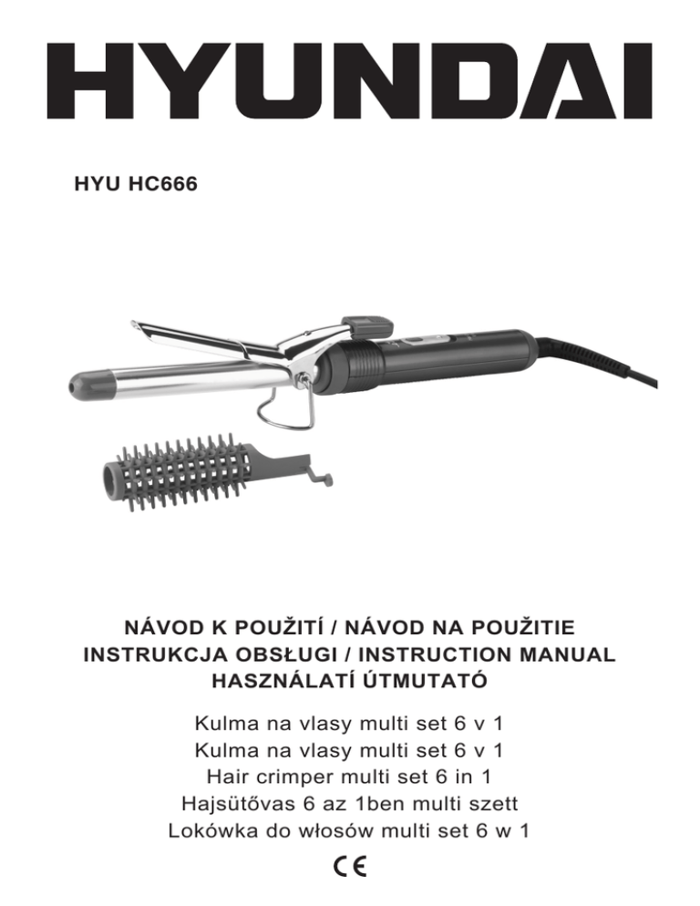 HYU HC666 NÁVOD K POUŽITÍ / NÁVOD NA POUŽITIE INSTRUKCJA OBSŁUGI / INSTRUCTION MANUAL HASZNÁLATÍ ÚTMUTATÓ Kulma na vlasy multi set 6 v 1 Kulma na vlasy multi set 6 v 1 Hair crimper multi set 6 in 1 Hajsütővas 6 az 1ben multi szett Lokówka do włosów multi set 6 w 1 A2 1 A1 A4 A3 A A5 A6 A9 A8 A7-2 2 A7-1 click 2 A10 A11 CZ Teplovzdušný víceúčelový kartáč NÁVOD K OBSLUZE I. BEZPEČNOSTNÍ UPOZORNĚNÍ – Před prvním uvedením do provozu si pečlivě přečtěte návod k obsluze, prohlédněte vyobrazení a návod si uschovejte pro budoucí použití. Instrukce v návodu považujte za součást spotřebiče a postupte je jakémukoli dalšímu uživateli spotřebiče. – Zkontrolujte, zda údaj na typovém štítku odpovídá napětí ve Vaší elektrické zásuvce. Vidlici napájecího přívodu je nutné připojit pouze do zásuvky elektrické instalace, která odpovídá příslušným normám. -- Tento spotřebič mohou používat děti ve věku 8 let a starší a osoby se sníženými fyzickými, smyslovými či mentálními schopnostmi nebo nedostatkem zkušeností a znalostí, pokud jsou pod dozorem nebo byly poučeny o používání spotřebiče bezpečným způsobem a rozumí případným nebezpečím. Děti si se spotřebičem nesmějí hrát. Čištění a údržbu prováděnou uživatelem nesmějí provádět děti, pokud nejsou starší 8 let a pod dozorem. Děti mladší 8 let se musí držet mimo dosah spotřebiče a jeho přívodu. -- Před výměnou příslušenství, před čištěním nebo údržbou, spotřebič vypněte a odpojte od el. sítě vytažením vidlice napájecího přívodu z el. zásuvky! -- Jestliže je napájecí přívod tohoto spotřebiče poškozen, musí být přívod nahrazen výrobcem, jeho servisním technikem nebo podobně kvalifikovanou osobou, aby se tak zabránilo vzniku nebezpečné situace. -- Vždy odpojte spotřebič od napájení, pokud ho necháváte bez dozoru a před montáží, demontáží nebo čištěním. – Spotřebič se nesmí ponořit do vody nebo jiných tekutin a nesmí se používat na místech, kde by mohly spadnout do vany, umyvadla nebo bazénu. Pokud by přesto spotřebič spadl do vody, nevytahujte jej! Nejdříve odpojte vidlici napájecího přívodu z el. zásuvky a až poté spotřebič vyjměte. V takových případech zaneste spotřebič do odborného servisu k prověření jeho bezpečnosti a správné funkce. – Pokud se spotřebič používá v koupelně, je nutné jej odpojit po použití od el. sítě vytažením vidlice napájecího přívodu z el. zásuvky, protože v blízkosti vody představuje nebezpečí i když je žehlička vypnutá. – Pro zabezpečení doplňkové ochrany doporučujeme instalovat do el. obvodu napájení koupelny proudový chránič (RCD) se jmenovitým vybavovacím proudem nepřevyšujícím 30 mA. Požádejte o radu revizního technika, případně elektrikáře. – Nikdy spotřebič nepoužívejte, pokud má poškozený napájecí přívod nebo vidlici, pokud nepracuje správně, upadl na zem a poškodil se nebo spadl do vody. V takových případech zaneste spotřebič do odborného servisu k prověření jeho bezpečnosti a správné funkce. – Spotřebič je určen pouze pro použití v domácnostech a podobné účely! Není konstruován pro použití v kadeřnickém salónu nebo pro jiné komerční použití! 3 CZ – Vidlici napájecího přívodu nezasunujte do el. zásuvky a nevytahujte z el. zásuvky mokrýma rukama a taháním za napájecí přívod! – Žádná část spotřebiče se nesmí dostat do styku s místy citlivými na teplo (např. oči, uši, krk atd.). – Při manipulaci postupujte opatrně, aby nedošlo k poranění (např. popálení, opaření). – Spotřebič nenechávejte v chodu bez dozoru! – Spotřebič neodkládejte na horké tepelné zdroje (např. kamna, sporák, radiátor). – Pokud byl spotřebič skladován při nižších teplotách, nejprve jej aklimatizujte, čímž se zachová mechanická pevnost dílů z plastu. – Spotřebič se nesmí používat na úpravu paruk, příčesků nebo umělých vlasů. – Spotřebič můžete použít na úpravu vlasů přírodních, barvených i odbarvených. Nepoužívejte jej ale na úpravu vlasů, které jsou ošetřeny chemickými prostředky (např. lakem, ztužovadlem atd.), mohlo by dojít ke snížení teplotní účinnosti z důvodu ulpívaní chemických prostředků na destičkách. – Horký spotřebič nepokládejte na měkké a snadno hořlavé povrchy (např. postel, ručníky, povlečení, koberce), mohlo by dojít k poškození těchto věcí od horkých částí spotřebiče. – Při manipulaci se spotřebičem chraňte napájecí přívod před kontaktem s horkým povrchem destiček, případně jinými zdroji tepla. – Ihned po použití spotřebič vypněte, odpojte od el. sítě a nechte vychladnout. Poté je uložte na bezpečné suché místo, mimo dosah dětí. – Pravidelně kontrolujte stav napájecího přívodu spotřebiče. – Zabraňte tomu, aby přívodní kabel volně visel přes hranu pracovní desky, kde by na něho mohly dosáhnout děti. – Napájecí přívod nesmí být poškozen ostrými nebo horkými předměty, otevřeným plamenem, nesmí se ponořit do vody ani ohýbat přes ostré hrany. – V případě potřeby použití prodlužovacího přívodu je nutné, aby nebyl poškozen a vyhovoval platným normám. – Neovíjejte napájecí přívod kolem spotřebiče, prodlouží se tak životnost přívodu. – Spotřebič nikdy nepoužívejte pro žádný jiný účel, než pro který je určen a popsán v tomto návodu! – Výrobce neručí za škody způsobené nesprávným zacházením se spotřebičem (např. požár, popálení, opaření, poškození vlasů atd.) a není odpovědný ze záruky za spotřebič v případě nedodržení výše uvedených bezpečnostních upozornění. II. POPIS SPOTŘEBIČE (obr. 1