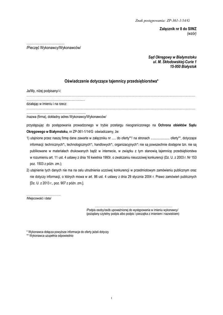 Znak postępowania: ZP-361-1/14/G Załącznik nr 8 do SIWZ (wzór) ………………………........ /Pieczęć Wykonawcy/Wykonawców/ Sąd Okręgowy w Białymstoku ul. M. Skłodowskiej-Curie 1 15-950 Białystok Oświadczenie dotyczące tajemnicy przedsiębiorstwa* Ja/My, niżej podpisany/-i: ………………………………………………………………………………………………………………………………………………… ………………………………………………… działając w imieniu i na rzecz: ………………………………………………………………………………………………………………………………………………… ……………………………………………........ /nazwa (firma), dokładny adres Wykonawcy/Wykonawców/ przystępując do postępowania prowadzonego w trybie przetargu nieograniczonego na Ochrona obiektów Sądu Okręgowego w Białymstoku, nr ZP-361-1/14/G oświadczamy, że: 1) utajnione przez naszą firmę dane zawarte w załączniku nr ..... do oferty**/ na stronach ...................... oferty**, dotyczące informacji: technicznych* , technologicznych* , handlowych* , organizacyjnych* nie są powszechnie dostępne tzn. nie są publikowane w materiałach drukowanych bądź w internecie, w związku z tym stanowią tajemnicę przedsiębiorstwa w rozumieniu art. 11 ust. 4 ustawy z dnia 16 kwietnia 1993r. o zwalczaniu nieuczciwej konkurencji (Dz. U. z 2003 r. Nr 153 poz. 1503 z późn. zm.); 2) utajnienie tych danych nie ma na celu utrudnienia uczciwej konkurencji w przedmiotowym zamówieniu publicznym oraz nie dotyczy informacji, o których mowa w art. 86 ust. 4 ustawy z dnia 29 stycznia 2004 r. Prawo zamówień publicznych [Dz. U. z 2013 r., poz. 907 z późn. zm.]. ………………………………. /Miejscowość i data/ ………………………………………………………………………… /Podpis osoby/osób upoważnionej do występowania w imieniu wykonawcy/ (pożądany czytelny podpis albo podpis i pieczątka z imieniem i nazwiskiem) * Wykonawca dołącza powyższe informacje do oferty jeżeli dotyczy ** Wykonawca uzupełnia odpowiednio 1