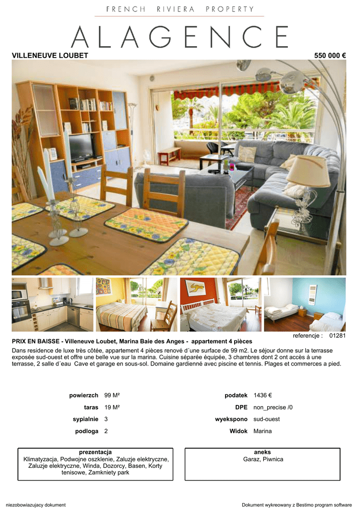 VILLENEUVE LOUBET 550 000 € referencje : 01281 PRIX EN BAISSE - Villeneuve Loubet, Marina Baie des Anges - appartement 4 pièces Dans residence de luxe très côtée, appartement 4 pièces renové d´une surface de 99 m2. Le séjour donne sur la terrasse exposée sud-ouest et offre une belle vue sur la marina. Cuisine séparée équipée, 3 chambres dont 2 ont accès à une terrasse, 2 salle d´eau Cave et garage en sous-sol. Domaine gardienné avec piscine et tennis. Plages et commerces a pied. powierzch 99 M² podatek taras 19 M² DPE sypialnie 3 wyekspono podloga 2 Widok prezentacja Klimatyzacja, Podwojne oszklenie, Zaluzje elektryczne, Zaluzje elektryczne, Winda, Dozorcy, Basen, Korty tenisowe, Zamkniety park niezobowiazujacy dokument 1436 € non_precise /0 sud-ouest Marina aneks Garaz, Piwnica Dokument wykreowany z Bestimo program software