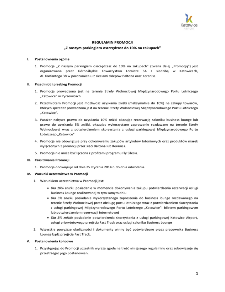 REGULAMIN PROMOCJI „Z naszym parkingiem oszczędzasz do 10% na zakupach” I. Postanowienia ogólne 1. Promocja „Z naszym parkingiem oszczędzasz do 10% na zakupach” (zwana dalej „Promocją”) jest organizowana przez Górnośląskie Towarzystwo Lotnicze SA z siedzibą w Katowicach, Al. Korfantego 38 w porozumieniu z sieciami sklepów Baltona oraz Keraniss. II. Przedmiot i przebieg Promocji 1. Promocja prowadzona jest na terenie Strefy Wolnocłowej Międzynarodowego Portu Lotniczego „Katowice” w Pyrzowicach. 2. Przedmiotem Promocji jest możliwość uzyskania zniżki (maksymalnie do 10%) na zakupy towarów, których sprzedaż prowadzona jest na terenie Strefy Wolnocłowej Międzynarodowego Portu Lotniczego „Katowice”. 3. Pasażer nabywa prawo do uzyskania 10% zniżki okazując rezerwację saloniku business lounge lub prawo do uzyskania 5% zniżki, okazując wykorzystane zaproszenie rozdawane na terenie Strefy Wolnocłowej wraz z potwierdzeniem skorzystania z usługi parkingowej Międzynarodowego Portu Lotniczego „Katowice” 4. Promocja nie obowiązuje przy dokonywaniu zakupów artykułów tytoniowych oraz produktów marek wyłączonych z promocji przez sieci Baltona lub Keraniss. 5. Promocja nie może być łączona z profitami programu Fly Silesia. III. Czas trwania Promocji 1. Promocja obowiązuje od dnia 25 stycznia 2014 r. do dnia odwołania. IV. Warunki uczestnictwa w Promocji 1. Warunkiem uczestnictwa w Promocji jest: Dla 10% zniżki: posiadanie w momencie dokonywania zakupu potwierdzenia rezerwacji usługi Business Lounge realizowanej w tym samym dniu Dla 5% zniżki: posiadanie wykorzystanego zaproszenia do business lounge rozdawanego na terenie Strefy Wolnocłowej przez obsługę portu lotniczego wraz z potwierdzeniem skorzystania z usługi parkingowej Międzynarodowego Portu Lotniczego „Katowice”: biletem parkingowym lub potwierdzeniem rezerwacji internetowej Dla 5% zniżki: posiadanie potwierdzenia skorzystania z usługi parkingowej Katowice Airport, usługi priorytetowego przejścia Fast Track oraz usługi saloniku Business Lounge 2. V. Wszystkie powyższe okoliczności i dokumenty winny być potwierdzone przez pracownika Business Lounge bądź przejścia Fast Track. Postanowienia końcowe 1. Przystępując do Promocji uczestnik wyraża zgodę na treść niniejszego regulaminu oraz zobowiązuje się przestrzegać jego postanowień. 1 2. Niniejszy regulamin jest dostępny na stronie internetowej www.katowice-airport.com w zakładce parkingi 3. Postanowienia niniejszego regulaminu są wyłączną podstawą prowadzenia Promocji, a ich interpretacja powinna być dokonywana zgodnie z powszechnie obowiązującymi przepisami prawa. 4. W sprawach nieuregulowanych w niniejszym regulaminem stosuje się postanowienia Kodeksu Cywilnego. 2