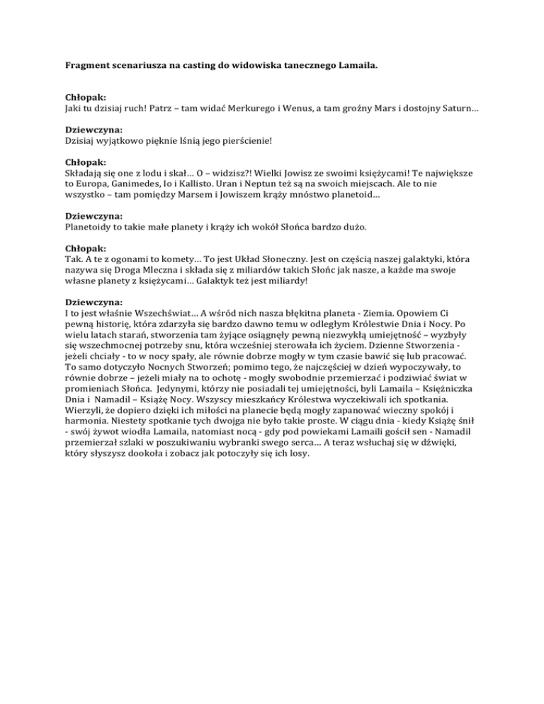 Fragment scenariusza na casting do widowiska tanecznego Lamaila. Chłopak: Jaki tu dzisiaj ruch! Patrz – tam widać Merkurego i Wenus, a tam groźny Mars i dostojny Saturn… Dziewczyna: Dzisiaj wyjątkowo pięknie lśnią jego pierścienie! Chłopak: Składają się one z lodu i skał… O – widzisz?! Wielki Jowisz ze swoimi księżycami! Te największe to Europa, Ganimedes, Io i Kallisto. Uran i Neptun też są na swoich miejscach. Ale to nie wszystko – tam pomiędzy Marsem i Jowiszem krąży mnóstwo planetoid… Dziewczyna: Planetoidy to takie małe planety i krąży ich wokół Słońca bardzo dużo. Chłopak: Tak. A te z ogonami to komety… To jest Układ Słoneczny. Jest on częścią naszej galaktyki, która nazywa się Droga Mleczna i składa się z miliardów takich Słońc jak nasze, a każde ma swoje własne planety z księżycami… Galaktyk też jest miliardy! Dziewczyna: I to jest właśnie Wszechświat… A wśród nich nasza błękitna planeta -‐ Ziemia. Opowiem Ci pewną historię, która zdarzyła się bardzo dawno temu w odległym Królestwie Dnia i Nocy. Po wielu latach starań, stworzenia tam żyjące osiągnęły pewną niezwykłą umiejętność – wyzbyły się wszechmocnej potrzeby snu, która wcześniej sterowała ich życiem. Dzienne Stworzenia -‐ jeżeli chciały -‐ to w nocy spały, ale równie dobrze mogły w tym czasie bawić się lub pracować. To samo dotyczyło Nocnych Stworzeń; pomimo tego, że najczęściej w dzień wypoczywały, to równie dobrze – jeżeli miały na to ochotę -‐ mogły swobodnie przemierzać i podziwiać świat w promieniach Słońca. Jedynymi, którzy nie posiadali tej umiejętności, byli Lamaila – Księżniczka Dnia i Namadil – Książę Nocy. Wszyscy mieszkańcy Królestwa wyczekiwali ich spotkania. Wierzyli, że dopiero dzięki ich miłości na planecie będą mogły zapanować wieczny spokój i harmonia. Niestety spotkanie tych dwojga nie było takie proste. W ciągu dnia -‐ kiedy Książę śnił -‐ swój żywot wiodła Lamaila, natomiast nocą -‐ gdy pod powiekami Lamaili gościł sen -‐ Namadil przemierzał szlaki w poszukiwaniu wybranki swego serca… A teraz wsłuchaj się w dźwięki, który słyszysz dookoła i zobacz jak potoczyły się ich losy.