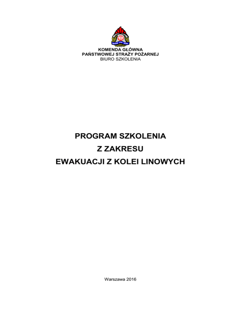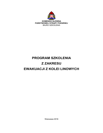 KOMENDA GŁÓWNA PAŃSTWOWEJ STRAŻY POŻARNEJ BIURO SZKOLENIA PROGRAM SZKOLENIA Z ZAKRESU EWAKUACJI Z KOLEI LINOWYCH Warszawa 2016 Opracowanie merytoryczne: − st. asp. w st. spocz. Janusz Rutka, − bryg. mgr inż. Tomasz Traciłowski – SA PSP w Krakowie. Konsultacje merytoryczne: − st. kpt. mgr inż. Grzegorz Kozioł – KM PSP m. st. Warszawy, − mł. kpt. inż. Artur Żera – KM PSP w Krakowie, − szkoły i komendy wojewódzkie Państwowej Straży Pożarnej, − KCKRiOL KG PSP. Konsultacje metodyczne: − mgr Magdalena Stajszczak – KG PSP. 2 Spis treści I. Założenia dydaktyczno-wychowawcze strona 4 1. Cel szkolenia 4 2. Sylwetka absolwenta 4 3. Warunki przyjęcia na szkolenie 4 II. Realizacja procesu dydaktycznego 5 1. Organizacja szkolenia 5 2. Zalecenia i wskazówki metodyczne 5 3. Plan nauczania 7 III. Treści kształcenia 8 1. Ewakuacja podczas awaryjnego zatrzymania kolei – zakres działań i obowiązujące przepisy w tym zakresie 2. Taktyka działań podczas ewakuacji z kolei linowych 8 9 3. Techniki dotarcia do poszkodowanych na kolei linowej 10 4. Techniki ratownicze i ewakuacyjne z kolei linowych 11 IV. Literatura 12 V. Załączniki 13 3 Warszawa, dnia grudnia 2016 r. I. ZAŁOŻENIA DYDAKTYCZNO-WYCHOWAWCZE 1. Cel szkolenia Celem szkolenia jest przygotowanie ratownika do wykonywania zadań ratownictwa wysokościowego w zakresie podstawowym podczas awaryjnego zatrzymania kolei linowej. 2. Sylwetka absolwenta Po ukończeniu szkolenia słuchacz powinien: a. w sferze poznawczej: − omawiać zasady bezpieczeństwa podczas wykonywania działań ratowniczych na kolejach linowych, − omawiać techniki ratownicze i ewakuacyjne, − omawiać zasady współpracy w trakcie działań na kolejach linowych, − omawiać zasady doboru sposobu ewakuacji z kolei linowych, b. w sferze praktycznej: − dobierać i przygotowywać do pracy sprzęt ratownictwa wysokościowego do ewakuacji na kolejach linowych, − budować układy do opuszczania, − dobierać techniki ratownicze i ewakuacyjne, − prowadzić działania z zakresu ratownictwa wysokościowego na kolejach linowych, c. w sferze motywacyjnej, mieć ukształtowane postawy: − odpowiedzialności za stan techniczny sprzętu do ewakuacji na kolejach linowych, − odpowiedzialności za bezpieczeństwo swoje, innych ratowników i poszkodowanych. 3. Warunki przyjęcia na szkolenie Warunkiem przyjęcia na szkolenie jest skierowanie, którego wzór określa załącznik nr 1, potwierdzające określone w skierowaniu wymagania. 4 II. REALIZACJA PROCESU DYDAKTYCZNEGO 1. Organizacja szkolenia a. Szkolenie organizowane jest w szkołach Państwowej Straży Pożarnej i w ośrodkach szkolenia w komendach wojewódzkich Państwowej Straży Pożarnej. b. Osobą odpowiedzialną za prawidłową realizację szkolenia (kierownik szkolenia) jest osoba, która ukończyła w ramach działalności wspomagającej nadzoru dydaktycznego warsztaty przygotowujące do realizacji przedmiotowego szkolenia lub instruktor/ starszy instruktor ratownictwa wysokościowego ksrg. c. Do prowadzenia szkoleń uprawnione są osoby, które ukończyły w ramach działalności wspomagającej nadzoru dydaktycznego warsztaty przygotowujące do realizacji przedmiotowego szkolenia, młodsi ratownicy wysokościowi, ratownicy wysokościowi, starsi ratownicy wysokościowi, instruktorzy i starsi instruktorzy ratownictwa wysokościowego KSRG, posiadający odpowiednią wiedzę i doświadczenie w przedmiotowym zakresie. d. Podstawą organizacji procesu dydaktycznego jest plan nauczania. Podstawową formą nauczania jest lekcja, której odpowiada jedna godzina dydaktyczna trwająca 45 minut. Dopuszcza się łączenie dwóch jednostek lekcyjnych. e. Na realizację programu przewidziano 17 godzin dydaktycznych, w tym: − zajęcia dydaktyczne – 16 godzin dydaktycznych, − test końcowy – 1 godzina dydaktyczna. f. Warunkiem ukończenia szkolenia jest zaliczenie wszystkich elementów szkolenia określonych praktycznymi celami szczegółowymi oraz zdanie testu końcowego. Test końcowy składa się z 15 zadań zamkniętych, wielokrotnego wyboru z jedną prawidłową odpowiedzią. Test uznaje się za zaliczony, jeśli słuchacz zaznaczył prawidłowe odpowiedzi w minimum 10 zadaniach. g. W razie nie zdania testu końcowego, słuchacz ma prawo do testu poprawkowego w terminie wyznaczonym przez organizatora szkolenia. Do testu poprawkowego bez powtarzania szkolenia można przystąpić tylko raz. h. W razie nie przystąpienia do testu końcowego z uzasadnionej przyczyny, słuchacz może do niego przystąpić w dodatkowym terminie wyznaczonym przez organizatora szkolenia. i. Słuchacz, który spełnił wymogi określone w punkcie f. otrzymuje zaświadczenie o ukończeniu szkolenia, zgodne ze wzorem zawartym w załączniku nr 2. 2. Zalecenia i wskazówki metodyczne a. b. c. d. Lp. 1. 2. 3. 4. Zajęcia teoretyczne powinny być organizowane dla całej grupy słuchaczy. Zajęcia praktyczne należy przeprowadzać z grupą słuchaczy liczącą nie więcej niż 6 słuchaczy na jednego instruktora. W przypadku ćwiczeń z drabiną musi to być grupa licząca dokładnie 6 osób. Dodatkowe wskazówki do realizacji zajęć znajdują się przy poszczególnych tematach. Do realizacji zajęć praktycznych niezbędny jest sprzęt określony w „Programie szkolenia z ratownictwa wysokościowego realizowanego przez KSRG w zakresie podstawowym” oraz niżej wymieniony sprzęt (na każdą 6-osobową grupę): Nazwa sprzętu Rolka do poruszania się po linie trakcyjnej kolei Zabezpieczenie rolki - karabinek MGO wraz z łącznikiem Łącznik wraz z linką amortyzującą z 2 karabinkami MGO Drabina wysuwana co najmniej 10 m z drążkami podporowymi J.m. szt. zestaw zestaw Liczba 2 2 2 szt. 1 5 Prowadzący zajęcia, w trakcie realizacji tematów przewidzianych w planie nauczania, powinni zwracać szczególną uwagę na: – poprawną terminologię, – wykorzystywanie do ćwiczeń tylko sprzętu sprawnego