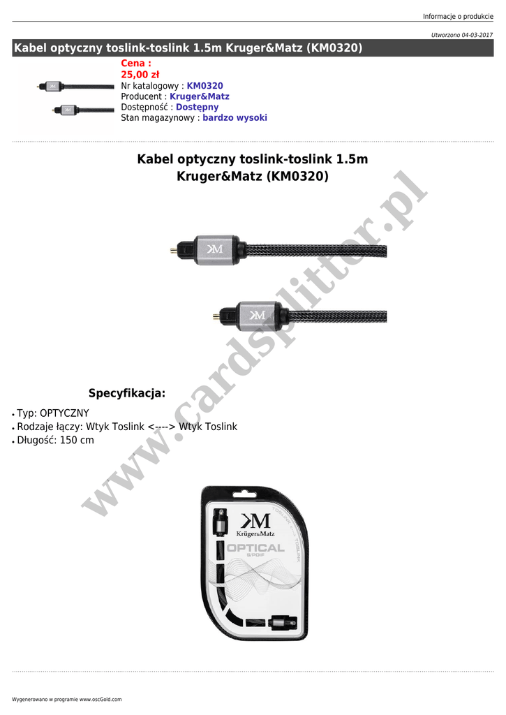 Informacje o produkcie Utworzono 04-03-2017 Kabel optyczny toslink-toslink 1.5m Kruger&Matz (KM0320) Cena : 25,00 zł Nr katalogowy : KM0320 Producent : Kruger&Matz Dostępność : Dostępny Stan magazynowy : bardzo wysoki ar d sp lit te r .p l Kabel optyczny toslink-toslink 1.5m Kruger&Matz (KM0320) Specyfikacja: ● w w ● Typ: OPTYCZNY Rodzaje łączy: Wtyk Toslink <----> Wtyk Toslink Długość: 150 cm w .c ● Wygenerowano w programie www.oscGold.com