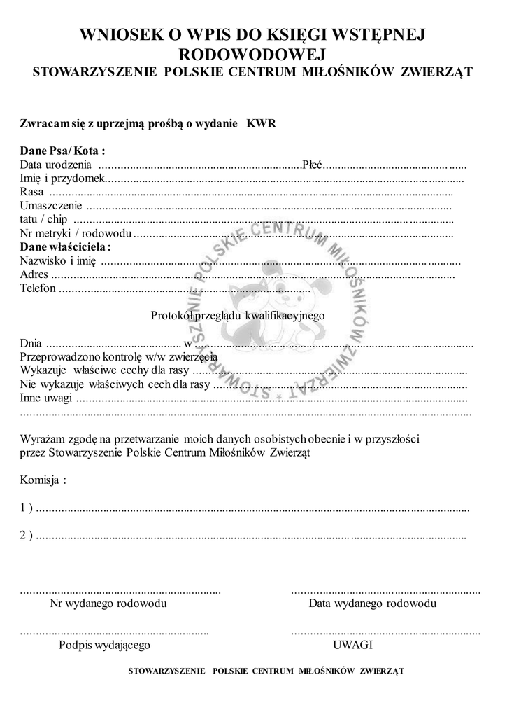 WNIOSEK O WPIS DO KSIĘGI WSTĘPNEJ RODOWODOWEJ STOWARZYSZENIE POLSKIE CENTRUM MIŁOŚNIKÓW ZWIERZĄT Zwracam się z uprzejmą prośbą o wydanie KWR Dane Psa/ Kota : Data urodzenia ....................................................................Płeć.......................................... ...... Imię i przydomek............................................................................................................ ............ Rasa ....................................................................................................................................... Umaszczenie .......................................................................................................................... tatu / chip ................................................................................................................ ............... Nr metryki / rodowodu ........................................................................................................... Dane właściciela : Nazwisko i imię ............................................................................................................. ........... Adres ....................................................................................................................................... Telefon .................................................................................... Protokół przeglądu kwalifikacyjnego Dnia ............................................. w ........................................................................ ..................... Przeprowadzono kontrolę w/w zwierzęcia Wykazuje właściwe cechy dla rasy ............................................................................................ Nie wykazuje właściwych cech dla rasy ..................................................................................... Inne uwagi ................................................................................................................................... ....................................................................................................................................................... Wyrażam zgodę na przetwarzanie moich danych osobistych obecnie i w przyszłości przez Stowarzyszenie Polskie Centrum Miłośników Zwierząt Komisja : 1 ) ................................................................................................................................................. 2 ) ......................................................................................................... ....................................... ................................................................... Nr wydanego rodowodu ............................................................... Data wydanego rodowodu ............................................................... Podpis wydającego ............................................................... UWAGI STOWARZYSZENIE POLSKIE CENTRUM MIŁOŚNIKÓW ZWIERZĄT