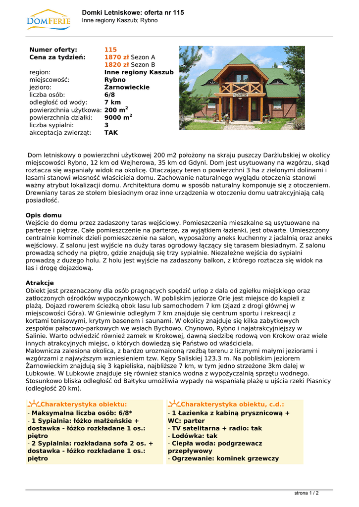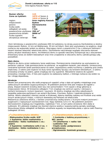 Domki Letniskowe: oferta nr 115 Inne regiony Kaszub; Rybno Numer oferty: Cena za tydzień: 115 1870 zł Sezon A 1820 zł Sezon B region: Inne regiony Kaszub miejscowość: Rybno jezioro: Żarnowieckie liczba osób: 6/8 odległość od wody: 7 km powierzchnia użytkowa: 200 m2 powierzchnia działki: 9000 m2 liczba sypialni: 3 akceptacja zwierząt: TAK Dom letniskowy o powierzchni użytkowej 200 m2 położony na skraju puszczy Darżlubskiej w okolicy miejscowości Rybno, 12 km od Wejherowa, 35 km od Gdyni. Dom jest usytuowany na wzgórzu, skąd roztacza się wspaniały widok na okolicę. Otaczający teren o powierzchni 3 ha z zielonymi dolinami i lasami stanowi własność właściciela domu. Zachowanie naturalnego wyglądu otoczenia stanowi ważny atrybut lokalizacji domu. Architektura domu w sposób naturalny komponuje się z otoczeniem. Drewniany taras ze stołem biesiadnym oraz inne urządzenia w otoczeniu domu uatrakcyjniają całą posiadłość. Opis domu Wejście do domu przez zadaszony taras wejściowy. Pomieszczenia mieszkalne są usytuowane na parterze i piętrze. Całe pomieszczenie na parterze, za wyjątkiem łazienki, jest otwarte. Umieszczony centralnie kominek dzieli pomieszczenie na salon, wyposażony aneks kuchenny z jadalnią oraz aneks wejściowy. Z salonu jest wyjście na duży taras ogrodowy łączący się tarasem biesiadnym. Z salonu prowadzą schody na piętro, gdzie znajdują się trzy sypialnie. Niezależne wejścia do sypialni prowadzą z dużego holu. Z holu jest wyjście na zadaszony balkon, z którego roztacza się widok na las i drogę dojazdową. Atrakcje Obiekt jest przeznaczony dla osób pragnących spędzić urlop z dala od zgiełku miejskiego oraz zatłoczonych ośrodków wypoczynkowych. W pobliskim jeziorze Orle jest miejsce do kąpieli z plażą. Dojazd rowerem ścieżką obok lasu lub samochodem 7 km (zjazd z drogi głównej w miejscowości Góra). W Gniewinie odległym 7 km znajduje się centrum sportu i rekreacji z kortami tenisowymi, krytym basenem i saunami. W okolicy znajduje się kilka zabytkowych zespołów pałacowo-parkowych we wsiach Bychowo, Chynowo, Rybno i najatrakcyjniejszy w Salinie. Warto odwiedzić również zamek w Krokowej, dawną siedzibę rodową von Krokow oraz wiele innych atrakcyjnych miejsc, o których dowiedzą się Państwo od właściciela. Malownicza zalesiona okolica, z bardzo urozmaiconą rzeźbą terenu z licznymi małymi jeziorami i wzgórzami z najwyższym wzniesieniem tzw. Kępy Saliskiej 123.3 m. Na pobliskim jeziorem Żarnowieckim znajdują się 3 kąpieliska, najbliższe 7 km, w tym jedno strzeżone 3km dalej w Lubkowie. W Lubkowie znajduje się również stanica wodna z wypożyczalnią sprzętu wodnego. Stosunkowo bliska odległość od Bałtyku umożliwia wypady na wspaniałą plażę u ujścia rzeki Piasnicy (odległość 20 km). obiektu: Charakterystyka - Maksymalna liczba osób: 6/8* - 1 Sypialnia: łóżko małżeńskie + dostawka - łóżko rozkładane 1 os.: piętro - 2 Sypialnia: rozkładana sofa 2 os. + dostawka - łóżko rozkładane 1 os.: piętro obiektu, c.d.: Charakterystyka - 1 Łazienka z kabiną prysznicową + WC: parter - TV satelitarna + radio: tak - Lodówka: tak - Ciepła woda: podgrzewacz przepływowy - Ogrzewanie: kominek grzewczy strona 1 / 2 Domki Letniskowe: oferta nr 115 Inne regiony Kaszub; Rybno - 3 Sypialnia: wersalka 2 os.: piętro Bielizna pościelowa: płatna Salon z kominkiem: parter Aneks kuchenny z jadalnią: parter Kuchenka: 4 palniki, gaz Czajnik elektryczny: nie Pralka automatyczna: tak - Zwierzęta domowe: tak** Grill przenośny: tak Ognisko na działce: tak Lekarz Wejherowo: 12 km Sklep spożywczy: 1,5 km Stadnina koni w Salinie: 12 km * 8 osób w przypadku wykorzystania dostawek ** teren nie jest ogrodzony CENNIK: Podana poniżej i wyróżniona na pomarańczowo cena jest całkowitą ceną wynajmu domu na 1 tydzień - od soboty do soboty (zawiera w sobie kwotę rezerwacji i zaliczki). Dodatkowo dolicza się podane niżej opłady obowiązkowe i/lub nieobowiązkowe. Sezon A Sezon B TYLKO Weekendy: 25.06. - 20.08.2011. Poza sezonem A 29.04 - 03.05 (4 doby) wynajem za 1 tydzień w tym: 1870 zł/tydz 1820 zł/tydz tylko wynajmy pełnymi tygodniami - rezerwacja 400 zł/tydz 350 zł/tydz --- - zaliczka 300 zł/tydz 300 zł/tydz --- OPŁATY DODATKOWE: 1. Zużycie energii elekt. wg wskazań licznika; koszt 60 gr. za 1 kWh. 2. Sprzątanie domu po zakończeniu turnusu 100 zł jeżeli najemca nie chce sam wykonać tej pracy 3. Drewno do kominka 1 wsad gratis, dodatkowa wiązka 30 zł 4. Każde zwierzę 50 zł/tydzień 5. Bielizna pościelowa 10 zł/osoba/pobyt KAUCJA 300 zł Kaucja, pobierana przez właściciela w momencie przekazania kluczy, jest zwracana najemcy po potrąceniu kwoty opłat dodatkowych oraz ewentualnych uzasadnionych kosztów szkód powstałych z jego winy. strona 2 / 2 Powered by TCPDF (www.tcpdf.org)
