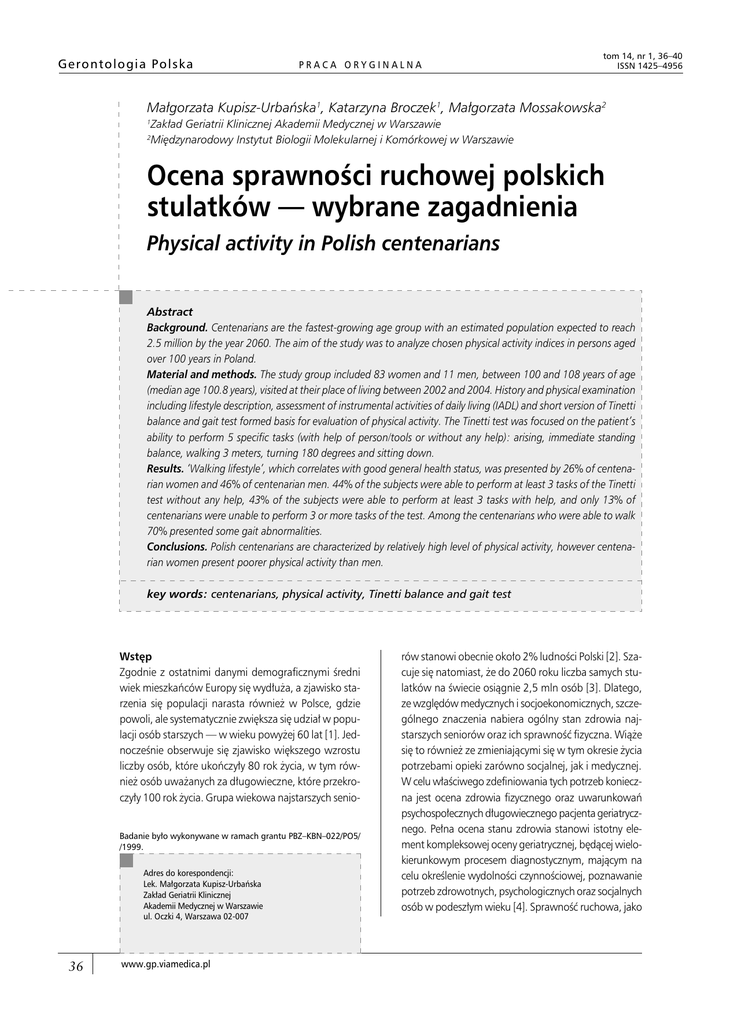 Gerontologia Polska PRACA ORYGINALNA tom 14, nr 1, 36–40 ISSN 1425–4956 Małgorzata Kupisz-Urbańska1, Katarzyna Broczek1, Małgorzata Mossakowska2 1 2 Zakład Geriatrii Klinicznej Akademii Medycznej w Warszawie Międzynarodowy Instytut Biologii Molekularnej i Komórkowej w Warszawie Ocena sprawności ruchowej polskich stulatków — wybrane zagadnienia Physical activity in Polish centenarians Abstract Background. Centenarians are the fastest-growing age group with an estimated population expected to reach 2.5 million by the year 2060. The aim of the study was to analyze chosen physical activity indices in persons aged over 100 years in Poland. Material and methods. The study group included 83 women and 11 men, between 100 and 108 years of age (median age 100.8 years), visited at their place of living between 2002 and 2004. History and physical examination including lifestyle description, assessment of instrumental activities of daily living (IADL) and short version of Tinetti balance and gait test formed basis for evaluation of physical activity. The Tinetti test was focused on the patient’s ability to perform 5 specific tasks (with help of person/tools or without any help): arising, immediate standing balance, walking 3 meters, turning 180 degrees and sitting down. Results. ‘Walking lifestyle’, which correlates with good general health status, was presented by 26% of centenarian women and 46% of centenarian men. 44% of the subjects were able to perform at least 3 tasks of the Tinetti test without any help, 43% of the subjects were able to perform at least 3 tasks with help, and only 13% of centenarians were unable to perform 3 or more tasks of the test. Among the centenarians who were able to walk 70% presented some gait abnormalities. Conclusions. Polish centenarians are characterized by relatively high level of physical activity, however centenarian women present poorer physical activity than men. key words: centenarians, physical activity, Tinetti balance and gait test Wstęp Zgodnie z ostatnimi danymi demograficznymi średni wiek mieszkańców Europy się wydłuża, a zjawisko starzenia się populacji narasta również w Polsce, gdzie powoli, ale systematycznie zwiększa się udział w populacji osób starszych — w wieku powyżej 60 lat [1]. Jednocześnie obserwuje się zjawisko większego wzrostu liczby osób, które ukończyły 80 rok życia, w tym również osób uważanych za długowieczne, które przekroczyły 100 rok życia. Grupa wiekowa najstarszych senio- Badanie było wykonywane w ramach grantu PBZ–KBN–022/PO5/ /1999. Adres do korespondencji: Lek. Małgorzata Kupisz-Urbańska Zakład Geriatrii Klinicznej Akademii Medycznej w Warszawie ul. Oczki 4, Warszawa 02-007 36 www.gp.viamedica.pl rów stanowi obecnie około 2% ludności Polski [2]. Szacuje się natomiast, że do 2060 roku liczba samych stulatków na świecie osiągnie 2,5 mln osób [3]. Dlatego, ze względów medycznych i socjoekonomicznych, szczególnego znaczenia nabiera ogólny stan zdrowia najstarszych seniorów oraz ich sprawność fizyczna. Wiąże się to również ze zmieniającymi się w tym okresie życia potrzebami opieki zarówno socjalnej, jak i medycznej. W celu właściwego zdefiniowania tych potrzeb konieczna jest ocena zdrowia fizycznego oraz uwarunkowań psychospołecznych długowiecznego pacjenta geriatrycznego. Pełna ocena stanu zdrowia stanowi istotny element kompleksowej oceny geriatrycznej, będącej wielokierunkowym procesem diagnostycznym, mającym na celu określenie wydolności czynnościowej, poznawanie potrzeb zdrowotnych, psychologicznych oraz socjalnych osób w podeszłym wieku [4]. Sprawność ruchowa, jako Małgorzata Kupisz-Urbańska, Katarzyna Broczek i wsp., Ocena sprawności ruchowej polskich stulatków jeden z elementów kompleksowej oceny geriatrycznej, ma jednocześnie bezpośredni i pośredni wpływ na zdolność do wykonywania czynności życia codziennego, a tym samym na jakość życia pacjentów. Bezpośrednio wiąże się ona również z liczbą upadków, zaliczanych do „wielkich problemów geriatrycznych”. Natomiast zaburzenia chodu i równowagi, które nasilają się z wiekiem, stanowią istotny czynnik ryzyka upadków. Wymienia się je wśród endogennych przyczyn upadków — podobnie jak choroby oczu, uszu oraz inne choroby przewlekłe wieku podeszłego. Warto również wspomnieć o egzogennych przyczynach upadków, związanych między innymi z warunkami zamieszkania osoby w podeszłym wieku. Upadki zalicza się do „wielkich problemów geriatrycznych”, ponieważ między innymi w ich następstwie populacja ludzi starszych cechuje się największą śmiertelnością oraz niepełnosprawnością [5]. Materiał i metody Celem przeprowadzonego badania była ocena wybranych zagadnień związanych ze sprawnością ruchową, łącznie z opisową oceną chodu wśród najstarszych seniorów w Polsce. Badanie wykonywano w ramach grantu zamawianego przez Komitet Badań Naukowych KBN (obecne Ministerstwo Nauki i Informatyzacji): „Genetyczne i środowiskowe czynniki długowieczności”, koordynowanego przez Międzynarodowy Instytut Biologii Molekularnej i Komórkowej w Warszawie, realizowanego w latach 2002—2004. Grupę badaną stanowiły 94 osoby, w tym 83 kobiety (88%) i 11 mężczyzn (12%). Stosunek kobiet do męż- czyzn w grupie badanej wynosił 7,5:1. Mediana wieku życia kobiet wynosiła 100,8 roku, a najstarsza badana miała 108,2 roku. Natomiast mediana wieku życia mężczyzn wynosiła 100,3 roku, a najstarszy miał 104,3 roku. Mianem „stulatka” w poniżej przedstawionych wynikach badań określano każdą osobę, która ukończyła 100 rok życia. Pełne badanie lekarskie — podmiotowe i przedmiotowe — odbywało się w domach stulatków i obejmowało również wykonanie skali oceny podstawowych i złożonych czynności życia codziennego, skróconej skali Tinettiego, opisowej oceny chodu oraz stosowanych urządzeń pomocniczych używ