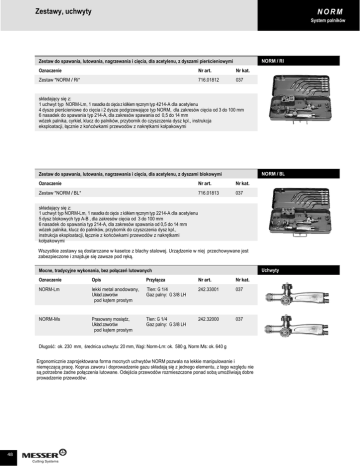 Zestawy, uchwyty NORM System palników NORM / RI Zestaw do spawania, lutowania, nagrzewania i cięcia, dla acetylenu, z dyszami pierścieniowymi Oznaczenie Nr art. Nr kat. Zestaw *NORM / Ri* 716.01812 037 składający się z: 1 uchwyt typ NORM-Lm, 1 nasadka do cięcia z kółkiem ręcznym typ 4214-A dla acetylenu 4 dysze pierścieniowe do cięcia i 2 dysze podgrzewające typ NORM, dla zakresów cięcia od 3 do 100 mm 6 nasadek do spawania typ 214-A, dla zakresów spawania od 0,5 do 14 mm wózek palnika, cyrkiel, klucz do palników, przybornik do czyszczenia dysz kpl., instrukcja eksploatacji, łącznie z końcówkami przewodów z nakrętkami kołpakowymi NORM / BL Zestaw do spawania, lutowania, nagrzewania i cięcia, dla acetylenu, z dyszami blokowymi Oznaczenie Nr art. Nr kat. Zestaw *NORM / BL* 716.01813 037 składający się z: 1 uchwyt typ NORM-Lm, 1 nasadka do cięcia z kółkiem ręcznym typ 2214-A dla acetylenu 5 dysz blokowych typ A-B , dla zakresów cięcia od 3 do 100 mm 6 nasadek do spawania typ 214-A, dla zakresów spawania od 0,5 do 14 mm wózek palnika, klucz do palników, przybornik do czyszczenia dysz kpl., instrukcja eksploatacji, łącznie z końcówkami przewodów z nakrętkami kołpakowymi Wszystkie zestawy są dostarczane w kasetce z blachy stalowej. Urządzenie w niej przechowywane jest zabezpieczone i znajduje się zawsze pod ręką. Uchwyty Mocne, tradycyjne wykonania, bez połączeń lutowanych Oznaczenie Opis Przyłącza Nr art. Nr kat. NORM-Lm lekki metal anodowany, Układ zaworów pod kątem prostym Tlen: G 1/4 Gaz palny: G 3/8 LH 242.33001 037 NORM-Ms Prasowany mosiądz, Układ zaworów pod kątem prostym Tlen: G 1/4 Gaz palny: G 3/8 LH 242.32000 037 Długość: ok. 230 mm, średnica uchwytu: 20 mm, Wagi: Norm-Lm: ok. 580 g, Norm Ms: ok. 640 g Ergonomicznie zaprojektowana forma mocnych uchwytów NORM pozwala na lekkie manipulowanie i niemęczącą pracę. Koprus zaworu i doprowadzenie gazu składają się z jednego elementu, z tego względu nie są potrzebne żadne połączenia lutowane. Odejścia przewodów rozmieszczone ponad sobą umożliwiają dobre prowadzenie przewodów. 48 Nasadki do spawania, lutowania i nagrzewania, nasadki do cięcia NORM System palników Nasadka do spawania 214-A Lm Do zastosowań standardowych, dysze wymienne Nasadki do spawania, lutowania i nagrzewania, zkutymi otworami dysz, gaz palny acetylen Zakres spawania Nr art. Nasadka kpl. Nr art. Dysza do spawania Nr kat. 1 ok. 80 l/h 0,5 - 1,0 mm 716.01641 242.34110 037 / 007 2 ok. 160 l/h 1,0 - 2,0 mm 716.01642 242.34210 037 / 007 3 ok. 315 l/h 2,0 - 4,0 mm 716.01643 242.34310 037 / 007 4 ok. 500 l/h 4,0 - 6,0 mm 716.01644 242.34410 037 / 007 5 ok. 800 l/h 6,0 - 9,0 mm 716.01645 242.34510 037 / 007 6 ok. 1.250 l/h 9,0 - 14,0 mm 716.01646 242.34610 037 / 007 7 ok. 1.800 l/h 14,0 - 20,0 mm 716.01647 242.34710 037 / 007 8 ok. 2.500 l/h 20,0 - 30,0 mm 716.01648 242.34810 037 / 007 NORM Rozmiar Zużycie O2 Nasadka elastyczna do spawania 414-A Lm Elastyczna rura mieszająca z miękkiej miedzi, wymienna Nasadki elastyczne do spawania, lutowania i nagrzewania w trudno dostępnych miejscach, gaz palny acetylen Rozmiar Zużycie O2 Zakres spawania Nr art. Nasadka kpl. Nr art. Dysza do spawania Nr kat. 2 ok. 160 l/h 1,0 - 2,0 mm 716.01732 716.01752 037 / 007 3 ok. 315 l/h 2,0 - 4,0 mm 716.01733 716.01753 037 / 007 4 ok. 500 l/h 4,0 - 6,0 mm 716.01734 716.01754 037 / 007 5 ok. 800 l/h 6,0 - 9,0 mm 716.01735 716.01755 037 / 007 Nasadka do lutowania i nagrzewania FB-A Wylot płomienia powierzchniowy, dysze wymienne, obniżony hałas Nasadki do powierzchniowego lutowania i nagrzewania za pomocą acetylenu, poziom hałasu poniżej 85 dB(A) Rozmiar Zużycie O2 Długość wbudowania ok. Nr art. Nasadka kpl. Nr art. Dysza do nagrzewania Nr kat. 5 1,1 m3/h 275 mm 716.01935 716.00725 004 6 1,7 m3/h 305 mm 716.01936 716.00726 004 7 2,3 m3/h 375 mm 716.01937 716.00727 004 8 3,3 m3/h 405 mm 716.01938 716.00728 004 Nasadki do cięcia Do cięcia ręcznego, gaz palny acetylen Oznaczenie NORM 4214-A z pokrętłem NORM 2214-A z pokrętłem Dla dysz typu Nr art. Nr kat. Dysze pierścieniowo-/ szczelinowe 716.01828 037 Dysze blokowe 716.01829 037 Dysze do cięcia ręcznego do nasadek do cięcia NORM patrz strona 66 Obliczenia zużycia gazu palnego patrz tabela strona 31 49