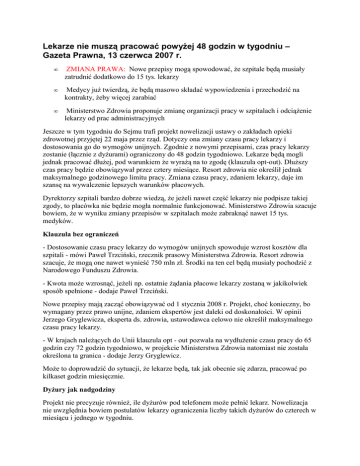 Lekarze nie muszą pracować powyŜej 48 godzin w tygodniu – Gazeta Prawna, 13 czerwca 2007 r. • ZMIANA PRAWA: Nowe przepisy mogą spowodować, Ŝe szpitale będą musiały zatrudnić dodatkowo do 15 tys. lekarzy • Medycy juŜ twierdzą, Ŝe będą masowo składać wypowiedzenia i przechodzić na kontrakty, Ŝeby więcej zarabiać • Ministerstwo Zdrowia proponuje zmianę organizacji pracy w szpitalach i odciąŜenie lekarzy od prac administracyjnych Jeszcze w tym tygodniu do Sejmu trafi projekt nowelizacji ustawy o zakładach opieki zdrowotnej przyjętej 22 maja przez rząd. Dotyczy ona zmiany czasu pracy lekarzy i dostosowania go do wymogów unijnych. Zgodnie z nowymi przepisami, czas pracy lekarzy zostanie (łącznie z dyŜurami) ograniczony do 48 godzin tygodniowo. Lekarze będą mogli jednak pracować dłuŜej, pod warunkiem Ŝe wyraŜą na to zgodę (klauzula opt-out). DłuŜszy czas pracy będzie obowiązywał przez cztery miesiące. Resort zdrowia nie określił jednak maksymalnego godzinowego limitu pracy. Zmiana czasu pracy, zdaniem lekarzy, daje im szansę na wywalczenie lepszych warunków płacowych. Dyrektorzy szpitali bardzo dobrze wiedzą, Ŝe jeŜeli nawet część lekarzy nie podpisze takiej zgody, to placówka nie będzie mogła normalnie funkcjonować. Ministerstwo Zdrowia szacuje bowiem, Ŝe w wyniku zmiany przepisów w szpitalach moŜe zabraknąć nawet 15 tys. medyków. Klauzula bez ograniczeń - Dostosowanie czasu pracy lekarzy do wymogów unijnych spowoduje wzrost kosztów dla szpitali - mówi Paweł Trzciński, rzecznik prasowy Ministerstwa Zdrowia. Resort zdrowia szacuje, Ŝe mogą one nawet wynieść 750 mln zł. Środki na ten cel będą musiały pochodzić z Narodowego Funduszu Zdrowia. - Kwota moŜe wzrosnąć, jeŜeli np. ostatnie Ŝądania płacowe lekarzy zostaną w jakikolwiek sposób spełnione - dodaje Paweł Trzciński. Nowe przepisy mają zacząć obowiązywać od 1 stycznia 2008 r. Projekt, choć konieczny, bo wymagany przez prawo unijne, zdaniem ekspertów jest daleki od doskonałości. W opinii Jerzego Gryglewicza, eksperta ds. zdrowia, ustawodawca celowo nie określił maksymalnego czasu pracy lekarzy. - W krajach naleŜących do Unii klauzula opt - out pozwala na wydłuŜenie czasu pracy do 65 godzin czy 72 godzin tygodniowo, w projekcie Ministerstwa Zdrowia natomiast nie została określona ta granica - dodaje Jerzy Gryglewicz. MoŜe to doprowadzić do sytuacji, Ŝe lekarze będą, tak jak obecnie się zdarza, pracować po kilkaset godzin miesięcznie. DyŜury jak nadgodziny Projekt nie precyzuje równieŜ, ile dyŜurów pod telefonem moŜe pełnić lekarz. Nowelizacja nie uwzględnia bowiem postulatów lekarzy ograniczenia liczby takich dyŜurów do czterech w miesiącu i jednego w tygodniu. - MoŜe to spowodować, Ŝe dyrektor szpitala zobowiąŜe lekarzy do pełnienia 30 dyŜurów pod telefonem, co byłoby naruszeniem prawa unijnego - mówi Krzysztof Bukiel, przewodniczący Ogólnopolskiego Związku Zawodowego Lekarzy. Projekt ustawy o ZOZ ma jednak i zalety. Przede wszystkim spełnia on jeden z głównych postulatów środowiska medycznego, o którego realizację walczono kilka lat. Chodzi o uznanie dyŜurów medycznych za normalny czas pracy, ale lepiej opłacany, bo tak jak za nadgodziny. - RównieŜ czas pracy w ramach klauzuli opt out będzie liczony jak praca w nadgodzinach dodaje Dariusz Marek Sarti, ekspert do spraw medycznych Konfederacji Pracodawców Polskich. Projekt zakłada, Ŝe zgodę na wydłuŜenie czasu pracy lekarze będą podpisywać dobrowolnie. Ustawodawca wprowadził takŜe zakaz dyskryminowania pracowników, którzy nie będą chcieli pracować dłuŜej niŜ 48 godzin w tygodniu. W szpitalach juŜ brakuje specjalistów. JeŜeli więc lekarze nie będą podpisywać klauzul put out, to dyrektorzy szpitali będą musieli szukać lekarzy kontraktowych, którzy mogą pracować bez ograniczeń godzinowych. - JuŜ teraz bez tych lekarzy w wielu placówkach ochrony zdrowia niemoŜliwe byłoby zapewnienie chociaŜby nocnych dyŜurów - mówi Janusz Atłachowicz, dyrektor Szpitala Powiatowego w Rawiczu. - Dodaje, Ŝe stawki, jakie szpital im płaci, są wyŜsze niŜ oferowane zatrudnionym na etatach. As w rękach lekarzy Sytuacja kadrowa szpitali moŜe być jeszcze gorsza, jeŜeli strajkujący obecnie lekarze faktycznie masowo zaczną składać wypowiedzenia z pracy. W podkarpackich szpitalach złoŜyło je juŜ 800 medyków. RównieŜ 209 lekarzy ze szpitali w ŁomŜy i Suwałkach z województwa podlaskiego wypowiedziało umowy o pracę. W ŁomŜy z pracy chce odejść 112 lekarzy na 170 zatrudnionych, w Suwałkach 97, czyli ponad 90 proc. wszystkich zatrudnionych na pełny etat. Umowy o pracę przestaną obowiązywać od września. - Źle się stało, Ŝe prace parlamentarne nad projektem ustawy zaczną się w trakcie protestów w ochronie zdrowia, bo to tylko moŜe jeszcze bardziej zradykalizować stanowisko lekarzy uwaŜa Jerzy Gryglewicz. Dyrektorzy szpitali nie mogą uzupełnić braków kadrowych, np. zatrudniając lekarzy zza wschodniej granicy. Po złoŜeniu oferty pracy przez jeden ze szpitali lekarzom z Ukrainy, zainteresowanie nią wyraziło zaledwie kilku ukraińskich medyków. - NaleŜy raczej pracować nad zmianą organizacji pracy w zakładach opieki zdrowotnej mówi Paweł Trzciński. Jego zdaniem moŜliwe jest zastosowanie w polskich szpitalach brytyjskiego rozwiązania hospital at night. Zgodnie z nim lekarze są zwolnieni z wykonywania czynności niemedycznych. Nie muszą np. wykonywać Ŝadnych prac administracyjnych oraz związanych z ordynacją lekową. W brytyjskich szpitalach zajmują się tym technicy farmacji. - Dzięki temu udało się, z jednej strony, ograniczyć błędy związane z przepisywaniem leków, a z drugiej strony, lekarze nie wypisując recept mogą przyjąć większą liczbę pacjentów dodaje Paweł Trzciński. SZERSZA PERSPEKTYWA - UE W związku z wprowadzeniem 48-godzinnego czas