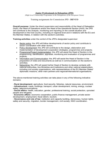 Junior Professionals in Delegation (JPD) (High Level Traineeship Programme in the Delegations of the European Union) Training assignments for Commission JPD - DEVCO Overall purpose: Under the direct supervision and responsibility of the Head of Delegation (HoD), the Head of Operations and/or the Head of the operational Section (HoS), the JPD will contribute to the analysis, monitoring and reporting on the overall situation and development in the host country, including on regional level and in relations with the EU and the Member States, in relation with the section's activities. Training activities under the control of the JPD's designated supervisor: • • • • • Sector policy: the JPD will follow developments of sector policy and contribute to sector coordination with other donors; Policy development: the JPD will contribute to the design, elaboration and implementation of development cooperation strategies, programmes and projects; Programme/Project implementation: the JPD will assist the Head of Section in the programming, identification, appraisal, monitoring and evaluation of programmes and projects; Information and Communication: the JPD will assist the Head of Section in the preparation of notes and documents as well as in communication on the section's activities; Networking: the JPD will assist his/her Head of Section to develop contacts with national authorities, line Ministries and Institutions and other national stakeholders, including civil society organisations, with representatives of the EU Member States' diplomatic missions, other main partners and regional/international organisations. The above-mentioned training activities can take place in any of the following indicative domains: - Rural development: agriculture, food security, fisheries, natural resources, environment; - Infrastructure: roads, buildings, transport, urban development, mining, energy, nuclear safety, telecommunications; - Social affairs: health, education, gender, professional training, social protection, uprooted people and refugees; - Economic affairs: economic cooperation, public finance management, private sector development, employment, fiscal reform, tourism; - Governance and rule of law: institution and capacity building, democracy, human rights, safety and security, migration, border management, civil society, NGO coordination.