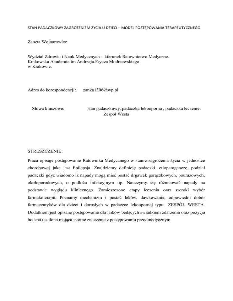 STAN PADACZKOWY ZAGROŻENIEM ŻYCIA U DZIECI – MODEL POSTĘPOWANIA TERAPEUTYCZNEGO. Żaneta Wojnarowicz Wydział Zdrowia i Nauk Medycznych – kierunek Ratownictwo Medyczne. Krakowska Akademia im Andrzeja Frycza Modrzewskiego w Krakowie. Adres do korespondencji: Słowa kluczowe: [email protected] stan padaczkowy, padaczka lekooporna , padaczka leczenie, Zespół Westa STRESZCZENIE: Praca opisuje postępowanie Ratownika Medycznego w stanie zagrożenia życia w jednostce chorobowej jaką jest Epilepsja. Znajdziemy definicję padaczki, etiopatogenezę, podział padaczki gdyż wiadomo iż napady mogą mieć postać drgawek gorączkowych, pourazowych, okołoporodowych, o podłożu infekcyjnym itp. Nauczymy się różnicować napady na podstawie wyglądu klinicznego. Zamieszczono etapy leczenia oraz szeroki wybór farmakoterapii. Poznamy mechanizm i postać leków, dawkowanie, odpowiedni dobór farmaceutyków dla dzieci i dorosłych w padaczce lekoopornej typu ZESPÓŁ WESTA. Dodatkiem jest opisane postępowanie dla laików będących świadkiem zdarzenia oraz pozycja boczna ustalona mająca istotne znaczenie z postępowaniu przedmedycznym. WSTĘP: Stan padaczkowy jest stanem zagrożenia życia wymagającym natychmiastowego przerwania napadów. Definiowany, jako napady padaczkowe nawracające, między którymi nie dochodzi do normalizacji funkcji komórek nerwowych. Cechą charakterystyczną jest brak powrotu świadomości, zaburzona jest także fizjologiczna homeostaza w komórkach mózgowych z aktywnością określaną na 30 min. Obraz kliniczny pozwala wyróżnić wczesny stan padaczkowy trwający do 30 minut oraz jego późną formę rozpoczynającą się po 30 minutach trwania napadów [4,5]. Przedłużający się stan padaczkowy nasila prawdopodobieństwo uszkodzenia neuronów prowadzące zazwyczaj do nieodwracalnych uszkodzeń mózgu. Kluczową rolę w przebiegu neurodegeneracji odgrywają jony wapnia poprzez uruchamianie reakcji biologicznych prowadzących do śmierci komórek [ 6]. Wśród przyczyn wystąpienia stanu padaczkowego należy wymienić: ostre incydenty mózgowe: niedotlenienie, zaburzenia metaboliczne, urazy głowy, neuroinfekcje, zatrucia lekami, zaostrzenie napadów padaczkowych obserwowane najczęściej po gwałtownym odstawieniu leków przeciwpadaczkowych, pierwszy incydent napadu zwiastujący padaczkę [6 ]. OBRAZ KLINICZNY: Klasyfikacja napadów: Napady częściowe: częściowe proste, ruchowe, czuciowe, wegetatywne, psychiczne Napady uogólnione: uogólnione toniczno-kloniczne, toniczne, kloniczne, miokloniczne, atoniczne, Zespół Westa Napady niesklasyfikowane Według mnie co chodzi o padaczkę i zespoły padaczkowe uogólnione najciekawszym jest zespół Westa . Zespół Westa czyli epilepsja z napadami zgięciowymi dotyczy niemowląt, szczyt zachorowania między trzecim a siódmym miesiącem życia. Zespół ten składa się z triady symptomów: kurcze dziecięce, zahamowanie rozwoju psychomotorycznego, hipsarytmia w zapisie EKG. Wyróżnia się typy zginania, prostowana ciała z przywiedzeniem kończyn górnych tzw: drgawki scyzorykowe. Drgawki toniczno-kloniczne. Etiologia choroby nie jest do końca znana, podejrzenia i domysły padają na wady rozwojowe płaszcza mózgowego, zaburzenia genetyczne, infekcje wewnątrzmaciczne. ZASADY UDZIELANIA PRZEDMEDYCZNEJ POMOCY: Zadaniem osoby, która jest świadkiem napadu padaczkowego u poszkodowanego jest zabezpieczenie chorego przed urazem poprzez usunięcie z jego otoczenia przedmiotów takich jak kije, krzesła, kamienie i itd., zdjąć okulary jeżeli chory nosi oraz trzeba go ewakuować w bezpieczne miejsce. Aby ustrzec poszkodowanego przed urazem języka, można podjąć próbę włożenia mu pomiędzy zęby zrolowany bandaż, natomiast aby uchronić przed urazem głowy należy podłożyć pod głowę koc, bluzę lub inną miękką rzecz którą posiadamy. Jeżeli zaobserwujemy ustąpienie napadu epilepsji z utrzymującą się utratą przytomności należy ułożyć pacjenta w pozycji bocznej ustalonej aby zapewnić drożność dróg oddechowych i jednocześnie zapobiec możliwemu zachłyśnięciu treścią pokarmową. Świadek zdarzenia powinien jak najszybciej wezwać pogotowie ratunkowe wybierając numer telefonu 999 lub 112. Pod żadnym pozorem nie można na siłę unieruchamiać kończyn poszkodowanego w trakcie napadu drgawek. Zagraża to urazom pacjenta oraz osobie udzielającej pomocy. Należy pamiętać iż nie wolno wkładać do jamy ustnej żadnych twardych narzędzi, sztućców oraz innych przedmiotów, grozi to wyłamaniem zębów oraz zachłyśnięciem. http://chocianow.osp.org.pl/images/2013/4/bezpieczna.jpg ZASADY MEDYCZNEGO POSTĘPOWANIA PRZEDSZPITALNEGO: Leczenie padaczki w początkowym stadium zaczyna się od monoterapii lekiem tj: lek pierwszego rzutu Kwas Walproinowy bądź Karbamazepina. Efekt terapeutyczny zależy od kombinacji dawek zaczynając od najmniejszej bądź na zmianie leków kończywszy na politerapii. U około 30% pacjentów pomimo zastosowania prawidłowego leczenia farmakologicznego nadal utrzymują się napady padaczkowe. W większości z nim rozpoznaję się padaczkę oporną na leki. Etap pierwszy leczenia: założenie wkłucia, pobranie krwi do badań szybkie podanie leku przeciwpadaczkowego (wkłucia nie można przepłukiwać roztworem glukozy ponieważ może doprowadzić do wytrącenia substancji czynnej leku w szczególności fenytoiny) monitorowanie układu oddechowego i krążenia W przypadku hipoglikemii u dorosłych podać w bolusie 50ml 50% Glukozy, u dzieci 2ml/kg m.c 25% Glukozy, natomiast u alkoholików rozważyć podaż 100mg Tiaminy i.v W razie gorączki zaleca się chłodzenie skóry Farmakoterapia: Diazepam- 0,3-0,5 mg/kg m.c w ciągu 2 min ( I dawka). U dzieci 5-10-15mg z pkędkością 12mg/min. Gdy drgawki nie ustępują w ciągu 5 min należy podać II dawkę. Działanie Diazepamu utrzymuje się do 30 min. Lorazepam- dorośli 0,05-0,1mg/kg m.c w ciągu 2