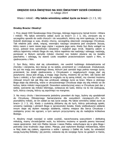ORĘDZIE OJCA ŚWIĘTEGO NA XXII ŚWIATOWY DZIEŃ CHOREGO 11 lutego 2014 Wiara i miłość: «My także winniśmy oddać życie za braci» (1 J 3, 16) Drodzy Bracia i Siostry! 1. Przy okazji XXII Światowego Dnia Chorego, którego tegoroczny temat brzmi: «Wiara i miłość: ’My także winniśmy oddać życie za braci’» (1 J 3, 16), zwracam się w szczególny sposób do osób chorych i do wszystkich, którzy się nimi opiekują i je leczą. Kościół dostrzega w was, drodzy chorzy, szczególną obecność cierpiącego Chrystusa. Tak właśnie jest: obok, więcej, wewnątrz naszego cierpienia jest cierpienie Jezusa, który razem z nami niesie jego ciężar i wyjawia jego sens. Kiedy Syn Boży wstąpił na krzyż, położył kres samotności cierpienia i rozjaśnił jego mrok. Stajemy zatem w obliczu tajemnicy miłości Boga do nas, która napełnia nas nadzieją i odwagą: nadzieją, ponieważ w Bożym zamyśle miłości również noc boleści otwiera się na światło paschalne; i odwagą, by stawić czoło wszelkim przeciwnościom razem z Nim, w zjednoczeniu z Nim. 2. Syn Boży, który stał się człowiekiem, nie uwolnił ludzkiego doświadczenia od choroby i cierpienia, lecz biorąc je na siebie, przemienił je i zredukował. Zredukował, bo już nie mają one ostatniego słowa, którym jest zamiast tego pełnia nowego życia; przemienił, bo dzięki zjednoczeniu z Chrystusem z negatywnych mogą stać się pozytywne. Jezus jest drogą, a mając Jego Ducha, możemy iść za Nim. Jak Ojciec dał Syna z miłości, a Syn oddał siebie ze względu na tę samą miłość, my również możemy miłować innych tak jak Bóg nas umiłował, oddając życie za braci. Wiara w dobrego Boga staje się dobrocią, wiara w ukrzyżowanego Chrystusa staje się siłą miłości aż do końca, także miłości nieprzyjaciół. Dowodem autentycznej wiary w Chrystusa jest dar z siebie, szerzenie się miłości bliźniego, zwłaszcza do ludzi, którzy na to nie zasługują, tych, którzy cierpią, którzy są zepchnięci na margines. 3. Na mocy chrztu i bierzmowania jesteśmy powołani do tego, byśmy się upodabniali do Chrystusa, Miłosiernego Samarytanina dla wszystkich cierpiących.«Po tym poznaliśmy miłość, że On oddał za nas życie swoje. My także winniśmy oddać życie za braci» (1 J 3, 16). Kiedy z czułością zbliżamy się do tych, którzy potrzebują opieki, wnosimy nadzieję i uśmiech Boga w sprzeczności świata. Kiedy wielkoduszne oddanie innym staje się stylem naszego działania, robimy miejsce dla Serca Chrystusa i zostajemy przez nie ogrzani, a tym samym przyczyniamy się do nadejścia królestwa Bożego. 4. Abyśmy mogli rozwijać w sobie czułość, nacechowaną szacunkiem i delikatną miłością, mamy chrześcijański wzór, ku któremu możemy w sposób pewny kierować nasze spojrzenie. Jest nim Matka Jezusa i nasza Matka, wsłuchująca się w głos Boga i potrzeby oraz trudności Jego dzieci. Maryja, pod wpływem Bożego miłosierdzia, które w Niej stało się ciałem, zapomina o sobie i spieszy z Galilei do Judei, by odwiedzić swoją kuzynkę Elżbietę i jej pomóc; wstawia się do swojego Syna na godach w Kanie, kiedy widzi, że kończy się weselne wino; nosi w swoim sercu przez całą pielgrzymkę życia słowa starca Symeona, przepowiadające, że Jej serce przeszyje miecz, i niewzruszenie stoi pod krzyżem Jezusa. Ona wie, jak idzie się tą drogą, i dlatego jest Matką wszystkich chorych i cierpiących. Możemy ufnie uciekać się do Niej z synowskim oddaniem, pewni, że weźmie nas w opiekę, wesprze i nie opuści. To Matka Ukrzyżowanego Zmartwychwstałego: stoi przy naszych krzyżach i towarzyszy nam w drodze do zmartwychwstania i pełnego życia. 5. Św. Jan, uczeń, który stał pod krzyżem z Maryją, prowadzi nas do źródeł wiary i miłości, do serca Boga, który «jest miłością» (1 J 4, 8. 16), i przypomina nam, że nie możemy kochać Boga, jeśli nie kochamy braci. Ten, kto stoi pod krzyżem z Maryją, uczy się kochać jak Jezus. Krzyż «daje pewność wiernej miłości Boga do nas.Miłości tak wielkiej, że wchodzi w nasz grzech i go przebacza, wchodzi w nasze cierpienie i daje nam siłę, aby je znosić, wchodzi także w śmierć, aby ją zwyciężyć i nas zbawić. (...) Krzyż Chrystusa zachęca także, abyśmy dali się zarazić tą miłością, uczy nas zatem patrzeć na bliźniego zawsze z miłosierdziem i miłością, zwłaszcza na tych, którzy cierpią, którzy potrzebują pomocy» (Droga Krzyżowa z młodzieżą, Rio de Janeiro, 26 lipca 2013 r.) Zawierzam ten XXII Światowy Dzień Chorego wstawiennictwu Maryi, aby pomagała osobom chorym przeżywać swoje cierpienie w jedności z Jezusem Chrystusem i by wspierała tych, którzy się nimi opiekują. Wszystkim, chorym, pracownikom służby zdrowia i wolontariuszom, z serca udzielam Apostolskiego Błogosławieństwa. Watykan, 6 grudnia 2013 roku FRANCISZEK