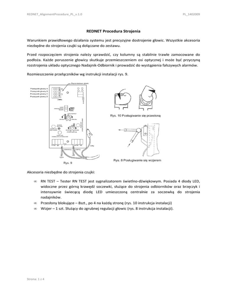REDNET_AlignmentProcedure_PL_v.1.0 PL_1402009 REDNET Procedura Strojenia Warunkiem prawidłowego działania systemu jest precyzyjne dostrojenie głowic. Wszystkie akcesoria niezbędne do strojenia czujki są dołączane do zestawu. Przed rozpoczęciem strojenia należy sprawdzić, czy kolumny są stabilnie trawle zamocowane do podłoża. Każde poruszenie głowicy skutkuje przemieszczeniem osi optycznej i może być przyczyną rozstrojenia układu optycznego Nadajnik-Odbiornik i prowadzić do wystąpienia fałszywych alarmów. Rozmieszczenie przełączników wg instrukcji instalacji rys. 9. Akcesoria niezbędne do strojenia czujki: • • • RN TEST – Tester RN TEST jest sygnalizatorem świetlno-dźwiękowym. Posiada 4 diody LED, widoczne przez górną krawędź soczewki, służące do strojenia odbiorników oraz brzęczyk i intensywnie świecącą diodę LED umieszczoną centralnie za soczewką do strojenia nadajników. Przesłony blokujące – 8szt., po 4 na każdą stronę (rys. 10 instrukcja instalacji) Wizjer – 1 szt. Służący do zgrubnej regulacji głowic (rys. 8 instrukcja instalacji). Strona: 1 z 4 REDNET_AlignmentProcedure_PL_v.1.0 PL_1402009 STROJENIE Z WYKORZYSTANIEM TESTERA RN TEST Kolumna Nadajników Krok 1. Zamontuj wizjer kolejno w gniazdach głowic nadajników (Rys. 8) i skieruj wszystkie głowice nadajników na środek kolumny odbiornika. Dokręć lekko śruby zabezpieczające głowice. Krok 2. Zamontuj płytki blokujące w położeniu otwartym na każdej z głowic nadajnika oraz przełącz przełączniki DIP głowic A,B i C w prawo (wyłączone wszystkie głowice nadajnika poza głowicą C, drugą od dołu). A B C D Kolumna Odbiorników Krok 3. Zamontuj wizjer kolejno w gniazdach głowic odbiorników (Rys. 8) i skieruj wszystkie głowice odbiorników na środek kolumny nadajnika. Dokręć lekko śruby zabezpieczające głowice. Krok 4. Zamontuj płytki blokujące w położeniu otwartym na każdej z głowic odbiornika oraz przełącz przełączniki DIP głowic A,B i C w prawo (wyłączone wszystkie głowice odbiornika poza głowicą C, drugą od dołu). A B C D Single Dual Sprawdź czy przełącznik trybu pracy czujki jest w położeniu górnym Krok 5. Włącz RN TEST do obwodu zasilania, podłącz do złącza testowego (krokodylek) i przełącz go w tryb brzęczka (przełącznik RN TEST w górę). RN TEST zamontuj ponad najwyższą głowicą odbiornika oraz przy pomocy wizjera nakieruj na środek kolumny nadajników. Zablokuj położenie RN TEST przy pomocy śrub. Wyreguluj położenie głowicy C (druga od dołu) do uzyskania maksymalnej częstotliwości impulsów brzęczka, przysłaniając stopniowo soczewkę tak, aby uzyskać położenie w którym jakakolwiek zmiana położenia głowicy powoduje pogorszenie odczytów. Ustabilizuj głowicę przy pomocy śrub blokujących. Po zakończeniu regulacji otwórz przysłonę głowicy C. Kolumna Nadajników Krok 6. Wyreguluj głowicę C w nadajniku do uzyskania maksymalnej częstotliwości impulsów brzęczka / błysków diody LED na RN TEST, przysłaniając stopniowo soczewkę tak, aby uzyskać położenie w którym jakakolwiek zmiana położenia głowicy spowoduje pogorszenie odczytów. Ustabilizuj głowicę przy pomocy śrub blokujących. Pozostaw przesłonę głowicy w ostatnim położeniu. Strona: 2 z 4 REDNET_AlignmentProcedure_PL_v.1.0 PL_1402009 Krok 7. Wykonaj strojenie pozostałych głowic nadawczych wg procedury z punktu 6, przełączając odpowiednie przełączniki DIP dla głowic A, B i D. A B C D A B C D A B C D Porównaj uzyskane przesłonięcia głowic. Jeśli przesłonięcia nie są równomierne, powtórz stronienie wg punktu 6 do uzyskania zadowalających efektów. Krok 8. Usuń przesłony i włącz wszystkie głowice (wszystkie przełączniki DIP w lewo). A B C D Przesłony usuwaj delikatnie, żeby nie zepsuć pozycjonowania głowicy. (Można zaznaczyć markerem położenie głowic, co ułatwia ponowną kalibrację.) Kolumna Odbiorników Krok 9. Przełącz RN TEST w tryb impulsowy (przełącznik w dół). Zmień położenie RN TEST tak by dokładnie widzieć jego soczewkę. Krok 10. Wyreguluj położenie głowicy C (druga od dołu) do uzyskania stabilnego świecenia wszystkich 4-rech diod LED, przysłaniając stopniowo soczewkę tak, aby uzyskać położenie w którym jakakolwiek zmiana położenia głowicy powoduje pogorszenie odczytów. Ustabilizuj głowicę przy pomocy śrub blokujących. Pozostaw przysłonę głowicy w ostatnim położeniu. Krok 11. Wykonaj strojenie pozostałych głowic odbiorczych wg procedury z punktu 10, przełączając odpowiednie przełączniki DIP dla głowic A, B i D. A B C D A B C D A B C D Porównaj uzyskane przesłonięcia głowic. Jeśli przesłonięcia nie są równomierne, powtórz stronienie wg punktu 10 do uzyskania zadowalających efektów. Krok 12. Usuń przesłony i włącz wszystkie głowice (wszystkie przełączniki DIP w lewo). A B C D Przesłony usuwaj delikatnie, żeby nie zepsuć pozycjonowania głowicy. (Można zaznaczyć markerem położenie głowic, co ułatwia ponowną kalibrację.) Strona: 3 z 4 REDNET_AlignmentProcedure_PL_v.1.0 PL_1402009 Po zakończeniu strojenia należy koniecznie • • • • SPRAWDZIĆ, CZYWSZYSTKIE PRZEŁĄCZNIKI ODBIORNIKA I NADAJNIKA ZNAJDUJĄ SIĘ W POŁOŻENIU ON (przesunięte w lewo); Sprawdzić działanie czujki wykonując test przejścia przy nadajniku, odbiorniku i w połowie dystansu. Wyregulować czas reakcji czujki na mniejsze obiekty (Slow Response) od 120ms do 1,5s. Regulację reakcji czujki na mgłę zaleca się przeprowadzić po jakimś czasie bazując na wynikach działania czujki w ustawieniach fabrycznych. Uwagi dodatkowe • • • Obsługa głowic wymaga zachowania ostrożności ze względu na zastosowane delikatne elementy optyczne Zamiast używania przełączników po stronie odbiornika, możemy posłużyć się złączami poszczególnych głowic odbiorczych zlokalizowanych przy przełączniku DIP sł