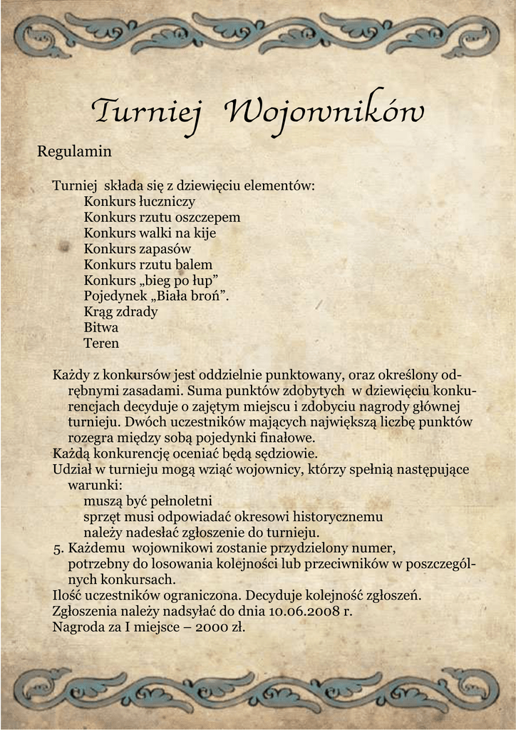 Turniej Wojowników Regulamin Turniej składa się z dziewięciu elementów: Konkurs łuczniczy Konkurs rzutu oszczepem Konkurs walki na kije Konkurs zapasów Konkurs rzutu balem Konkurs „bieg po łup” Pojedynek „Biała broń”. Krąg zdrady Bitwa Teren Każdy z konkursów jest oddzielnie punktowany, oraz określony odrębnymi zasadami. Suma punktów zdobytych w dziewięciu konkurencjach decyduje o zajętym miejscu i zdobyciu nagrody głównej turnieju. Dwóch uczestników mających największą liczbę punktów rozegra między sobą pojedynki finałowe. Każdą konkurencję oceniać będą sędziowie. Udział w turnieju mogą wziąć wojownicy, którzy spełnią następujące warunki: muszą być pełnoletni sprzęt musi odpowiadać okresowi historycznemu należy nadesłać zgłoszenie do turnieju. 5. Każdemu wojownikowi zostanie przydzielony numer, potrzebny do losowania kolejności lub przeciwników w poszczególnych konkursach. Ilość uczestników ograniczona. Decyduje kolejność zgłoszeń. Zgłoszenia należy nadsyłać do dnia 10.06.2008 r. Nagroda za I miejsce – 2000 zł.