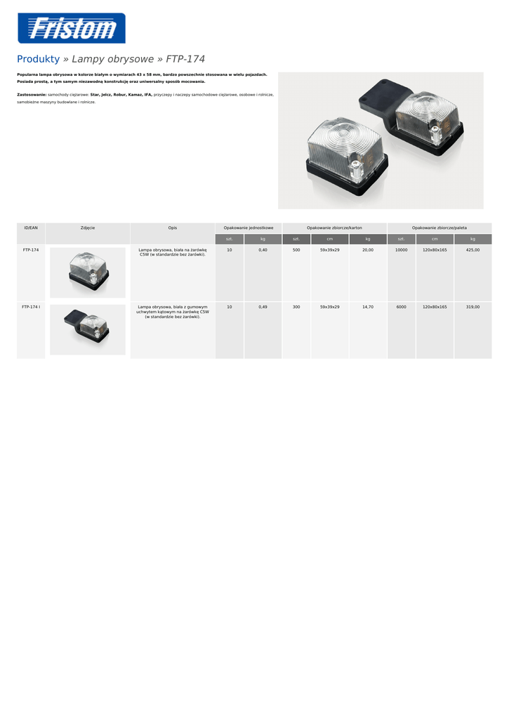 Produkty » Lampy obrysowe » FTP-174 Popularna lampa obrysowa w kolorze białym o wymiarach 43 x 58 mm, bardzo powszechnie stosowana w wielu pojazdach. Posiada prostą, a tym samym niezawodną konstrukcję oraz uniwersalny sposób mocowania. Zastosowanie: samochody ciężarowe: Star, Jelcz, Robur, Kamaz, IFA, przyczepy i naczepy samochodowe ciężarowe, osobowe i rolnicze, samobieżne maszyny budowlane i rolnicze. ID/EAN Zdjęcie Opis Opakowanie jednostkowe Opakowanie zbiorcze/karton Opakowanie zbiorcze/paleta szt. kg szt. cm kg szt. cm kg FTP-174 Lampa obrysowa, biała na żarówkę C5W (w standardzie bez żarówki). 10 0,40 500 59x39x29 20,00 10000 120x80x165 425,00 FTP-174 I Lampa obrysowa, biała z gumowym uchwytem kątowym na żarówkę C5W (w standardzie bez żarówki). 10 0,49 300 59x39x29 14,70 6000 120x80x165 319,00