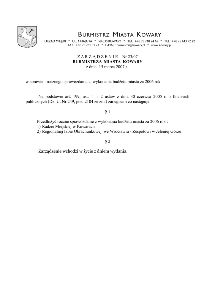 ZARZ Ą DZENIE Nr 23/07 BURMISTRZA MIASTA KOWARY z dnia