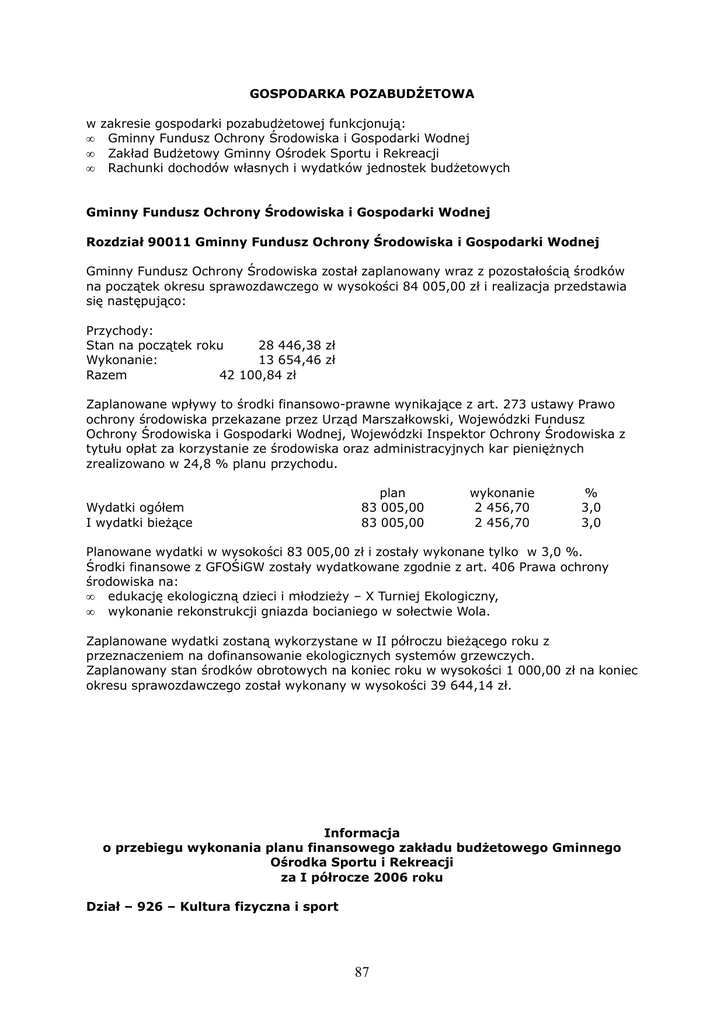 GOSPODARKA POZABUDŻETOWA w • • • zakresie gospodarki pozabudżetowej funkcjonują: Gminny Fundusz Ochrony Środowiska i Gospodarki Wodnej Zakład Budżetowy Gminny Ośrodek Sportu i Rekreacji Rachunki dochodów własnych i wydatków jednostek budżetowych Gminny Fundusz Ochrony Środowiska i Gospodarki Wodnej Rozdział 90011 Gminny Fundusz Ochrony Środowiska i Gospodarki Wodnej Gminny Fundusz Ochrony Środowiska został zaplanowany wraz z pozostałością środków na początek okresu sprawozdawczego w wysokości 84 005,00 zł i realizacja przedstawia się następująco: Przychody: Stan na początek roku 28 446,38 zł Wykonanie: 13 654,46 zł Razem 42 100,84 zł Zaplanowane wpływy to środki finansowo-prawne wynikające z art. 273 ustawy Prawo ochrony środowiska przekazane przez Urząd Marszałkowski, Wojewódzki Fundusz Ochrony Środowiska i Gospodarki Wodnej, Wojewódzki Inspektor Ochrony Środowiska z tytułu opłat za korzystanie ze środowiska oraz administracyjnych kar pieniężnych zrealizowano w 24,8 % planu przychodu. Wydatki ogółem I wydatki bieżące plan 83 005,00 83 005,00 wykonanie 2 456,70 2 456,70 % 3,0 3,0 Planowane wydatki w wysokości 83 005,00 zł i zostały wykonane tylko w 3,0 %. Środki finansowe z GFOŚiGW zostały wydatkowane zgodnie z art. 406 Prawa ochrony środowiska na: • edukację ekologiczną dzieci i młodzieży – X Turniej Ekologiczny, • wykonanie rekonstrukcji gniazda bocianiego w sołectwie Wola. Zaplanowane wydatki zostaną wykorzystane w II półroczu bieżącego roku z przeznaczeniem na dofinansowanie ekologicznych systemów grzewczych. Zaplanowany stan środków obrotowych na koniec roku w wysokości 1 000,00 zł na koniec okresu sprawozdawczego został wykonany w wysokości 39 644,14 zł. Informacja o przebiegu wykonania planu finansowego zakładu budżetowego Gminnego Ośrodka Sportu i Rekreacji za I półrocze 2006 roku Dział – 926 – Kultura fizyczna i sport 87 Rozdział 92604 Instytucje kultury fizycznej Plan finansowy zakładu budżetowego został określony Uchwałą Rady Gminy w wysokości 1 393 962,00 zł Ustalono również plan środków obrotowych na koniec okresu sprawozdawczego zgodnie z § 39 rozporządzenia Ministra Finansów w wysokości 50 000,00 zł Po stronie przychodów planowano i zrealizowano wpływy z następujących tytułów: plan wykonanie % 1. wpływy z usług 686 452,00 348 135,89 50,7 2. otrzymane spadki, zapisy i darowizny w postaci pieniężnej 400,00 3. dotacja przedmiotowa z budżetu otrzymana przez zakład budżetowy 652 510,00 336 225,00 51,5 4. wpływy z różnych dochodów 6 574,41 Planowane przychody w kwocie 1 338 962,00 zł zostały zrealizowane w 51,6 % tj. w kwocie 691 335,30 zł Planowane wydatki w wysokości 1 343 962,00 zł zrealizowano 575 629,07 zł, w tym: plan wydatki ogółem: 1 343 962,00 wydatki bieżące: 1 343 962,00 w tym: wynagrodzenia oraz pochodne od wynagrodzeń: 723 924,00 w 42,8% tj. w kwocie wykonanie 575 629,07 575 629,07 % 42,8 42,8 268 600,16 37,1 W zakresie tych wydatków pokryto wynagrodzenia dla 27 pracowników w liczbie 23,5 etatu, składki na ubezpieczenie społecznie i Fundusz Pracy, koszty umów zleceń. Pozostałe wydatki bieżące plan 620 038,00 wykonanie % 307 028,91 49,5 Pozostałe wydatki w kwocie 307 028,91 zł zostały przeznaczone na pokrycie - bieżących kosztów utrzymania basenu, tj. zakup energii elektrycznej, cieplnej, wody, specjalistycznych środków do uzdatniania wody w nieckach basenowych oraz ich przewóz, zakup środków czystości, wywóz nieczystości oraz konserwację dźwigu, • pozostałych wydatków • obejmujących zakup drobnych materiałów remontowych, biurowych, papieru do kas fiskalnych, oprogramowania antywirusowych NOD 32, zestawu komputerowego oraz drukarki, kart abonamentowych i pasków do transponedrów, ciężarków i taśm do ćwiczeń podczas aerobiku, odzieży ochronnej i obuwia roboczego dla pracowników ośrodka zgodnie z obowiązującymi przepisami, wyposażenia apteczek, zasłonek do przebieralni. Pokryto koszty zakupu nagród rzeczowych w postaci czepków i okularków pływackich, piłek, plecaków, koszulek dla dzieci i młodzieży uczestniczącej w różnorodnych zawodach sportowych, artykułów spożywczych przeznaczonych na poczęstunek dla zawodników oraz pucharów i medali dla zwycięzców min. II Letnich Mistrzostw Gminy Miedźna w Pływaniu, XVII Biegów ulicznych, Turnieju dwójek siatkarskich, Wiosennych Mistrzostwach Gminy Miedźna w Pływaniu, V Halowego Turnieju Piłki Nożnej, VI Gminnej Olimpiady Przedszkolaków, I Integracyjnych Zawodów „Sport dla wszystkich”, Drużynowych zawodów pływackich szkół podstawowych i gimnazjów; pokryto koszty VAT, zajęć sportowo-rekreacyjnych odbywających się w ośrodku, badań kontrolnych dla celów sanitarnoepidemiologicznych, opłat za telefon, korzystanie z Internetu, prowadzenie rachunku bankowego, opłaty licencyjnej za używane programy finansowo – księgowe oraz 88 kadrowo – płacowe, usług informatycznych, usług kominiarskich, zakupu znaczków pocztowych, koszty ubezpieczenia mienia, stacjonarnego sprzętu elektronicznego, szyb oraz odpowiedzialności cywilnej, szkolenia pracowników, przekazanie środków na Fundusz Świadczeń Socjalnych, zwrot kosztów podróży służbowych oraz ryczałt samochodowy dla kierownika. Rachunki dochodów własnych i wydatków jednostek budżetowych Rachunek dochodów własnych został utworzony uchwałą Rady Gminy Nr XXX/243/2005 z dnia 22 marca 2005 r. oraz zarządzeniami Kierowników Jednostek. Dział 801 – Oświata i wychowanie Rozdział 80101 Szkoły podstawowe Szkoła Podstawowa nr 1 im. Bronisława Malinowskiego w Woli Darowizny Dochody: Stan na początek okresu spraw. Wykonanie Razem Wydatki: Wydatki ogółem wydatki bieżące Zaplanowane wpływy to darowizny na przetargowe. plan 0,00 1 000,00 1 000,00 wykonanie 0,25 659,00 659,25 % 65,9 1 000,00 0,00 0,0 1 000,00 0,00 0,0 rzecz placówki or