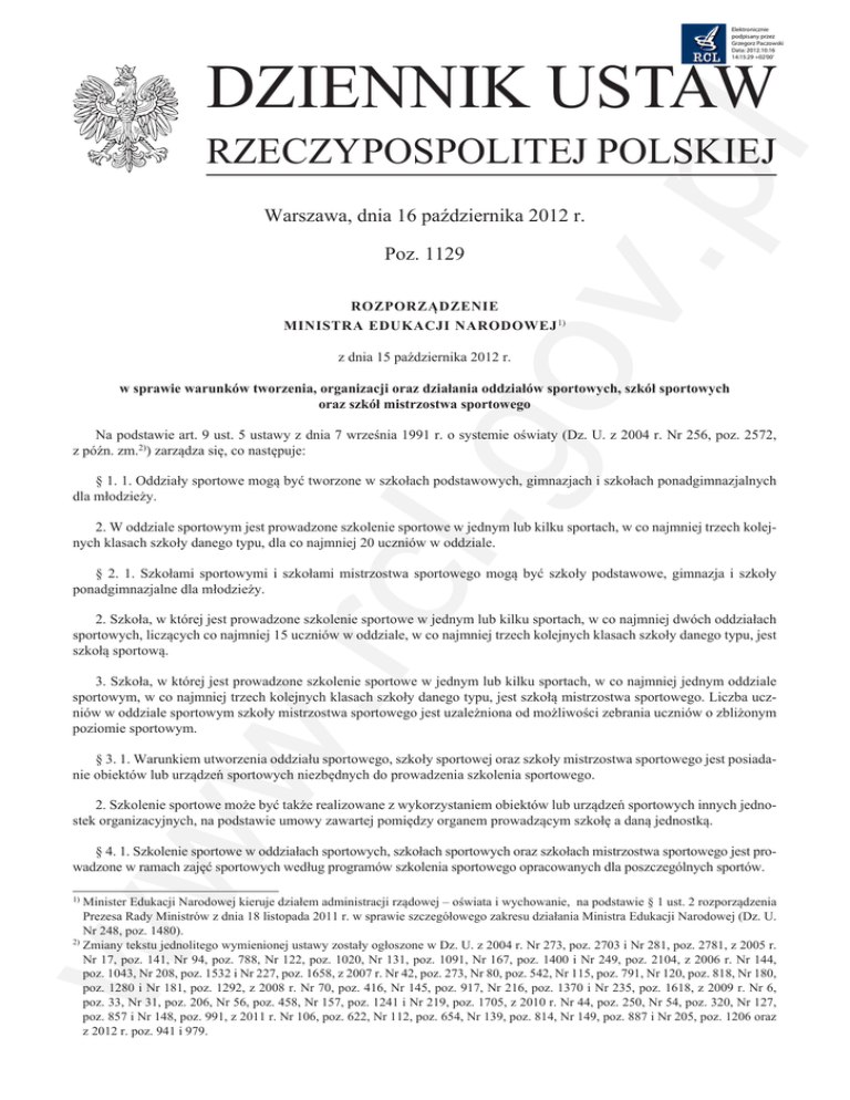 Elektronicznie podpisany przez Grzegorz Paczowski Data: 2012.10.16 14:15:29 +02'00' DZIENNIK USTAW v.p l RZECZYPOSPOLITEJ POLSKIEJ Warszawa, dnia 16 października 2012 r. Poz. 1129 ROZPORZĄDZENIE MINISTRA EDUKACJI NARODOWEJ 1) .go z dnia 15 października 2012 r. w sprawie warunków tworzenia, organizacji oraz działania oddziałów sportowych, szkół sportowych oraz szkół mistrzostwa sportowego Na podstawie art. 9 ust. 5 ustawy z dnia 7 września 1991 r. o systemie oświaty (Dz. U. z 2004 r. Nr 256, poz. 2572, z późn. zm.2)) zarządza się, co następuje: § 1. 1. Oddziały sportowe mogą być tworzone w szkołach podstawowych, gimnazjach i szkołach ponadgimnazjalnych dla młodzieży. w. rcl 2. W oddziale sportowym jest prowadzone szkolenie sportowe w jednym lub kilku sportach, w co najmniej trzech kolejnych klasach szkoły danego typu, dla co najmniej 20 uczniów w oddziale. § 2. 1. Szkołami sportowymi i szkołami mistrzostwa sportowego mogą być szkoły podstawowe, gimnazja i szkoły ponadgimnazjalne dla młodzieży. 2. Szkoła, w której jest prowadzone szkolenie sportowe w jednym lub kilku sportach, w co najmniej dwóch oddziałach sportowych, liczących co najmniej 15 uczniów w oddziale, w co najmniej trzech kolejnych klasach szkoły danego typu, jest szkołą sportową. 3. Szkoła, w której jest prowadzone szkolenie sportowe w jednym lub kilku sportach, w co najmniej jednym oddziale sportowym, w co najmniej trzech kolejnych klasach szkoły danego typu, jest szkołą mistrzostwa sportowego. Liczba uczniów w oddziale sportowym szkoły mistrzostwa sportowego jest uzależniona od możliwości zebrania uczniów o zbliżonym poziomie sportowym. § 3. 1. Warunkiem utworzenia oddziału sportowego, szkoły sportowej oraz szkoły mistrzostwa sportowego jest posiadanie obiektów lub urządzeń sportowych niezbędnych do prowadzenia szkolenia sportowego. ww 2. Szkolenie sportowe może być także realizowane z wykorzystaniem obiektów lub urządzeń sportowych innych jednostek organizacyjnych, na podstawie umowy zawartej pomiędzy organem prowadzącym szkołę a daną jednostką. § 4. 1. Szkolenie sportowe w oddziałach sportowych, szkołach sportowych oraz szkołach mistrzostwa sportowego jest prowadzone w ramach zajęć sportowych według programów szkolenia sportowego opracowanych dla poszczególnych sportów. inister Edukacji Narodowej kieruje działem administracji rządowej – oświata i wychowanie, na podstawie § 1 ust. 2 rozporządzenia M Prezesa Rady Ministrów z dnia 18 listopada 2011 r. w sprawie szczegółowego zakresu działania Ministra Edukacji Narodowej (Dz. U. Nr 248, poz. 1480). 2) Zmiany tekstu jednolitego wymienionej ustawy zostały ogłoszone w Dz. U. z 2004 r. Nr 273, poz. 2703 i Nr 281, poz. 2781, z 2005 r. Nr 17, poz. 141, Nr 94, poz. 788, Nr 122, poz. 1020, Nr 131, poz. 1091, Nr 167, poz. 1400 i Nr 249, poz. 2104, z 2006 r. Nr 144, poz. 1043, Nr 208, poz. 1532 i Nr 227, poz. 1658, z 2007 r. Nr 42, poz. 273, Nr 80, poz. 542, Nr 115, poz. 791, Nr 120, poz. 818, Nr 180, poz. 1280 i Nr 181, poz. 1292, z 2008 r. Nr 70, poz. 416, Nr 145, poz. 917, Nr 216, poz. 1370 i Nr 235, poz. 1618, z 2009 r. Nr 6, poz. 33, Nr 31, poz. 206, Nr 56, poz. 458, Nr 157, poz. 1241 i Nr 219, poz. 1705, z 2010 r. Nr 44, poz. 250, Nr 54, poz. 320, Nr 127, poz. 857 i Nr 148, poz. 991, z 2011 r. Nr 106, poz. 622, Nr 112, poz. 654, Nr 139, poz. 814, Nr 149, poz. 887 i Nr 205, poz. 1206 oraz z 2012 r. poz. 941 i 979. 1) Dziennik Ustaw –2– Poz. 1129 v.p l 2. Oddziały sportowe, szkoły sportowe oraz szkoły mistrzostwa sportowego realizują programy szkolenia sportowego równolegle z programem nauczania uwzględniającym podstawę programową kształcenia ogólnego określoną w przepisach w sprawie podstawy programowej wychowania przedszkolnego oraz kształcenia ogólnego w poszczególnych typach szkół. 3. W ramach programu szkolenia sportowego szkoła organizuje dla uczniów obozy szkoleniowe. § 5. 1. Oddziały sportowe, szkoły sportowe oraz szkoły mistrzostwa sportowego mogą realizować program szkolenia sportowego we współpracy z polskimi związkami sportowymi, klubami sportowymi, stowarzyszeniami prowadzącymi działalność statutową w zakresie kultury fizycznej lub uczelniami prowadzącymi studia wyższe na kierunku związanym z dziedziną nauk o kulturze fizycznej. 2. Współpraca, o której mowa w ust. 1, może dotyczyć w szczególności pomocy szkoleniowej, wzajemnego udostępniania obiektów lub urządzeń sportowych, korzystania z opieki medycznej i zabiegów odnowy biologicznej, prowadzenia badań diagnostycznych, a także tworzenia warunków do uczestnictwa uczniów w zawodach krajowych i międzynarodowych. .go 3. Warunki współpracy, o której mowa w ust. 1, określa umowa zawarta pomiędzy organem prowadzącym szkołę a właściwym polskim związkiem sportowym, klubem sportowym, stowarzyszeniem prowadzącym działalność statutową w zakresie kultury fizycznej lub uczelnią prowadzącą studia wyższe na kierunku związanym z dziedziną nauk o kulturze fizycznej. § 6. 1. W oddziałach sportowych, szkołach sportowych oraz szkołach mistrzostwa sportowego, z zastrzeżeniem ust. 2, realizuje się następujące etapy szkolenia sportowego: 1) ukierunkowany – realizowany w klasach IV–VI szkoły podstawowej i wszystkich klasach gimnazjum, mający na celu ujawnienie predyspozycji i uzdolnień kwalifikujących uczniów do szkolenia w określonym sporcie; 2) specjalistyczny – realizowany w szkołach ponadgimnazjalnych. w. rcl 2. W następujących sportach: pływanie, gimnastyka artystyczna, gimnastyka sportowa, akrobatyka sportowa, łyżwiarstwo figurowe, narciarstwo alpejskie i tenis stołowy, ukierunkowany etap szkolenia sportowego może być realizowany od klasy I szkoły podstawowej, a specjalistyczny – od klasy I gimnazjum. § 7. 1. Obowiązkowy tygodniowy wymiar godzin zajęć sportowych wynosi: 1) w oddziałach sportowych i szkołach sportowych 