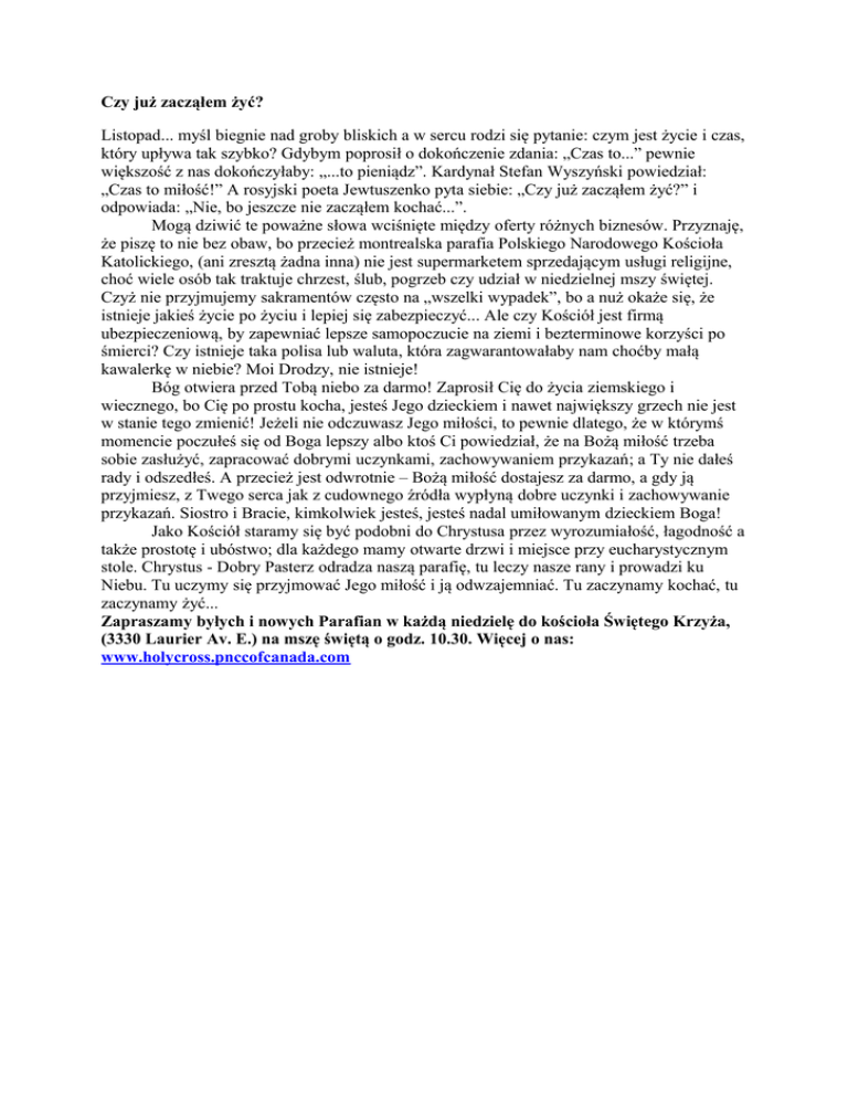 Czy już zacząłem żyć? Listopad... myśl biegnie nad groby bliskich a w sercu rodzi się pytanie: czym jest życie i czas, który upływa tak szybko? Gdybym poprosił o dokończenie zdania: „Czas to...” pewnie większość z nas dokończyłaby: „...to pieniądz”. Kardynał Stefan Wyszyński powiedział: „Czas to miłość!” A rosyjski poeta Jewtuszenko pyta siebie: „Czy już zacząłem żyć?” i odpowiada: „Nie, bo jeszcze nie zacząłem kochać...”. Mogą dziwić te poważne słowa wciśnięte między oferty różnych biznesów. Przyznaję, że piszę to nie bez obaw, bo przecież montrealska parafia Polskiego Narodowego Kościoła Katolickiego, (ani zresztą żadna inna) nie jest supermarketem sprzedającym usługi religijne, choć wiele osób tak traktuje chrzest, ślub, pogrzeb czy udział w niedzielnej mszy świętej. Czyż nie przyjmujemy sakramentów często na „wszelki wypadek”, bo a nuż okaże się, że istnieje jakieś życie po życiu i lepiej się zabezpieczyć... Ale czy Kościół jest firmą ubezpieczeniową, by zapewniać lepsze samopoczucie na ziemi i bezterminowe korzyści po śmierci? Czy istnieje taka polisa lub waluta, która zagwarantowałaby nam choćby małą kawalerkę w niebie? Moi Drodzy, nie istnieje! Bóg otwiera przed Tobą niebo za darmo! Zaprosił Cię do życia ziemskiego i wiecznego, bo Cię po prostu kocha, jesteś Jego dzieckiem i nawet największy grzech nie jest w stanie tego zmienić! Jeżeli nie odczuwasz Jego miłości, to pewnie dlatego, że w którymś momencie poczułeś się od Boga lepszy albo ktoś Ci powiedział, że na Bożą miłość trzeba sobie zasłużyć, zapracować dobrymi uczynkami, zachowywaniem przykazań; a Ty nie dałeś rady i odszedłeś. A przecież jest odwrotnie – Bożą miłość dostajesz za darmo, a gdy ją przyjmiesz, z Twego serca jak z cudownego źródła wypłyną dobre uczynki i zachowywanie przykazań. Siostro i Bracie, kimkolwiek jesteś, jesteś nadal umiłowanym dzieckiem Boga! Jako Kościół staramy się być podobni do Chrystusa przez wyrozumiałość, łagodność a także prostotę i ubóstwo; dla każdego mamy otwarte drzwi i miejsce przy eucharystycznym stole. Chrystus - Dobry Pasterz odradza naszą parafię, tu leczy nasze rany i prowadzi ku Niebu. Tu uczymy się przyjmować Jego miłość i ją odwzajemniać. Tu zaczynamy kochać, tu zaczynamy żyć... Zapraszamy byłych i nowych Parafian w każdą niedzielę do kościoła Świętego Krzyża, (3330 Laurier Av. E.) na mszę świętą o godz. 10.30. Więcej o nas: www.holycross.pnccofcanada.com