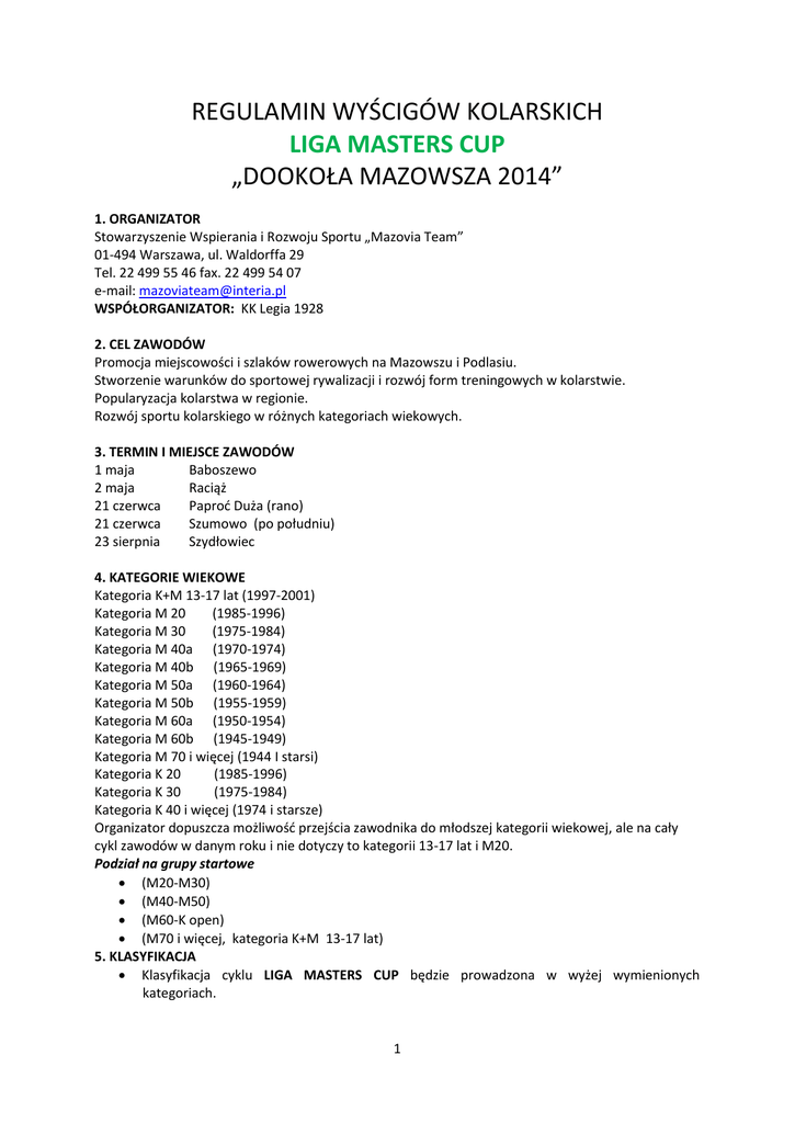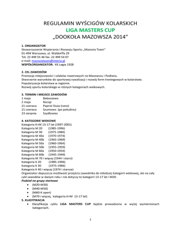 REGULAMIN WYŚCIGÓW KOLARSKICH LIGA MASTERS CUP „DOOKOŁA MAZOWSZA 2014” 1. ORGANIZATOR Stowarzyszenie Wspierania i Rozwoju Sportu „Mazovia Team” 01-494 Warszawa, ul. Waldorffa 29 Tel. 22 499 55 46 fax. 22 499 54 07 e-mail: [email protected] WSPÓŁORGANIZATOR: KK Legia 1928 2. CEL ZAWODÓW Promocja miejscowości i szlaków rowerowych na Mazowszu i Podlasiu. Stworzenie warunków do sportowej rywalizacji i rozwój form treningowych w kolarstwie. Popularyzacja kolarstwa w regionie. Rozwój sportu kolarskiego w różnych kategoriach wiekowych. 3. TERMIN I MIEJSCE ZAWODÓW 1 maja Baboszewo 2 maja Raciąż 21 czerwca Paprod Duża (rano) 21 czerwca Szumowo (po południu) 23 sierpnia Szydłowiec 4. KATEGORIE WIEKOWE Kategoria K+M 13-17 lat (1997-2001) Kategoria M 20 (1985-1996) Kategoria M 30 (1975-1984) Kategoria M 40a (1970-1974) Kategoria M 40b (1965-1969) Kategoria M 50a (1960-1964) Kategoria M 50b (1955-1959) Kategoria M 60a (1950-1954) Kategoria M 60b (1945-1949) Kategoria M 70 i więcej (1944 I starsi) Kategoria K 20 (1985-1996) Kategoria K 30 (1975-1984) Kategoria K 40 i więcej (1974 i starsze) Organizator dopuszcza możliwośd przejścia zawodnika do młodszej kategorii wiekowej, ale na cały cykl zawodów w danym roku i nie dotyczy to kategorii 13-17 lat i M20. Podział na grupy startowe (M20-M30) (M40-M50) (M60-K open) (M70 i więcej, kategoria K+M 13-17 lat) 5. KLASYFIKACJA Klasyfikacja cyklu LIGA MASTERS CUP będzie prowadzona w wyżej wymienionych kategoriach. 1 Zwycięzcami w kategoriach zostają zawodnicy, którzy w najkrótszym czasie pokonają cały dystans wyścigu i nie pominą żadnego punktu kontrolnego. Prowadzona będzie klasyfikacja generalna w poszczególnych kategoriach wiekowych. Klasyfikacja generalna będzie prowadzona według następujących zasad: - klasyfikacja generalna jest klasyfikacją punktową - do klasyfikacji generalnej zaliczane będą 4 najlepsze wyniki punktowe z całego cyklu - punkty będą naliczane za kolejne miejsce na mecie w danej grupie wiekowej według tabeli: 100-80-60-55-50-45-40-35-30-25-20-19-18-17-16-15-14-13-12-11-10-9-8-7-6-5-4-3-2-1 - jest to punktacja do 30 miejsca, dalsze miejsca punktowane są po 1 punkcie. - zwycięzcą zostanie zawodnik, który uzyska największą ilośd punktów. - w wypadku równej ilości punktów decydowad będzie ilośd zwycięstw, a jeśli to nie rozstrzygnie to 2 miejsc, następnie 3 itd. 6. BIURO WYŚCIGU I PROGRAM ZAWODÓW Program zawodów oraz miejsce Biura Zawodów będzie zamieszczony na stronach internetowych: mazovia-team.pl legia-mtbmaraton.pl godlewski-sport.cba.pl kolarstwomasters.pl 7. WARUNKI UCZESTNICTWA LIGA MASTERS CUP to cykl wyścigów szosowych dla wszystkich zarówno posiadających licencje jak i amatorów bez licencji. Uczestnikiem LIGII MASTERS CUP będzie osoba, która spełni następujące warunki: Dokona opłaty startowej i rejestracji w Biurze Zawodów lub dokona wpłaty na konto organizatora: Stowarzyszenie Wspierania i Rozwoju Sportu „Mazovia Tour” nr. konta 42 2030 0045 1110 0000 0161 2750, a zarejestruje się w Biurze Zawodów i pobierze numer startowy ważny na cały cykl Zawodów w 2014 roku. Wypełni formularz zgłoszeniowy. Zawodnicy w przedziale wieku 13-17 lat nie posiadający licencji startują za pisemną zgodą rodziców lub opiekuna prawnego. Każdy zawodnik startuje na własną odpowiedzialnośd. Każdy zawodnik ma obowiązek startu w kasku sztywnym, naruszenie tego warunku spowoduje niedopuszczenie do startu lub dyskwalifikację w czasie wyścigu. Zawodnik wyraża zgodę na przetwarzanie jego danych osobowych przez organizatora, zgodnie z ustawą z dn. 29 sierpnia 1997 roku o ochronie danych osobowych. Odmowa zawodnika na publikację jego wizerunku oznacza rezygnację z udziału w wyścigu Każdy zawodnik ma obowiązek zapoznania się z trasą. Organizator nie zwraca opłaty startowej osobom, które nie ukooczyły wyścigu, bądź nie stawiły się na start, z przyczyn od organizatora niezależnych. Wszelkie interpretacje regulaminu należą do organizatora i sędziego głównego. 8. OPŁATY STARTOWE Za udział w jednym wyścigu: 1. W dniu zawodów w Biurze Zawodów – 40 zł 2. Wpłata na konto organizatora w terminie poprzedzającym zawody – 30 zł Bank BGŻ 42 2030 0045 1110 0000 0161 2750 3. Dla kategorii K+M 13-17 – 20 zł 2 9. ZASADY ROZGRYWANIA WYŚCIGU Podczas wyścigu obowiązują przepisy PZKOL Poszczególne starty będą się odbywały z kilku minutową różnicą czasową. Organizator i sędzia główny dopuszcza możliwośd łączenia grup startowych ze względu na małą frekwencję Wyścigi zostaną przeprowadzone na trasach okrężnych, według załączonych opisów i schematów zamieszczonych na podanych wcześniej stronach internetowych, a także w Biurze Zawodów w dniu wyścigu Wyścig szosowy będzie się odbywad przy częściowo ograniczonym ruchu drogowym na czas przejazdu kolumny wyścigu Trasa wyścigów rozgrywanych jako kryterium będzie wyłączona całkowicie z ruchu i zabezpieczona na potrzeby wyścigu Trasa będzie oznakowana i zabezpieczona przez: policję, sędziów oraz obsługę techniczną i porządkową Zawodnicy muszą zachowad szczególną ostrożnośd mając na uwadze możliwośd wyjechania pojazdów z pól, dróg leśnych czy pojedynczych zabudowao Na trasie zlokalizowane są punkty kontrolne. Ominięcie ich będzie karane dyskwalifikacją Organizator nie ponosi odpowiedzialności za ewentualne kolizje i wypadki powstałe z winy uczestników wyścigu Wyniki wyścigu będą dostępne po jego zakooczeniu w Biurze Zawodów i na podanych stronach internetowych Wszelkie reklamacje dotyczące wyników należy zgłaszad do sędziego głównego w ciągu 15 minut po ukazaniu się wyników w Biurze Zawodów. Uczestnik sam odpowiada za przejechanie właściwej liczby okrążeo zgodnie z opisem trasy i kategorii wiekowej Zajęte miejsce i uzyskany czas będzie zarejestrowany przez urządzenie Photo-Finisz firmy Lynx i 
