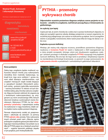 Projektor Jagielloński Wydział Fizyki, Astronomii i Informatyki Stosowanej Informacja o zespole badawczym znajduje się na str. 97 PYTHIA – przenośny wykrywacz chorób Odpowiednio wcześnie postawiona diagnoza zwiększa szanse pacjenta na wyleczenie – umożliwi to urządzenie, nad którym pracują fizycy z Uniwersytetu Jagiellońskiego. Im szybciej, tym lepiej www.cittru.uj.edu.pl/ /projektor/66.pdf tel. (12) 663 38 21 e-mail: [email protected] www.facebook.com/ /nimb.cittru Często jest tak, że zanim choroba da o sobie znać w postaci konkretnych objawów, to zdąży już wyrządzić ogromne szkody, działając potajemnie w naszym organizmie. Im wcześniej się ją zdiagnozuje, tym szanse na wyleczenie są większe. Jest to szczególnie istotne w przypadku nowotworów, które nawet przez kilka lat mogą nie dawać o sobie znać. Kapłanka wyroczni delfickiej Wiedząc jak ważną rolę odgrywa wczesna, prawidłowo postawiona diagnoza, naukowcy z Instytutu Fizyki UJ razem z badaczami z AGH zaangażowali się w duży projekt europejski, którego celem jest zbudowanie wyjątkowo czułego i zarazem prostego w obsłudze urządzenia PYTHIA noszącego imię kapłanki wyroczni delfickiej. Ma ono być do tego tanie w produkcji i eksploatacji (oparte na standardowej technologii krzemowej), co pozwoli na jego zastosowanie do wykrywania chorób w poradniach i samodzielnych gabinetach lekarskich. Nowe podejście Zaletą tego urządzenia będzie możliwość wykrywania różnych chorób, przy wykorzystaniu niewielkiej ilości materiału badawczego, np. kropli krwi. Jego serce wielkości 1 grosza stanowi układ dziesięciu interferometrów, czyli urządzeń mierzących wiązki światła biegnące w specjalnych kanałach (falowodach) pokrytych cienką – grubości rzędu kilku nanometrów – warstwą biomolekuł. To właśnie od tych biomolekuł zależy, jaką chorobę wykrywa urządzenie. Mają one bowiem zdolność do wiązania się z konkretnymi makrocząsteczkami, np. antygenami czy nićmi zmutowanego DNA, których obecność świadczy o potencjalnym stanie chorobowym. Wykrywacz PYTHIA ma być zintegrowany i przenośny. I najważniejsze: analizę ma wykonywać w ciągu kwadransa, dzięki czemu będzie można szybko postawić diagnozę. Pierwsze eksperymenty zostały już przeprowadzone i zakończyły się sukcesem. Za pomocą PYTHII wykryto raka prostaty. Testy wykrywania innych schorzeń przed nami. „Obecnie, oprócz prototypów urządzenia gotowa jest także technologia jego masowej produkcji. Czas pokaże czy za kilka lat PYTHIA pojawi się w lokalnych przychodniach” – wyjaśnia kierownik polskiego zespołu w tym projekcie, prof. Andrzej Budkowski. 82 Masowa produkcja urządzeń PYTHIA (widocznych jako powtarzające się kostki) do wczesnego wykrywania różnych chorób © fot. Zespół Projektu PYTHIA kopiuj tekst na zasadach licencji CC Uznanie Autorstwa 3.0 | zasady oznaczania określono na karcie redakcyjnej