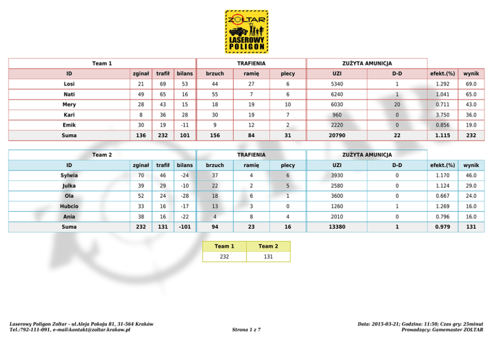 Team 1 TRAFIENIA ZUŻYTA AMUNICJA ID zginał trafił bilans brzuch ramię plecy UZI D-D efekt.(%) wynik Losi 21 69 53 44 27 6 5340 1 1.292 69.0 Nati 49 65 16 55 7 6 6240 1 1.041 65.0 Mery 28 43 15 18 19 10 6030 20 0.711 43.0 Kari 8 36 28 30 19 7 960 0 3.750 36.0 Emik 30 19 -11 9 12 2 2220 0 0.856 19.0 Suma 136 232 101 156 84 31 20790 22 1.115 232 Team 2 TRAFIENIA ZUŻYTA AMUNICJA ID zginał trafił bilans brzuch ramię plecy UZI D-D efekt.(%) wynik Sylwia 70 46 -24 37 4 6 3930 0 1.170 46.0 Julka 39 29 -10 22 2 5 2580 0 1.124 29.0 Ola 52 24 -28 18 6 1 3600 0 0.667 24.0 Hubcio 33 16 -17 13 3 0 1260 1 1.269 16.0 Ania 38 16 -22 4 8 4 2010 0 0.796 16.0 Suma 232 131 -101 94 23 16 13380 1 0.979 131 Laserowy Poligon Zoltar - ul.Aleja Pokoju 81, 31-564 Kraków Tel.:792-111-091, e-mail:[email protected] Team 1 Team 2 232 131 Strona 1 z 7 Data: 2015-03-21; Godzina: 11:50; Czas gry: 25minut Prowadzący: Gamemaster ZOLTAR Team 1 TRAFIENIA ZUŻYTA AMUNICJA ID zginał trafił bilans brzuch ramię plecy UZI D-D efekt.(%) wynik Emmi 13 89 78 67 37 21 5610 1 1.586 89.0 Nati 37 55 19 35 7 16 6120 0 0.899 55.0 Kari 8 51 43 36 21 10 960 0 5.313 51.0 Mery 16 28 12 21 7 5 3510 3 0.797 28.0 Losi 23 11 -12 7 4 1 2280 30 0.476 11.0 Emik 27 11 -16 11 1 0 2280 2 0.482 11.0 Suma 124 245 124 177 77 53 20760 36 1.178 245 Team 2 TRAFIENIA ZUŻYTA AMUNICJA ID zginał trafił bilans brzuch ramię plecy UZI D-D efekt.(%) wynik Paula 48 25 -23 17 10 2 3720 0 0.672 25.0 Ania 31 22 -9 14 8 1 1590 0 1.384 22.0 Sylwia 44 22 -22 17 5 1 4590 0 0.479 22.0 Hubcio 29 19 -10 14 6 1 2100 10 0.900 19.0 Ola 50 19 -31 13 4 2 4110 0 0.462 19.0 Julka 43 14 -29 13 3 0 1590 8 0.876 14.0 Suma 245 121 -124 88 36 7 17700 18 0.683 121 Laserowy Poligon Zoltar - ul.Aleja Pokoju 81, 31-564 Kraków Tel.:792-111-091, e-mail:[email protected] Team 1 Team 2 245 121 Strona 2 z 7 Data: 2015-03-21; Godzina: 12:29; Czas gry: 25minut Prowadzący: Gamemaster ZOLTAR Team 1 TRAFIENIA ZUŻYTA AMUNICJA ID zginał trafił bilans brzuch ramię plecy UZI D-D efekt.(%) wynik Emmi 23 61 41 38 35 11 5010 3 1.217 61.0 Nati 31 45 14 37 2 8 5730 1 0.785 45.0 Losi 37 39 6 24 15 7 7080 16 0.550 39.0 Mery 26 36 10 25 6 9 4140 14 0.867 36.0 Kari 20 22 2 15 6 3 1560 0 1.410 22.0 Emik 42 21 -19 17 8 1 3510 14 0.596 21.0 Suma 179 224 54 156 72 39 27030 48 0.827 224 Team 2 TRAFIENIA ZUŻYTA AMUNICJA ID zginał trafił bilans brzuch ramię plecy UZI D-D efekt.(%) wynik Sylwia 62 41 -21 26 10 6 4710 0 0.870 41.0 Julka 38 38 0 28 7 6 3660 0 1.038 38.0 Ania 31 27 -4 13 9 9 5730 1 0.471 27.0 Paula 33 24 -9 16 10 1 4920 0 0.488 24.0 Hubcio 24 22 -2 14 6 3 3180 0 0.692 22.0 Ola 36 18 -18 9 6 6 3810 0 0.472 18.0 Suma 224 170 -54 106 48 31 26010 1 0.654 170 Laserowy Poligon Zoltar - ul.Aleja Pokoju 81, 31-564 Kraków Tel.:792-111-091, e-mail:[email protected] Team 1 Team 2 224 170 Strona 3 z 7 Data: 2015-03-21; Godzina: 13:22; Czas gry: 25minut Prowadzący: Gamemaster ZOLTAR Drużyny Miejsce Laserowy Poligon Zoltar - ul.Aleja Pokoju 81, 31-564 Kraków Tel.:792-111-091, e-mail:[email protected] Rozgrywki Nazwa 1 2 3 Suma Team 1 232 245 224 701 Team 2 131 121 170 422 Strona 4 z 7 Data: 2015-03-21 Prowadzący: Gamemaster ZOLTAR Zestawienie wg wyniku Miejsce TRAFIENIA ZUŻYTA AMUNICJA ID zginał trafił bilans brzuch ramię plecy UZI D-D efekt.(%) wynik Emmi 43.20 180.00 136.80 126.00 86.40 38.40 12744.00 4.80 1.412 180.00 Nati 93.60 132.00 38.40 101.60 12.80 24.00 14472.00 1.60 0.912 132.00 Losi 64.80 95.20 30.40 60.00 36.80 11.20 11760.00 37.60 0.807 95.20 Kari 28.80 87.20 58.40 64.80 36.80 16.00 2784.00 0.00 3.132 Sylwia 140.80 87.20 -53.60 64.00 15.20 10.40 10584.00 0.00 0.824 5 Mery 56.00 85.60 29.60 51.20 25.60 19.20 10944.00 29.60 0.780 85.60 6 Julka 96.00 64.80 -31.20 50.40 9.60 8.80 6264.00 6.40 1.033 64.80 7 Paula 97.20 58.80 -38.40 39.60 24.00 3.60 10368.00 0.00 0.567 58.80 8 Ania 80.00 52.00 -28.00 24.80 20.00 11.20 7464.00 0.80 0.697 52.00 9 Ola 110.40 48.80 -61.60 32.00 12.80 7.20 9216.00 0.00 0.530 48.80 10 Hubcio 68.80 45.60 -23.20 32.80 12.00 3.20 5232.00 8.80 0.870 45.60 11 Emik 79.20 40.80 -38.40 29.60 16.80 2.40 6408.00 12.80 0.635 40.80 4 Laserowy Poligon Zoltar - ul.Aleja Pokoju 81, 31-564 Kraków Tel.:792-111-091, e-mail:[email protected] Strona 5 z 7 87.20 Data: 2015-03-21 Prowadzący: Gamemaster ZOLTAR Zestawienie wg bilansu Miejsce TRAFIENIA ZUŻYTA AMUNICJA ID zginał trafił bilans brzuch ramię plecy UZI D-D efekt.(%) wynik Emmi 43.20 180.00 136.80 126.00 86.40 38.40 12744.00 4.80 1.412 180.00 Kari 28.80 87.20 58.40 64.80 36.80 16.00 2784.00 0.00 3.132 87.20 Nati 93.60 132.00 38.40 101.60 12.80 24.00 14472.00 1.60 0.912 132.00 4 Losi 64.80 95.20 30.40 60.00 36.80 11.20 11760.00 37.60 0.807 95.20 5 Mery 56.00 85.60 29.60 51.20 25.60 19.20 10944.00 29.60 0.780 85.60 6 Hubcio 68.80 45.60 -23.20 32.80 12.00 3.20 5232.00 8.80 0.870 45.60 7 Ania 80.00 52.00 -28.00 24.80 20.00 11.20 7464.00 0.80 0.697 52.00 8 Julka 96.00 64.80 -31.20 50.40 9.60 8.80 6264.00 6.40 1.033 64.80 Emik 79.20 40.80 29.60 16.80 2.40 6408.00 12.80 0.635 40.80 Paula 97.20 58.80 39.60 24.00 3.60 10368.00 0.00 0.567 58.80 10 Sylwia 140.80 87.20 -53.60 64.00 15.20 10.40 10584.00 0.00 0.824 87.20 11 Ola 110.40 48.80 -61.60 32.00 12.80 7.20 9216.00 0.00 0.530 48.80 9 Laserowy Poligon Zoltar - ul.Aleja Pokoju 81, 31-564 Kraków Tel.:792-111-091, e-mail:[email protected] -38.40 Strona 6 z 7 Data: 2015-03-21 Prowadzący: Gamemaster ZOLTAR Zestawienie wg efektywności Miejsce TRAFIENIA ZUŻYTA AMUNICJA ID zginał trafił bilans brzuch ramię plecy UZI D-D efekt.(%) wynik Kari 28.80 87.20 58.40 64.80 36.80 16.00 2784.00 0.00 3.132 87.20 Emmi 43.20 180.00 136.80 126.00 86.40 38.40 12744.00 4.80 1.412 180.00 Julka 96.00 64.80 -31.20 50.40 9.60 8.80 6264.00 6.40 1.033 64.80 4 Nati 93.60 132.00 38.40 101.60 12.80 24.00 14472.00 1.60 0.912 132.00 5 Hubcio 68.80 45.60 -23.20 32.80 12.00 3.20 5232.00 8.80 0.870 45.60 6 Sylwia 140.80 87.20 -53.60 64.00 15.20 10.40 10584.00 0.00 0.824 87.20 7 Losi 64.80 95.20 30.40
