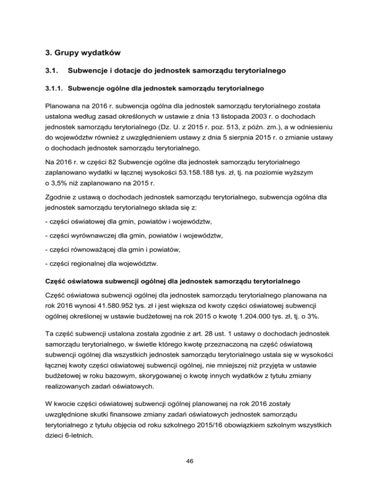 3. Grupy wydatków 3.1. Subwencje i dotacje do jednostek samorządu terytorialnego 3.1.1. Subwencje ogólne dla jednostek samorządu terytorialnego Planowana na 2016 r. subwencja ogólna dla jednostek samorządu terytorialnego została ustalona według zasad określonych w ustawie z dnia 13 listopada 2003 r. o dochodach jednostek samorządu terytorialnego (Dz. U. z 2015 r. poz. 513, z późn. zm.), a w odniesieniu do województw również z uwzględnieniem ustawy z dnia 5 sierpnia 2015 r. o zmianie ustawy o dochodach jednostek samorządu terytorialnego. Na 2016 r. w części 82 Subwencje ogólne dla jednostek samorządu terytorialnego zaplanowano wydatki w łącznej wysokości 53.158.188 tys. zł, tj. na poziomie wyższym o 3,5% niż zaplanowano na 2015 r. Zgodnie z ustawą o dochodach jednostek samorządu terytorialnego, subwencja ogólna dla jednostek samorządu terytorialnego składa się z: - części oświatowej dla gmin, powiatów i województw, - części wyrównawczej dla gmin, powiatów i województw, - części równoważącej dla gmin i powiatów, - części regionalnej dla województw. Część oświatowa subwencji ogólnej dla jednostek samorządu terytorialnego Część oświatowa subwencji ogólnej dla jednostek samorządu terytorialnego planowana na rok 2016 wynosi 41.580.952 tys. zł i jest większa od kwoty części oświatowej subwencji ogólnej określonej w ustawie budżetowej na rok 2015 o kwotę 1.204.000 tys. zł, tj. o 3%. Ta część subwencji ustalona została zgodnie z art. 28 ust. 1 ustawy o dochodach jednostek samorządu terytorialnego, w świetle którego kwotę przeznaczoną na część oświatową subwencji ogólnej dla wszystkich jednostek samorządu terytorialnego ustala się w wysokości łącznej kwoty części oświatowej subwencji ogólnej, nie mniejszej niż przyjęta w ustawie budżetowej w roku bazowym, skorygowanej o kwotę innych wydatków z tytułu zmiany realizowanych zadań oświatowych. W kwocie części oświatowej subwencji ogólnej planowanej na rok 2016 zostały uwzględnione skutki finansowe zmiany zadań oświatowych jednostek samorządu terytorialnego z tytułu objęcia od roku szkolnego 2015/16 obowiązkiem szkolnym wszystkich dzieci 6-letnich. 46 Część wyrównawcza subwencji ogólnej dla gmin Część wyrównawcza subwencji ogólnej dla gmin zaplanowana na 2016 r. w wysokości 6.533.086 tys. zł jest wyższa o 5,6% od kwoty tej części subwencji zaplanowanej na 2015 r. Część wyrównawcza subwencji ogólnej dla gmin składa się z kwoty podstawowej i kwoty uzupełniającej. Podstawę do ustalenia wysokości kwoty podstawowej na 2016 r. stanowiły dane ze sprawozdań z wykonania dochodów podatkowych gminy za 2014 r. oraz dane o liczbie mieszkańców według stanu na dzień 31 grudnia 2014 r., ustalonej przez Główny Urząd Statystyczny. Kwotę podstawową otrzymują gminy, w których dochód na 1 mieszkańca jest niższy od 92% średniego dochodu na 1 mieszkańca kraju. Wysokość kwoty uzupełniającej uzależniona jest od gęstości zaludnienia w gminie, w relacji do średniej gęstości zaludnienia w kraju i dochodu gminy na 1 mieszkańca. Kwotę uzupełniającą otrzymują tylko te gminy, w których gęstość zaludnienia, ustalona przez Główny Urząd Statystyczny według stanu na dzień 31 grudnia 2014 r., jest niższa od średniej gęstości zaludnienia w kraju i dochód podatkowy na 1 mieszkańca gminy jest nie wyższy niż 150% średniego dochodu podatkowego na 1 mieszkańca kraju. Część wyrównawcza subwencji ogólnej dla powiatów Część wyrównawcza subwencji ogólnej dla powiatów zaplanowana na 2016 r. w kwocie 1.714.472 tys. zł, jest o 8,4% wyższa od kwoty zaplanowanej na 2015 r. Część wyrównawcza subwencji ogólnej dla powiatów składa się z kwoty podstawowej i kwoty uzupełniającej. Kwotę podstawową otrzymują powiaty, w których wskaźnik dochodów podatkowych z tytułu udziału we wpływach z podatku dochodowego od osób fizycznych (PIT) i udziału we wpływach z podatku dochodowego od osób prawnych (CIT) na 1 mieszkańca w powiecie jest mniejszy niż wskaźnik dochodów podatkowych dla wszystkich powiatów. Wyrównanie stanowi 90% różnicy między średnim dochodem podatkowym na 1 mieszkańca kraju a dochodem podatkowym na 1 mieszkańca powiatu. Kwota podstawowa stanowi iloczyn ww. kwoty wyrównania na 1 mieszkańca i liczby mieszkańców danego powiatu. Kwota uzupełniająca zależy od wskaźnika bezrobocia w danym powiecie i przeznaczona jest dla tych powiatów, w których wskaźnik bezrobocia – liczony jako iloraz stopy bezrobocia w powiecie i stopy bezrobocia w kraju – jest wyższy od 1,10. Im wyższy jest wskaźnik bezrobocia w powiecie, tym wyższa jest ta kwota. 47 Część wyrównawcza subwencji ogólnej dla województw Część wyrównawcza subwencji ogólnej dla województw zaplanowana na 2016 r. w kwocie 1.004.241 tys. zł, jest o 5,8% wyższa od kwoty zaplanowanej na 2015 r. Część wyrównawcza subwencji ogólnej dla województw składa się z kwoty podstawowej i kwoty uzupełniającej. Kwota podstawowa jest przeznaczona dla tych województw, w których wskaźnik dochodów podatkowych na 1 mieszkańca (z tytułu udziału we wpływach z podatku dochodowego od osób fizycznych PIT i udziału we wpływach z podatku dochodowego od osób prawnych CIT) jest mniejszy niż wskaźnik dochodów podatkowych dla wszystkich województw. Wyrównanie stanowi 72% różnicy między średnim dochodem podatkowym województw na 1mieszkańca w kraju a dochodem podatkowym na 1 mieszkańca województwa. Kwota podstawowa stanowi iloczyn ww. kwoty wyrównania i liczby mieszkańców w danym województwie. Kwota uzupełniająca uzależniona jest od liczby mieszkańców w województwie. Kwotę tę otrzymują województwa, w których wskaźnik dochodów podatkowych na jednego mieszkańca w województwie jest niższy od 125% wskaźnika dochodów podatkowych dla wszystkich województw, a więc te, k