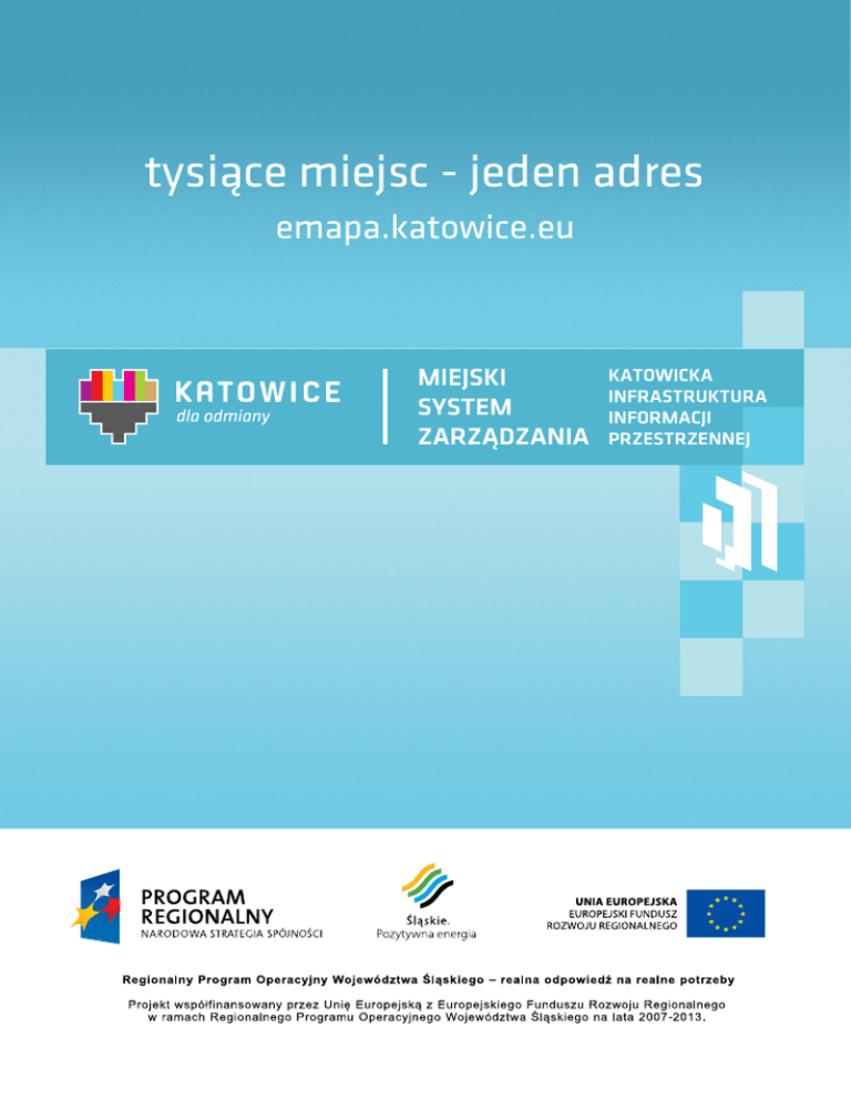 tysiące miejsc - jeden adres emapa.katowice.eu tysiące miejsc – jeden adres Tysiące miejsc – jeden adres. To możliwe. Wdrażamy „Miejski System Zarządzania – Katowicka Infrastruktura Informacji Przestrzennej” (MSZ-KIIP). Zgromadziliśmy i przetworzyliśmy tysiące danych. Dzięki temu użytkownicy Systemu uzyskają wygodny dostęp do zintegrowanej geoinformacji, która niezbędna jest w wielu dziedzinach życia. MSZ-KIIP umożliwia spojrzenie na miejsce i otoczenie funkcjonowania instytucji, organizacji, przedsiębiorstw poprzez pryzmat przestrzenny. Jest to ciekawa propozycja m.in. dla przedsiębiorców oraz inwestorów. Stosując geoportale, przedsiębiorcy oraz inwestorzy wykorzystają dane przestrzenne i tzw. metadane: podejmując decyzje nt. planowanych inwestycji, sposobów funkcjonowania i kierunków rozwoju firm, współpracując z samorządem w kształtowaniu szeroko rozumianej gospodarki przestrzennej. Miejski System Zarządzania - Katowicka Infrastruktura Informacji Przestrzennej to projekt zgłoszony przez Miasto Katowice do procedur konkursowych w ramach Regionalnego Programu Operacyjnego Województwa Śląskiego na lata 2007 - 2013. Uzyskał współfinansowanie kosztów jego realizacji środkami Europejskiego Funduszu Rozwoju Regionalnego w ramach Działania 2.2 Rozwój elektronicznych usług publicznych. Priorytet II. Społeczeństwo informacyjne. Wartość projektu wynosi 13 998 483,50 zł. W 2010 roku została podpisana umowa o dofinansowanie 50% kosztów kwalifikowanych projektu ze środków unijnych, pozostała kwota stanowi wkład własny Miasta Katowice. Ważne pojęcia Geoportal to rodzaj aplikacji zapewniającej użytkownikowi dostęp do danych przestrzennych oraz funkcji (usług) związanych z tymi danymi. Umożliwia prezentację i wyszukiwanie określonych danych, ich analizę oraz interpretację, a w efekcie lepsze ich zrozumienie i wykorzystanie. Dane przestrzenne to dane odnoszące się bezpośrednio lub pośrednio do określonego położenia lub obszaru geograficznego. Metadane to informacje, które opisują zbiory danych przestrzennych oraz usługi danych przestrzennych i umożliwiają odnalezienie, inwentaryzację oraz używanie tych danych oraz usług. Dostęp do danych przestrzennych na www.emapa.katowice.eu