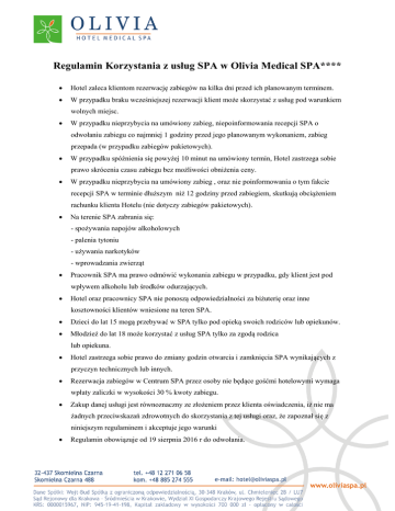 Regulamin Korzystania z usług SPA w Olivia Medical SPA**** Hotel zaleca klientom rezerwację zabiegów na kilka dni przed ich planowanym terminem. W przypadku braku wcześniejszej rezerwacji klient może skorzystać z usług pod warunkiem wolnych miejsc. W przypadku nieprzybycia na umówiony zabieg, niepoinformowania recepcji SPA o odwołaniu zabiegu co najmniej 1 godziny przed jego planowanym wykonaniem, zabieg przepada (w przypadku zabiegów pakietowych). W przypadku spóźnienia się powyżej 10 minut na umówiony termin, Hotel zastrzega sobie prawo skrócenia czasu zabiegu bez możliwości obniżenia ceny. W przypadku nieprzybycia na umówiony zabieg , oraz nie poinformowania o tym fakcie recepcji SPA w terminie dłuższym niż 12 godziny przed zabiegiem, skutkują obciążeniem rachunku klienta Hotelu (nie dotyczy zabiegów pakietowych). Na terenie SPA zabrania się: - spożywania napojów alkoholowych - palenia tytoniu - używania narkotyków - wprowadzania zwierząt Pracownik SPA ma prawo odmówić wykonania zabiegu w przypadku, gdy klient jest pod wpływem alkoholu lub środków odurzających. Hotel oraz pracownicy SPA nie ponoszą odpowiedzialności za biżuterię oraz inne kosztowności klientów wniesione na teren SPA. Dzieci do lat 15 mogą przebywać w SPA tylko pod opieką swoich rodziców lub opiekunów. Młodzież do lat 18 może korzystać z usług SPA tylko za zgodą rodzica lub opiekuna. Hotel zastrzega sobie prawo do zmiany godzin otwarcia i zamknięcia SPA wynikających z przyczyn technicznych lub innych. Rezerwacja zabiegów w Centrum SPA przez osoby nie będące gośćmi hotelowymi wymaga wpłaty zaliczki w wysokości 30 % kwoty zabiegu. Zakup danej usługi jest równoznaczny ze złożeniem przez klienta oświadczenia, iż nie ma żadnych przeciwskazań zdrowotnych do skorzystania z tej usługi oraz, że zapoznał się z niniejszym regulaminem i akceptuje jego warunki Regulamin obowiązuje od 19 sierpnia 2016 r do odwołania.