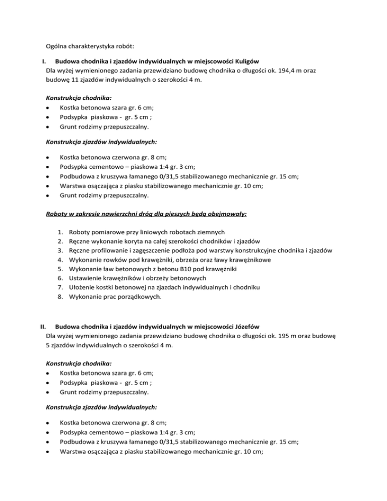 Ogólna charakterystyka robót: I. Budowa chodnika i zjazdów indywidualnych w miejscowości Kuligów Dla wyżej wymienionego zadania przewidziano budowę chodnika o długości ok. 194,4 m oraz budowę 11 zjazdów indywidualnych o szerokości 4 m. Konstrukcja chodnika: Kostka betonowa szara gr. 6 cm; Podsypka piaskowa - gr. 5 cm ; Grunt rodzimy przepuszczalny. Konstrukcja zjazdów indywidualnych: Kostka betonowa czerwona gr. 8 cm; Podsypka cementowo – piaskowa 1:4 gr. 3 cm; Podbudowa z kruszywa łamanego 0/31,5 stabilizowanego mechanicznie gr. 15 cm; Warstwa osączająca z piasku stabilizowanego mechanicznie gr. 10 cm; Grunt rodzimy przepuszczalny. Roboty w zakresie nawierzchni dróg dla pieszych będą obejmowały: 1. 2. 3. 4. 5. 6. 7. 8. Roboty pomiarowe przy liniowych robotach ziemnych Ręczne wykonanie koryta na całej szerokości chodników i zjazdów Ręczne profilowanie i zagęszczenie podłoża pod warstwy konstrukcyjne chodnika i zjazdów Wykonanie rowków pod krawężniki, obrzeża oraz ławy krawężnikowe Wykonanie ław betonowych z betonu B10 pod krawężniki Ustawienie krawężników i obrzeży betonowych Ułożenie kostki betonowej na zjazdach indywidualnych i chodniku Wykonanie prac porządkowych. II. Budowa chodnika i zjazdów indywidualnych w miejscowości Józefów Dla wyżej wymienionego zadania przewidziano budowę chodnika o długości ok. 195 m oraz budowę 5 zjazdów indywidualnych o szerokości 4 m. Konstrukcja chodnika: Kostka betonowa szara gr. 6 cm; Podsypka piaskowa - gr. 5 cm ; Grunt rodzimy przepuszczalny. Konstrukcja zjazdów indywidualnych: Kostka betonowa czerwona gr. 8 cm; Podsypka cementowo – piaskowa 1:4 gr. 3 cm; Podbudowa z kruszywa łamanego 0/31,5 stabilizowanego mechanicznie gr. 15 cm; Warstwa osączająca z piasku stabilizowanego mechanicznie gr. 10 cm; Grunt rodzimy przepuszczalny. Roboty w zakresie nawierzchni dróg dla pieszych będą obejmowały: 9. 10. 11. 12. 13. 14. 15. 16. Roboty pomiarowe przy liniowych robotach ziemnych Ręczne wykonanie koryta na całej szerokości chodników i zjazdów Ręczne profilowanie i zagęszczenie podłoża pod warstwy konstrukcyjne chodnika i zjazdów Wykonanie rowków pod krawężniki, obrzeża oraz ławy krawężnikowe Wykonanie ław betonowych z betonu B10 pod krawężniki Ustawienie krawężników i obrzeży betonowych Ułożenie kostki betonowej na zjazdach indywidualnych i chodniku Wykonanie prac porządkowych.
