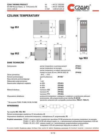 CZAKI THERMO-PRODUCT 05-090 Raszyn-Rybie, ul. 19 Kwietnia 58 www.czaki.pl tel. +48 22 7202302 fax. +48 22 7202305 e-mail [email protected] 70 90 46 typ 951 71 58 CZUJNIK TEMPERATURY 27 57 46 35 64 32 typ 952 17,5 typ 953 P7 DANE TECHNICZNE Zastosowanie Zakres pomiarowy Element przetwarzający Klasa elementu przetwarzającego Maksymalny prąd pomiarowy Dopuszczalna wilgotność względna Materiał obudowy Wyposażenie dodatkowe (1) pomiar temperatury w pomieszczeniach (TP-951) pomiar temperatury na zewnątrz (TP-952) pomiar temperatury w szafach sterowniczych, montaż na szynie 35 mm, DIN EN 5022-35 (TP-953) –30°C...+70°C opornik platynowy (Pt100)(1) A 1 mA do 80% (TP-951) do 95% (TP-952) do 80% (TP-953) tworzywo ABS (TP-951) tworzywo PC (TP-952) tworzywo PPO (TP-953) przetwornik temperatury: analogowy z ustalonym w zamówieniu zakresem przetwarzania, albo programowalny przez interfejs IF-2013U (parametry ustawiane jak w przypadku przetworników TEH-27 i TED-27). Na życzenie Pt500, Pt1000, Ni100, Ni1000 WYKONANIA TP Typ czujnika 951, 952, 953 Element przetwarzający pojedynczy (1) lub podwójny (2) Wyposażenie dodatkowe, przetwornik temperatury: stałozakresowy T, programowalny TE Przykład zamawiania: TP-952-1 oznacza czujnik z pojedynczym opornikiem Pt100 przeznaczony do pomiaru temperatury na zewnątrz. TP-952-1-T; -30°C+70°C/4-20 mA oznacza czujnik j.w., z zamontowanym przetwornikiem temperatury 4-20 mA. TP-952-1-TE; 0°C+70°C oznacza czujnik j.w. z zamontowanym programowalnym przetwornikiem temperatury 4-20 mA ustawionym fabrycznie na zakres 0...70°C. Na życzenie bezpłatne Świadectwo jakości określające klasę czujnika lub odpłatne Świadectwo wzorcowania dla dowolnych temperatur z oznaczonymi odchyłkami 5.7.0