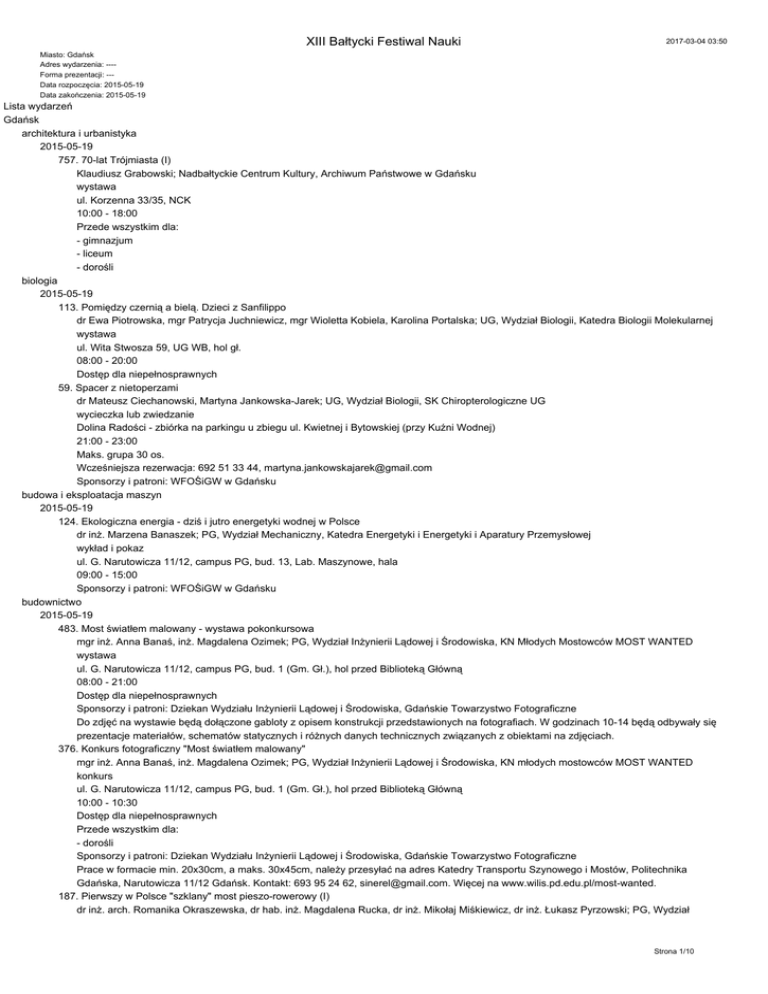 XIII Bałtycki Festiwal Nauki 2017-03-04 03:50 Miasto: Gdańsk Adres wydarzenia: ---Forma prezentacji: --Data rozpoczęcia: 2015-05-19 Data zakończenia: 2015-05-19 Lista wydarzeń Gdańsk architektura i urbanistyka 2015-05-19 757. 70-lat Trójmiasta (I) Klaudiusz Grabowski; Nadbałtyckie Centrum Kultury, Archiwum Państwowe w Gdańsku wystawa ul. Korzenna 33/35, NCK 10:00 - 18:00 Przede wszystkim dla: - gimnazjum - liceum - dorośli biologia 2015-05-19 113. Pomiędzy czernią a bielą. Dzieci z Sanfilippo dr Ewa Piotrowska, mgr Patrycja Juchniewicz, mgr Wioletta Kobiela, Karolina Portalska; UG, Wydział Biologii, Katedra Biologii Molekularnej wystawa ul. Wita Stwosza 59, UG WB, hol gł. 08:00 - 20:00 Dostęp dla niepełnosprawnych 59. Spacer z nietoperzami dr Mateusz Ciechanowski, Martyna Jankowska-Jarek; UG, Wydział Biologii, SK Chiropterologiczne UG wycieczka lub zwiedzanie Dolina Radości - zbiórka na parkingu u zbiegu ul. Kwietnej i Bytowskiej (przy Kuźni Wodnej) 21:00 - 23:00 Maks. grupa 30 os. Wcześniejsza rezerwacja: 692 51 33 44, [email protected] Sponsorzy i patroni: WFOŚiGW w Gdańsku budowa i eksploatacja maszyn 2015-05-19 124. Ekologiczna energia - dziś i jutro energetyki wodnej w Polsce dr inż. Marzena Banaszek; PG, Wydział Mechaniczny, Katedra Energetyki i Energetyki i Aparatury Przemysłowej wykład i pokaz ul. G. Narutowicza 11/12, campus PG, bud. 13, Lab. Maszynowe, hala 09:00 - 15:00 Sponsorzy i patroni: WFOŚiGW w Gdańsku budownictwo 2015-05-19 483. Most światłem malowany - wystawa pokonkursowa mgr inż. Anna Banaś, inż. Magdalena Ozimek; PG, Wydział Inżynierii Lądowej i Środowiska, KN Młodych Mostowców MOST WANTED wystawa ul. G. Narutowicza 11/12, campus PG, bud. 1 (Gm. Gł.), hol przed Biblioteką Główną 08:00 - 21:00 Dostęp dla niepełnosprawnych Sponsorzy i patroni: Dziekan Wydziału Inżynierii Lądowej i Środowiska, Gdańskie Towarzystwo Fotograficzne Do zdjęć na wystawie będą dołączone gabloty z opisem konstrukcji przedstawionych na fotografiach. W godzinach 10-14 będą odbywały się prezentacje materiałów, schematów statycznych i różnych danych technicznych związanych z obiektami na zdjęciach. 376. Konkurs fotograficzny "Most światłem malowany" mgr inż. Anna Banaś, inż. Magdalena Ozimek; PG, Wydział Inżynierii Lądowej i Środowiska, KN młodych mostowców MOST WANTED konkurs ul. G. Narutowicza 11/12, campus PG, bud. 1 (Gm. Gł.), hol przed Biblioteką Główną 10:00 - 10:30 Dostęp dla niepełnosprawnych Przede wszystkim dla: - dorośli Sponsorzy i patroni: Dziekan Wydziału Inżynierii Lądowej i Środowiska, Gdańskie Towarzystwo Fotograficzne Prace w formacie min. 20x30cm, a maks. 30x45cm, należy przesyłać na adres Katedry Transportu Szynowego i Mostów, Politechnika Gdańska, Narutowicza 11/12 Gdańsk. Kontakt: 693 95 24 62, [email protected]. Więcej na www.wilis.pd.edu.pl/most-wanted. 187. Pierwszy w Polsce "szklany" most pieszo-rowerowy (I) dr inż. arch. Romanika Okraszewska, dr hab. inż. Magdalena Rucka, dr inż. Mikołaj Miśkiewicz, dr inż. Łukasz Pyrzowski; PG, Wydział Strona 1/10 XIII Bałtycki Festiwal Nauki 2017-03-04 03:50 Inżynierii Lądowej i Środowiska, KN Mechaniki Budowli KOMBO wystawa ul. G. Narutowicza 11/12, campus PG, za bud. 10a (Żelbet) 10:00 - 14:00 Schemat statyczny mostu to belka swobodnie podparta, o szerokości użytkowej - 2,5 m i rozpiętości przęsła 14 m. Przyjęta rozpiętość obiektu wynika z szerokości skrajni drogowej dwupasmowej jezdni ruchu przyspieszonego, nad którą ma przeprowadzić ruch pieszy i rowerowy. Możliwe jest również wykorzystanie projektowanego przęsła nad innymi drogami samochodowymi, kolejowymi czy wodnymi oraz jako przeprawy tymczasowe na obszarach dotkniętych klęskami żywiołowymi. chemia 2015-05-19 397. Fotografia tradycyjna - technika suchej płyty mgr inż. Krzysztof Pacyga; PG, Wydział Chemiczny, NKCh SPG pokaz i warsztaty ul. G. Narutowicza 11/12, campus PG, plac za bud. 5 09:00 - 11:00, 11:00 - 13:00, 13:00 - 15:00 Maks. grupa 10 os. Przede wszystkim dla: - liceum - dorośli Wcześniejsza rezerwacja: do 12 maja, [email protected] 916. Elektrochemiczne laboratorium Michał Mazurek; PG, Wydział Chemiczny, Koło Badaczy Korozji pokaz laboratoryjny ul. G. Narutowicza 11/12, campus PG, plac przed bud. 5 (Chemia A) 09:00 - 15:00 Dostęp dla niepełnosprawnych 606. Nie taka chemia straszna, jak ją malują - warsztaty dla młodych chemików mgr inż. N.Łukasik, mgr inż. B.Kamińska, mgr inż. E.Nowak, mgr inż. K.Majewska, mgr inż. A.Jasiński, mgr inż M.Jeszke, mgr inż M.Urbanowicz; PG, Wydział Chemiczny, Katedra Chemii i Technologii Materiałów Funkcjonalnych pokaz i warsztaty ul. G. Narutowicza 11/12, campus PG, bud. 6 (Chemia B), IV p., s. 402 09:00 - 15:00 Maks. grupa 30 os. Dostęp dla niepełnosprawnych Przede wszystkim dla: - szkoła podstawowa (kl. 4 - 6) - gimnazjum - liceum - dorośli Wcześniejsza rezerwacja: do 5 maja, 58 347 23 59, [email protected], [email protected] 43. Światło, ciepło, energia - czyli od jaskiniowca z łuczywem do grzyba atomowego dr hab. Sławomir Makowiec, mgr inż. Ewelina Najda; PG, Wydział Chemiczny, Katedra Chemii Organicznej pokaz i warsztaty ul. G. Narutowicza 11/12, campus PG, plac przed bud. 5 i 8, bud. 5, s. 07 10:00 - 14:00 Maks. grupa 100 os. Dostęp dla niepełnosprawnych Przede wszystkim dla: - przedszkole - szkoła podstawowa (kl. 1 - 3) - szkoła podstawowa (kl. 4 - 6) Wcześniejsza rezerwacja: do 15 maja, 512 42 62 94, [email protected] Sponsorzy i patroni: WFOŚiGW w Gdańsku 102. Hydrozagadka – zabawy z napięciem powierzchniowym dr inż. Justyna Łuczak mgr inż. Anna Latowska, mgr inż. K. Piszcz, mgr inż. M. Długokęcka, mgr inż. A. Wojciechowska, mgr inż. J. Piekart; PG, Wydział Chemiczny, Katedra Technologii Chemicznej pokaz i warsztaty ul. G. Narutowicza 11/12, campus PG, bud. 5 (Chemia A), s. 26 10:30 - 11:30 Maks. grupa 10 os. Dostęp dla niepełnospra