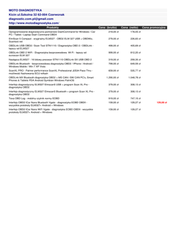 MOTO DIAGNOSTYKA Kicin ul.Szkolna 32 62-004 Czerwonak [email protected] http://www.motodiagnostyka.com/ Produkty Cena (brutto) Cena (netto) Oprogramowanie diagnostyczno pomiarowe DashCommand for Windows / Car PC / Tablet / Laptop Dash Command OBDII 219,00 zł 178,05 zł ElmScan 5 Compact - oryginalny ELM327 - OBD2 ELM 327 USB + OBDWiz, Scantool.net 279,00 zł 226,83 zł OBDLink USB OBD2 / Scan Tool STN1110 / Diagnostyka OBD 2 / OBDLink lepszy od ELM327 499,00 zł 405,69 zł OBDLink OBD 2 WiFi - Diagnostyka bezprzewodowa Wi Fi - lepszy od euroscan ELM 327 999,00 zł 812,20 zł Następca ELM327 - 16 bitowy procesor STN1110 OBDLink SX USB OBD 2 319,00 zł 259,35 zł OBDLink Bluetooth - bezprzewodowa diagnostyka OBD2 / IPhone / Android / Windows Mobile / Win 7 XP Vista 799,00 zł 649,59 zł ScanXL PRO - Palmer performance ScanXL Professional J2534 Pass-Thru możliwość flashowania ECU reflash 659,00 zł 535,77 zł 1.290,00 zł 1.048,78 zł Interfejs diagnostyczny ELM327 Elmscan5 USB + program Scan XL Pro diagnostyka OBD2 379,00 zł 308,13 zł Interfejs diagnostyczny ELM327 Elmscan5 Bluetooth + program Scan XL Pro diagnostyka OBD2 379,00 zł 308,13 zł Texa OBD Log - mobilny czytnik normy EOBD 919,00 zł 747,15 zł Interfejs OBD2 ICar Nano Bluetooth Vgate - diagnostyka EOBD OBDII wszystkie protokoły ELM327+ Android + Windows 159,00 zł 129,27 zł Interfejs OBD2 ICar Nano WiFi Vgate - diagnostyka EOBD OBDII - wszystkie protokoły ELM327+ Android + Windows 159,00 zł 129,27 zł OBDLink MX Bluetooth diagnostyka OBD2 + MS CAN i SW CAN PC's, Smart Phones & Tablets PDA Android Symbian Windows PalmOS Cena promocyjna 129,00 zł
