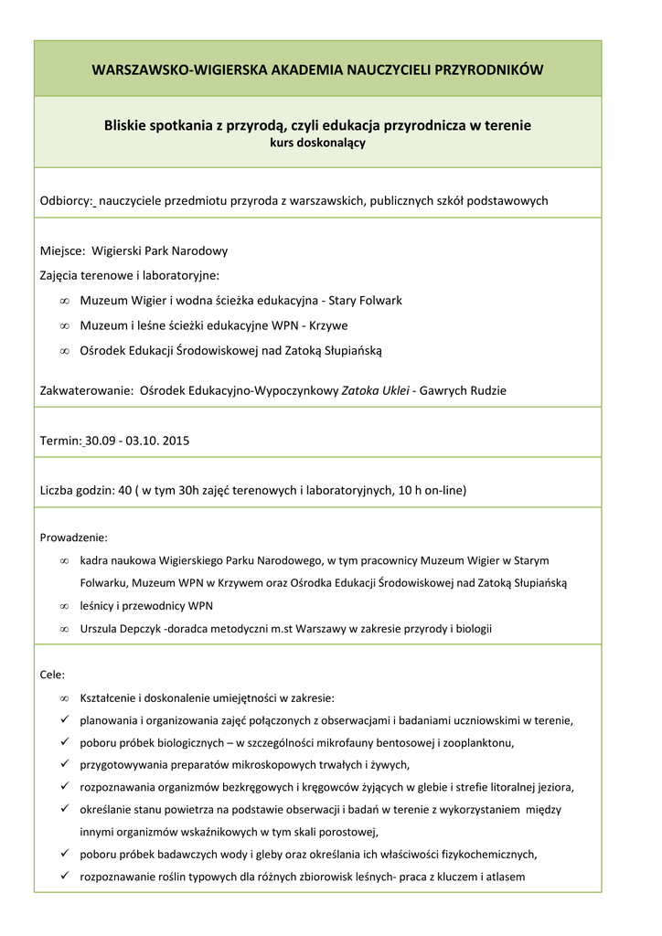 WARSZAWSKO-WIGIERSKA AKADEMIA NAUCZYCIELI PRZYRODNIKÓW Bliskie spotkania z przyrodą, czyli edukacja przyrodnicza w terenie kurs doskonalący Odbiorcy: nauczyciele przedmiotu przyroda z warszawskich, publicznych szkół podstawowych Miejsce: Wigierski Park Narodowy Zajęcia terenowe i laboratoryjne: • Muzeum Wigier i wodna ścieżka edukacyjna - Stary Folwark • Muzeum i leśne ścieżki edukacyjne WPN - Krzywe • Ośrodek Edukacji Środowiskowej nad Zatoką Słupiańską Zakwaterowanie: Ośrodek Edukacyjno-Wypoczynkowy Zatoka Uklei - Gawrych Rudzie Termin: 30.09 - 03.10. 2015 Liczba godzin: 40 ( w tym 30h zajęć terenowych i laboratoryjnych, 10 h on-line) Prowadzenie: • kadra naukowa Wigierskiego Parku Narodowego, w tym pracownicy Muzeum Wigier w Starym Folwarku, Muzeum WPN w Krzywem oraz Ośrodka Edukacji Środowiskowej nad Zatoką Słupiańską • leśnicy i przewodnicy WPN • Urszula Depczyk -doradca metodyczni m.st Warszawy w zakresie przyrody i biologii Cele: • Kształcenie i doskonalenie umiejętności w zakresie: planowania i organizowania zajęć połączonych z obserwacjami i badaniami uczniowskimi w terenie, poboru próbek biologicznych – w szczególności mikrofauny bentosowej i zooplanktonu, przygotowywania preparatów mikroskopowych trwałych i żywych, rozpoznawania organizmów bezkręgowych i kręgowców żyjących w glebie i strefie litoralnej jeziora, określanie stanu powietrza na podstawie obserwacji i badań w terenie z wykorzystaniem między innymi organizmów wskaźnikowych w tym skali porostowej, poboru próbek badawczych wody i gleby oraz określania ich właściwości fizykochemicznych, rozpoznawanie roślin typowych dla różnych zbiorowisk leśnych- praca z kluczem i atlasem rozpoznawania organizmów zamieszkujących ekosystemy leśne, w szczególności ptaków i ssaków określania wzajemnych zależności między organizmami w ekosystemach wodnych i lądowych. • poszerzenie wiadomości na temat monitoringu i ochrony lasów oraz zabiegów ochrony czynnej, • gatunków inwazyjnych i problemów związanych z ich występowaniem na terenach chronionych. • Poznanie metod ochrony czynnej na obszarach chronionych w tym zjawisko biomanipulacji na przykładzie Jeziora Wigry. • Opracowanie kart pracy do zajęć terenowych zgodnie z zapisami podstawy programowej przedmiotu przyroda z wykorzystaniem metod badawczych. • Poznanie walorów przyrodniczych Wigierskiego Parku Narodowego. RAMOWY PROGRAM KURSU DOSKONALĄCEGO 30.09.2015 (środa) 14.30 wyjazd autokarem z Warszawy • zbiórka Plac Bankowy g.14.00 19.30 Ośrodek Edukacyjno – Wypoczynkowy Zatoka Uklei, Gawrych Ruda • • • przyjazd, zakwaterowanie kolacja spotkanie informacyjne 01.10.2015 (czwartek) 08.00 śniadanie 09.00-14.30 Muzeum Wigier, Stary Folwark • prelekcja - Jezioro Wigry i jego ochrona • lekcja muzealna - Ryby mieszkańcy wigierskich wód • lekcja muzealna –Ptaki -podniebni mieszkańcy WPN • spacer ścieżką edukacyjną Ols- pobieranie i badanie próbek gleby • zajęcia warsztatowe z podziałem na grupy - zwiedzanie muzealnych wystaw -Podwodny świat jeziora Wigry oraz Życie nad brzegami jezior • obserwacje przyrodnicze podczas rejsu wodną ścieżką edukacyjną łodzią Leptodora z przeszklonym dnem • warsztaty badawcze w terenie - Analiza właściwości chemicznych wody z Jeziora Wigry i Suchara Wielkiego 14.30 obiad 17.00-19.00 Ośrodek Edukacyjno – Wypoczynkowy Zatoka Uklei, Gawrych Ruda • warsztaty metodyczne – ABC przyrodnika , czyli obserwacje przyrodnicze w okolicy szkoły 19.30 kolacja 02.10.2015 ( piątek) 08.00 śniadanie 09.00-14.00 Ośrodek Edukacji Środowiskowej nad Zatoką Słupiańską Edukacja w praktyce – czyli zajęcia terenowe i laboratoryjne z podziałem na grupy: • pobranie materiału biologicznego: makro i mikrofauny bentosowej • oznaczanie i rozpoznawanie gatunków bezkręgowców wodnych oraz glonów strefy litoralnej jeziora • praca z mikroskopem - poznanie różnych technik obserwacji oraz wykonywania i utrwalania preparatów mikroskopowych • warsztaty w terenie: Co szumi w lesie? Co to jest bór? nauka rozpoznawania drzew i krzewów po liściach, korze i owocach, rośliny różnych zbiorowisk leśnych, rośliny inwazyjne na obszarach chronionych, monitoring i ochrona lasu –zabiegi ochrony czynnej 15.00 obiad 17.00-19.00 Ośrodek Edukacyjno – Wypoczynkowy Zatoka Uklei, Gawrych Ruda • wyk ład Na pograniczu ekosystemów, czyli życie na obszarach podmokłych • warsztaty metodyczne –ABC przyrodnika, czyli badania uczniowskie w szkole podstawowej 19.00 Kolacja 20.00 Ognisko 03.10.2015 (sobota) 08.30 09.00-15.00 śniadanie Muzeum i ścieżki dydaktyczne Wigierskiego Parku Narodowego, Krzywe Wigierskie zasoby przyrodnicze okiem przyrodnika • zwiedzanie muzealnej wystawy przyrodniczej • obserwacje przyrodnicze podczas spaceru ścieżką Las i Suchary z przewodnikiem rozpoznawanie roślin i zwierząt WPN, zwiedzanie ekspozycji etnograficznej • spotkanie z ciekawym człowiekiem – wykład - Z wilkami za pan brat • Przyroda WPN z historią w tle: zwiedzanie Zespołu Pokamedulskiego przejazd Wigierską Kolejką Wąskotorową 15.00 15.30 obiad Ośrodek Edukacyjno – Wypoczynkowy Zatoka Uklei, Gawrych Ruda • 16.00 podsumowanie i ewaluacja szkolenia wyjazd do Warszawy Uwaga! Program może ulec niewielkim zmianom z przyczyn niezależnych od organizatorów np. pogody. Osoby zarejestrowane otrzymają pisma do Dyrekcji szkół z Biura Edukacji z prośbą o oddelegowanie nauczyciela na szkolenie oraz informacje na temat wyjazdu (niezbędnik przyrodnika do zajęć w terenie) Warunkiem zakwalifikowania na szkolenie i otrzymania zaświadczenia ukończenia kursu jest wykonanie karty pracy do zajęć w terenie z wykorzystaniem zasobów przyrodniczych wokół szkoły.
