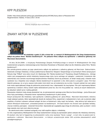 KPP PLESZEW Źródło: http://www.pleszew.policja.gov.pl/w20/aktualnosci/97299,Znany-aktor-w-Pleszewie.html Wygenerowano: Sobota, 4 marca 2017, 03:42 Strona znajduje się w archiwum. ZNANY AKTOR W PLESZEWIE W niedzielę o godz.11.00 w kinie Hel w ramach IX Wielkopolskich Dni Stop Uzależnieniom odbył się pokaz filmu "Boisko bezdomnych". Po pokazie filmu odbyło się spotkanie z odtwórca głównej roli Marcinem Dorocińskim. W dniu 26.04.2009r. z inicjatywy Powiatowego Zespołu Profilaktycznego w ramach IX Wielkopolskich Dni Stop Uzależnieniom programu realizowanego przez Starostwo Powiatowe w Pleszewie odbył się dla młodzieży pokaz filmu "Boisko bezdomnych". Dla uatrakcyjnienia pokazu po jego zakończeniu odbyło się spotkanie z odtwórcą głównej roli Marcinem Dobrocińskim, doskonale znanego młodzieży z kreacji podkomisarza Sławomira 'Despero' Desperskiego w kryminalnym filmie sensacyjnym Patryka Vegi "PitBull" oraz wielu innych ról. Wybierając film "Boisko bezdomnych" Powiatowy Zespół Profilaktyczny , którego celem jest propagowanie wśród młodzieży bezpiecznego stylu życia wolnego od nałogów i uzależnień, krzewienie idei wolontariatu oraz szeroko rozumianego bezpieczeństwa młodzieży starał się przekazać, że dzięki swojej pasji, człowiek może wydostać się z kłopotów oraz nałogów. Boisko bezdomnych to opowieść o sile, która płynie z przyjaźni i pasji. Film Kasi Adamik pokazuje, że w życiu zawsze tylko jeden krok dzieli nas od znalezienia się na dnie. Czasami jednak ten sam jeden krok może zapoczątkować drogę do pokonania przeciwności losu i doprowadzić do zwycięstwa. Film jest inspirowaną faktami opowieścią o ludziach, którzy zostali ciężko doświadczeni przez los, lecz nie chcą poddać się - walczą ze swymi słabościami, by odzyskać radość życia i ludzką godność. Pleszewska młodzież miała okazję dowiedzieć się ,że pierwowzorem granego przez Marcina Dorocińskiego – Jacka Mroza jest Artur Hyży pochodzący z Pleszewa trener reprezentacji bezdomnych w piłce nożnej. Dużym przeżyciem dla młodzieży było spotkanie z odtwórcą głównej roli Jacka Mroza - Marcinem Dorocińskim, któremu mogli zadawać pytania. Aktor opowiadał jak doszło do realizacji filmu, wspominał z rozbawieniem o tym, jak w przerwie zdjęć wspólnie z Erykiem Lubosem usiłował wstąpić do baru w Katowicach, żeby napić się herbaty - obaj aktorzy byli wówczas w swoich filmowych kostiumach, ucharakteryzowani na bezdomnych. W trzech barach nie chciano nam sprzedać herbaty, chociaż mieliśmy pieniądze - stwierdził Dorociński. Opowiadał jak wyglądała jego droga do aktorstwa, jakie są blaski i cienie tego zawodu oraz nad czym obecnie pracuje. Na zakończenie aktor rozdawał autografy oraz robił wspólne zdjęcia z młodzieżą. Co roku organizatorzy Wielkopolskich Dni Stop Uzależnieniom starają się wprowadzić jakieś ciekawe dla młodzieży elementy. W zeszłym roku był to happening na pleszewskim rynku oraz wystawa "Życie z pasją" , w tym roku na pewno jest to spotkanie z aktorem ponadgimnazjalnych. Marcinem Dorocinskim , w którym uczestniczyło około 150 uczniów pleszewskich szkół Ocena: 0/5 (0) Tweetnij