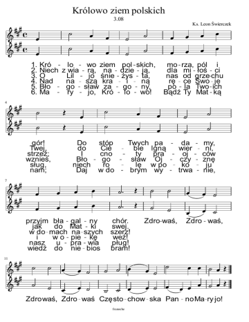 Królowo ziem polskich 3.08 Ks. Leon Świerczek 1. 2. 3. 4. 5. 6. Kró lo wo ziem pol skich, Niech z wia rą, na dzie ją, O Lil jo śnie żys ta, Nad na szą kra i ną Bło go sław za go ny, Ma ry jo, Kró lo wo! mo rza, pól i dla mi łoś ci nas od grze chu rę ce Swo je po la Two ich Bądź Ty Mat ką 4 gór! Twej, strzeż; wznieś, sług, nam; Do do I Bło niech Daj stóp Cie cno go ro w do Twych pa bie lgną ty pra sław Oj lę w po brym wy da wier oj czy ko trwa my, ni, ców znę ju nie, 7 przyjm bła jak do w do mach i wo nasz u wiedź do gal ny Mat ki na szych pie kę pra wia nie bios chór. swej. szerz! weź! pług! bram! Zdro waś, Zdro waś, 11 Zdrowaś, Zdro waś Często chow ska Pan noMa ry jo! franoche