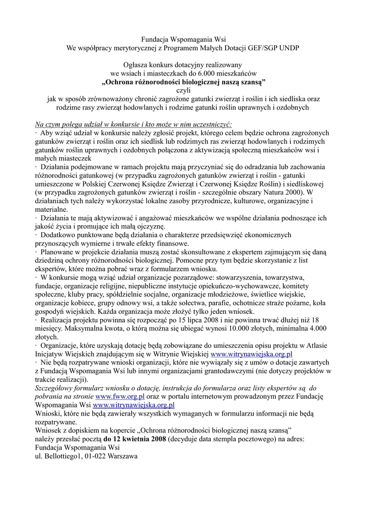 Fundacja Wspomagania Wsi We współpracy merytorycznej z Programem Małych Dotacji GEF/SGP UNDP Ogłasza konkurs dotacyjny realizowany we wsiach i miasteczkach do 6.000 mieszkańców „Ochrona różnorodności biologicznej naszą szansą” czyli jak w sposób zrównoważony chronić zagrożone gatunki zwierząt i roślin i ich siedliska oraz rodzime rasy zwierząt hodowlanych i rodzime gatunki roślin uprawnych i ozdobnych Na czym polega udział w konkursie i kto może w nim uczestniczyć: · Aby wziąć udział w konkursie należy zgłosić projekt, którego celem będzie ochrona zagrożonych gatunków zwierząt i roślin oraz ich siedlisk lub rodzimych ras zwierząt hodowlanych i rodzimych gatunków roślin uprawnych i ozdobnych połączona z aktywizacją społeczną mieszkańców wsi i małych miasteczek · Działania podejmowane w ramach projektu mają przyczyniać się do odradzania lub zachowania różnorodności gatunkowej (w przypadku zagrożonych gatunków zwierząt i roślin - gatunki umieszczone w Polskiej Czerwonej Księdze Zwierząt i Czerwonej Księdze Roślin) i siedliskowej (w przypadku zagrożonych gatunków zwierząt i roślin - szczególnie obszary Natura 2000). W działaniach tych należy wykorzystać lokalne zasoby przyrodnicze, kulturowe, organizacyjne i materialne. · Działania te mają aktywizować i angażować mieszkańców we wspólne działania podnoszące ich jakość życia i promujące ich małą ojczyznę. · Dodatkowo punktowane będą działania o charakterze przedsięwzięć ekonomicznych przynoszących wymierne i trwałe efekty finansowe. · Planowane w projekcie działania muszą zostać skonsultowane z ekspertem zajmującym się daną dziedziną ochrony różnorodności biologicznej. Pomocne przy tym będzie skorzystanie z list ekspertów, które można pobrać wraz z formularzem wniosku. · W konkursie mogą wziąć udział organizacje pozarządowe: stowarzyszenia, towarzystwa, fundacje, organizacje religijne, niepubliczne instytucje opiekuńczo-wychowawcze, komitety społeczne, kluby pracy, spółdzielnie socjalne, organizacje młodzieżowe, świetlice wiejskie, organizacje kobiece, grupy odnowy wsi, a także sołectwa, parafie, ochotnicze straże pożarne, koła gospodyń wiejskich. Każda organizacja może złożyć tylko jeden wniosek. · Realizacja projektu powinna się rozpocząć po 15 lipca 2008 i nie powinna trwać dłużej niż 18 miesięcy. Maksymalna kwota, o którą można się ubiegać wynosi 10.000 złotych, minimalna 4.000 złotych. · Organizacje, które uzyskają dotację będą zobowiązane do umieszczenia opisu projektu w Atlasie Inicjatyw Wiejskich znajdującym się w Witrynie Wiejskiej www.witrynawiejska.org.pl · Nie będą rozpatrywane wnioski organizacji, które nie wywiązały się z umów o dotacje zawartych z Fundacją Wspomagania Wsi lub innymi organizacjami grantodawczymi (nie dotyczy projektów w trakcie realizacji). Szczegółowy formularz wniosku o dotację, instrukcja do formularza oraz listy ekspertów są do pobrania na stronie www.fww.org.pl oraz w portalu internetowym prowadzonym przez Fundację Wspomagania Wsi www.witrynawiejska.org.pl Wnioski, które nie będą zawierały wszystkich wymaganych w formularzu informacji nie będą rozpatrywane. Wniosek z dopiskiem na kopercie „Ochrona różnorodności biologicznej naszą szansą” należy przesłać pocztą do 12 kwietnia 2008 (decyduje data stempla pocztowego) na adres: Fundacja Wspomagania Wsi ul. Bellottiego1, 01-022 Warszawa