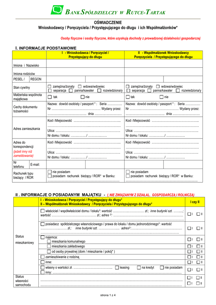 BANK SPÓŁDZIELCZY W RUTCE-TARTAK OŚWIADCZENIE Wnioskodawcy / Poręczyciela / Przystępującego do długu i ich Współmałżonków* Osoby fizyczne i osoby fizyczne, które uzyskują dochody z prowadzonej działalności gospodarczej I. INFORMACJE PODSTAWOWE I - Wnioskodawca / Poręczyciel / Przystępujący do długu II - Współmałżonek Wnioskodawcy Poręczyciela / Przystępującego do długu Imiona i Nazwisko Imiona rodziców PESEL / REGON Stan cywilny zamężna/żonaty wdowa/wdowiec separacja panna/kawaler rozwiedziona/y zamężna/żonaty wdowa/wdowiec separacja panna/kawaler rozwiedziona/y Małżeńska wspólnota majątkowa tak tak nie nie Cechy dokumentu tożsamości Nazwa: dowód osobisty / paszport * : Seria …………… Nazwa: dowód osobisty / paszport * : Seria …………… Nr ………..………………………………… Wydany przez: Nr ………..………………………………… Wydany przez: ............................................... dnia ................................. ............................................... dnia ................................. Adres zamieszkania Kod i Miejscowość ………………………………………... …………………..………………..………..………………… Ulica: …………………………..…..…….…………………. Nr domu / lokalu: …….………/ ………….…… Kod i Miejscowość ………………………………………... …………………..………………..………..………………… Ulica: …………………………..…..…….…………………. Nr domu / lokalu: …….………/ ………….…… Adres do korespondencji (jeżeli inny niż zameldowania) Kod i Miejscowość ………………………………………... …………………..………………..………..………………… Ulica: …………………………..…..…….…………………. Nr domu / lokalu: …….………/ ………….…… Kod i Miejscowość ………………………………………... …………………..………………..………..………………… Ulica: …………………………..…..…….…………………. Nr domu / lokalu: …….………/ ………….…… nie posiadam posiadam rachunek bieżący / ROR* w Banku: ....................................................................................... nie posiadam posiadam rachunek bieżący / ROR* w Banku: ....................................................................................... Nr telefonu E-mail: Rachunek typu bieżący / ROR II . INFORMACJE O POSIADANYM MAJĄTKU - ( NIE ZWIĄZANYM Z DZIAŁAL. GOSPODARCZĄ I ROLNICZĄ) I - Wnioskodawca / Poręczyciel / Przystępujący do długu* II – Współmałżonek Wnioskodawcy / Poręczyciela / Przystępującego do długu* Status mieszkaniowy Status własności samochodu właściciel / współwłaściciel domu / lokalu*: wartość ……………..…………… zł.; inne budynki szt. ……....; wartość ……………………………………… zł.; adres 2/: ……………………………..……………………………… ………………………………………………………………………………………….…………………………………… posiadacz spółdzielczego własnościowego / prawa do lokalu / domu jednorodzinnego*: wartość ………………...…… zł.; inne budynki szt. ……………….... adres2/:……..………………..…………………… …………………………………………………………………………………………………..……………………… najemca: mieszkania komunalnego mieszkania zakładowego od osoby prywatnej (dom / mieszkanie / pokój* ) zamieszkiwanie z rodziną inne: własny o wartości zł. ……………………………….... leasing na kredyt nie posiadam inny: ............................................................................................................................................................ ............................................................................................................................................................................ ........................................................................................................................................................................... strona 1 z 4 I czy II I II I II I II I II I II I II I II I II I II I II I - Wnioskodawca / Poręczyciel / Przystępujący do długu* II – Współmałżonek Wnioskodawcy / Poręczyciela / Przystępującego do długu* Oszczędności (kwota, waluta, okres lokaty) Papiery wartościowe (ilość, artość) Inne (np. gosp. rolne) : I czy II ............................................................................................................................................................................ ........................................................................................................................................................................... I I II II ............................................................................................................................................................................ ........................................................................................................................................................................... ............................................................................................................................................................................ ........................................................................................................................................................................... I I I I III. INFORMACJE O DOCHODACH I WYDATKACH I Miesięczny dochód netto : Źródła dochodu II - Współmałżonek: Wnioskodawcy / Poręczyciela / Przystępu