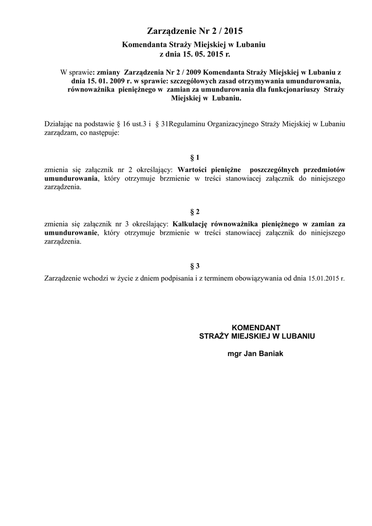 Zarządzenie Nr 2 / 2015 Komendanta Straży Miejskiej w Lubaniu z dnia 15. 05. 2015 r. W sprawie: zmiany Zarządzenia Nr 2 / 2009 Komendanta Straży Miejskiej w Lubaniu z dnia 15. 01. 2009 r. w sprawie: szczegółowych zasad otrzymywania umundurowania, równoważnika pieniężnego w zamian za umundurowania dla funkcjonariuszy Straży Miejskiej w Lubaniu. Działając na podstawie § 16 ust.3 i § 31Regulaminu Organizacyjnego Straży Miejskiej w Lubaniu zarządzam, co następuje: §1 zmienia się załącznik nr 2 określający: Wartości pieniężne poszczególnych przedmiotów umundurowania, który otrzymuje brzmienie w treści stanowiacej załącznik do niniejszego zarządzenia. §2 zmienia się załącznik nr 3 określający: Kalkulację równoważnika pieniężnego w zamian za umundurowanie, który otrzymuje brzmienie w treści stanowiacej załącznik do niniejszego zarządzenia. §3 Zarządzenie wchodzi w życie z dniem podpisania i z terminem obowiązywania od dnia 15.01.2015 r. KOMENDANT STRAŻY MIEJSKIEJ W LUBANIU mgr Jan Baniak Załącznik nr 2 do Zarządzenia Nr 2 / 2015 Komendanta SM w Lubaniu Wartość pieniężna poszczególnych przedmiotów umundurowania Przedmioty umundurowania służbowego 1) czapka służbowa okrągła ciemnogranatowa z otokiem w szachownicę żółto-granatową 2) spodnie ciemny granat z lampasem żółtym-letnie 3) spodnie narciarskie z lampasem żółtym-zimowe 4) koszula w kolorze błękitnym długi rękaw 5) koszula w kolorze błękitnym krótki rękaw 6) sweter ciemnogranatowy 7) czapka zimowa ciemnogranatowa z nausznikami 8) kurtka zimowa ¾ ciemnogranatowa 9) kurtka uniwersalna krótka, wiatrówka 10) olimpijka 11) czapka letnia typu baseball ciemnogranatowa 12) koszulobluza 13) kapelusz damski 14) spódnica Przedmioty uzupełniające do umundurowania 1) półbuty w kolorze czarnym 2) buty zimowe w kolorze czarnym 3) szalik w kolorze ciemnogranatowym 4) krawat w kolorze czarnym 5) rękawiczki w kolorze czarnym 6) skarpety letnie ciemnogranatowe 7) skarpety zimowe ciemnogranatowe 8) ocieplacz w kolorze ciemnogranatowym 9) peleryna - sztormiak 10) pas główny skórzany czarny 11) podkoszulka letnia 12) podkoszulka zimowa 13) kalesony 14) kamizelka ostrzegawcza Przedmioty umundurowania specjalnego 1) kombinezon 2) spodnie Przedmioty umundurowania wyjściowego 1) koszula biała długi rękaw 2) koszula biała krótki rękaw 3) spódnica 4) czapka garnizonowa 5) kapelusz damski 6) mundur wyjściowy Wartość zł 57,00 124,00 144,00 48,00 44,00 106,00 58,00 231,00 200,00 170,00 27,00 63,00 130,00 82,00 Wartość zł 109,00 209,00 16,00 14,00 62,00 4,00 7,00 135,00 138,00 41,00 20,00 30,00 20,00 60,00 Wartość zł 220,00 119,00 Wartość zł 42,00 39,00 82,00 70,00 130,00 549,00 Wysokość kwot-cen składników mundurowych ustala się na podstawie aktualnych cenników centrali zaopatrzenia mundurowego dla Straży Gminnych ( Miejskich ). Załącznik nr 3 do Zarządzenia Nr 2 / 2015 Komendanta SM w Lubaniu Kalkulacja równoważnika pieniężnego w zamian za umundurowanie Przedmioty umundurowania służbowego 1)czapka służbowa okrągła ciemnogranatowa z otokiem w szachownicę żółto-granatową 2) spodnie ciemny granat z lampasem żółtym-letnie 3) spodnie narciarskie z lampasem żółtym-zimowe 4) koszula w kolorze błękitnym długi rękaw 5) koszula w kolorze błękitnym krótki rękaw 6) sweter ciemnogranatowy 7) czapka zimowa ciemnogranatowa z nausznikami 8) kurtka zimowa ¾ ciemnogranatowa 9) kurtka uniwersalna krótka, wiatrówka 10) olimpijka 11) czapka letnia typu baseball ciemnogranatowa 12) koszulobluza 13)kapelusz damski 14) spódnica Ilość Okres szt. w latach Wartość Koszt zł całkowity Koszt roczny 1 1 2 2 2 1 1 1 1 1 2 1 1 1 3 2 3 1 1 2 3 3 3 2 3 2 3 2 57,00 124,00 144,00 48,00 44,00 106,00 58,00 231,00 200,00 170,00 27,00 63,00 130,00 82,00 57,00 124,00 288,00 96,00 88,00 106,00 58,00 231,00 200,00 170,00 54,00 63,00 130,00 82,00 19,00 62,00 96,00 96,00 88,00 53,00 19,00 77,00 67,00 85,00 18,00 32,00 43,00 41,00 1 2 1 1 1 2 2 1 1 1 1 2 2 1 1 3 3 2 2 1 1 3 5 4 2 2 2 2 109,00 209,00 16,00 14,00 62,00 4,00 7,00 135,00 138,00 41,00 20,00 30,00 20,00 60,00 109,00 418,00 16,00 14,00 62,00 8,00 14,00 135,00 138,00 41,00 20,00 60,00 40,00 60,00 109,00 139,00 5,00 7,00 31,00 8,00 14,00 45,00 28,00 10,00 10,00 30,00 20,00 30,00 1 1 3 3 220,00 119,00 220,00 119,00 73,00 40,00 1 1 1 1 1 1 3 3 5 5 5 5 42,00 39,00 82,00 70,00 130,00 549,00 42,00 39,00 82,00 70,00 130,00 549,00 14,00 13,00 16,00 14,00 26,00 110,00 Przedmioty uzupełniające do umundurowania 1) półbuty w kolorze czarnym 2) buty zimowe w kolorze czarnym 3) szalik w kolorze ciemnogranatowym 4) krawat w kolorze czarnym 5) rękawiczki w kolorze czarnym 6) skarpety letnie ciemnogranatowe 7) skarpety zimowe ciemnogranatowe 8) ocieplacz w kolorze ciemnogranatowym 9) peleryna - sztormiak 10) pas główny skórzany czarny 11) podkoszulka letnia 12) podkoszulka zimowa 13) kalesony 14) kamizelka ostrzegawcza Przedmioty umundurowania specjalnego 1) kombinezon 3) spodnie Przedmioty umundurowania wyjściowego 1) koszula biała długi rękaw 2) koszula biała krótki rękaw 3) spódnica 4) czapka garnizonowa 5) kapelusz damski 6) mundur wyjściowy Łącznie koszt roczny 1.588,00
