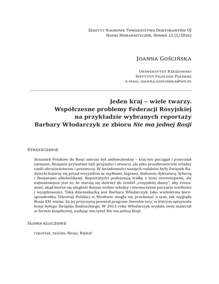 Zeszyty Naukowe Towarzystwa Doktorantów UJ Nauki Humanistyczne, Numer 12 (1/2016) Joanna Gościńska Uniwersytet Rzeszowski Instytut Filologii Polskiej e-mail: [email protected] Jeden kraj – wiele twarzy. Współczesne problemy Federacji Rosyjskiej na przykładzie wybranych reportaży Barbary Włodarczyk ze zbioru Nie ma jednej Rosji Streszczenie Stosunek Polaków do Rosji zawsze był ambiwalentny – kraj ten pociągał i przerażał zarazem. Rosjanie prywatnie byli przyjaźni i otwarci, ale jako przedstawiciele władzy razili okrucieństwem i przemocą. W świadomości naszych rodaków były Związek Radziecki kojarzy się przed wszystkim ze zsyłkami, łagrami, Stalinem, dyktaturą, Syberią i Rosjanami alkoholikami. Reportażyści podejmują walkę z tymi stereotypami, ale najważniejsze jest to, że starają się dotrzeć do źródeł „rosyjskiej duszy”, aby zrozumieć, skąd bierze się uległość Rosjan wobec władzy i równoczesne poczucie wielkości i wyjątkowości. Taką dziennikarką jest Barbara Włodarczyk. Jako wieloletnia korespondentka Telewizji Polskiej w Moskwie mogła się przekonać o tym, jak wygląda Rosja XXI wieku. Za jej przyczyną powstał program Szerokie tory, w którym opisywała kraje byłego Związku Radzieckiego. W 2013 roku Włodarczyk wydała swój materiał w formie książkowej, nadając mu tytuł Nie ma jednej Rosji. Słowa kluczowe reportaż, rasizm, Rosja, Bajkał 36 Joanna Gościńska Wstęp Nam [Polakom] obraz Rosji przypomina film z migawkowych ujęć. O tym, co dzieje się za Bugiem i Dnieprem, jesteśmy informowani nawet dość obficie i szczegółowo. Korespondenci ślą faks za faksem o zamachach, potyczkach, intrygach, aferach, gafach i chorobach dostojników. Jednakże oglądamy drzewa, nie widzimy zaś lasu. J. Pomianowski, Ruski miesiąc z hakiem1 Wydaje się, że autor tych słów, Jerzy Pomianowski, ma dużo racji, chociażby z tego względu, że w świadomości naszych rodaków Rosja kojarzy się przede wszystkim z dziewiętnastowiecznymi zsyłkami, łagrami, Stalinem, dyktaturą, Syberią i Rosjanami alkoholikami, a wiedza przeciętnego Polaka na temat naszych wschodnich sąsiadów najczęściej ogranicza się do spraw politycznych, i to tylko tych, które są dostępne w mediach masowych. Mało kto orientuje się, jak wygląda życie w syberyjskiej tajdze albo czy mieszkańcy pochodzący z Kaukazu mogą pracować w Moskwie. Oczywiście nie jest możliwe, aby każdy mógł zwiedzić Rosję, by odkryć jej tajemnice. Dobrą alternatywą w takim wypadku wydaje się sięgnięcie po reportaże literackie, które niejednokrotnie ukazują czytelnikom świat, o jakim często nie mieli pojęcia. Tego typu literatura łączy rzetelność dziennikarską oraz literackie sposoby kreowania świata. Jednym z wybitniejszych polskich reportażystów piszących o Rosji był Ryszard Kapuściński, autor Imperium. O naszych wschodnich sąsiadach pisali również Mariusz Wilk, Jacek Hugo-Bader, Igor T. Miecik czy Barbara Włodarczyk. Ostatnia z wymienionych to autorka zbioru reportaży zatytułowanych Nie ma jednej Rosji, które w niniejszym szkicu zostaną poddane szczegółowej analizie. Będzie to próba ukazania problemów Rosji XXI wieku od „wewnątrz” na wybranych przykładach. Barbara Włodarczyk – dziennikarka i pisarka Autorka cyklu jest obecnie jedną z najbardziej znanych i rozpoznawalnych dziennikarek. Po ukończeniu studiów na Wydziale Dziennikarstwa i Nauk Politycznych Uniwersytetu Warszawskiego podjęła pracę zawodową w Telewizji Polskiej. Lata 2004–2009 spędziła w Moskwie, pracując jako korespondentka. Obecnie pełni funkcję komentatorki politycznej w polskiej telewizji. Nakładem Wydawnictwa Literackiego w maju 2013 roku ukazała się jej pierwsza książka, która jest zbiorem reportaży opisujących kraje byłego Związku J. Pomianowski, Ruski miesiąc z hakiem, Wrocław 1997, s. 226. 1 Jeden kraj – wiele twarzy... 37 Radzieckiego. Autorka nadała jej tytuł Nie ma jednej Rosji, który jest polemiką z nazwą kremlowskiej partii – Jedna Rosja2. Czytając reportaże polskiej dziennikarki, odnosi się wrażenie, że hasła polityczne głoszone przez tak zwaną „partię władzy” zdecydowanie różnią się od stanu faktycznego. Nowobogacka Rosja i bezdomni, mieszkający na dworcu, szkoła kadetek i neofaszystowskie ugrupowanie, kult Lenina i „Rosja bez Putina” – są to jedne z przykładowych „sprzeczności”, które Włodarczyk ukazała w swoim zbiorze, udowadniając jednocześnie, że „jedna Rosja” to sformułowanie niewłaściwe. „Siedemnaście twarzy Rosji” Włodarczyk, opisując poszczególnych bohaterów, dodaje swoje osobiste odczucia wynikające ze spotkania. Dzięki tym refleksjom każdy z czytelników, nawet ten, który nie orientuje się w dzisiejszej polityce czy kulturze Rosji, jest w stanie dostrzec, jakie problemy próbuje wyeksponować dziennikarka. Często powołuje się również na dane statystyczne, wydarzenia historyczne czy nazwy geograficzne, które stara się od razu wyjaśniać, dzięki czemu zwiększa krąg czytelników, którzy pomimo braku fachowej wiedzy chętnie sięgają po jej zbiór3. Całość publikacji zbudowana jest z siedemnastu historii: ośmiu kobiecych i dziewięciu męskich. Intrygujące jest to, że bohaterowie Włodarczyk to mieszkańcy nie tylko Moskwy, ale też „głubinki” oraz tajgi. Łącząc w jednej książce tak skrajne historie, dziennikarka pokazuje, że Rosja jest pięknym, ale też bardzo zróżnicowanym krajem4. Do istniejącego już stanu badań dotyczących współczesnych problemów Rosji dokłada trafne spostrzeżenia reporterskie, które są ciekawym uzupełnieniem naukowych ustaleń. Zbiór Nie ma jednej Rosji można czytać wybiórczo, ponieważ każdy z reportaży jest samodzielną opowieścią, lub całościowo, traktując go jako źródło cennych informacji na temat ludzi żyjących za wschodnią granicą. W publikacji z