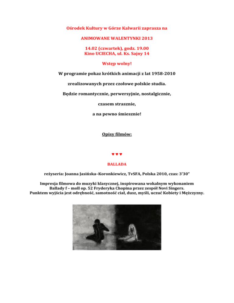 Ośrodek Kultury w Górze Kalwarii zaprasza na ANIMOWANE WALENTYNKI 2013 14.02 (czwartek), godz. 19.00 Kino UCIECHA, ul. Ks. Sajny 14 Wstęp wolny! W programie pokaz krótkich animacji z lat 1958-2010 zrealizowanych przez czołowe polskie studia. Będzie romantycznie, perwersyjnie, nostalgicznie, czasem strasznie, a na pewno śmiesznie! Opisy filmów: ♥♥♥ BALLADA reżyseria: Joanna Jasińska–Koronkiewicz, TvSFA, Polska 2010, czas: 3’30” Impresja filmowa do muzyki klasycznej, inspirowana wokalnym wykonaniem Ballady f – moll op. 52 Fryderyka Chopina przez zespół Novi Singers. Punktem wyjścia jest odrębność, samotność ciał, dusz, myśli, uczuć Kobiety i Mężczyzny. ♥♥♥ W SZPONACH SEKSU reżyseria: Julian Józef Antonisz, SMF, Polska 1969, czas: 9’ W odpowiedzi na ogłoszenie młodej kobiety: mam mieszkanie, szukam mężczyzny, którego pokocham na kolorowo, zgłasza się wielu kandydatów… NAGRODY: MFF Tours ’78 > Nagroda Jury. ♥♥♥ DRZAZGA reżyseria: Wojciech Wawszczyk, ANIMA-POL, Polska 2008, czas: 17’ Kto powiedział, że parkowa ławka nie ma prawa do uczuć?! Urzekająca historia miłości drewnianej ławki do pewnej młodej dziewczyny, zrealizowana przez Wojciecha Wawszczyka, późniejszego współtwórcę JEŻA JERZEGO. Nagroda na Międzynarodowym Festiwalu Filmowym „Nowe Horyzonty” w kategorii filmów animowanych. ♥♥♥ DRESZCZOWIEC reżyseria: Bogdan Nowicki, SMF, Polska 1972, czas: 7’51” Składanka epizodów o tematyce miłosnej, które mają mniej lub bardziej złowieszcze zakończenie… ♥♥♥ SYCYLIJSKA PCHŁA reżyseria: Marcin Giżycki, Serafiński Studio, Polska 2008, czas: 7’58” Zrealizowana za pomocą pocztówek z przełomu XIX i XX w., nostalgiczna „rekonstrukcja” ostatniego romansu gwiazd kina niemego - Poli Negri i Rudolfa Valentino. NAGRODY: MFF „Nowe Horyzonty” 2009 > Wyróżnienie w konkursie „Polskie Filmy Krótkometrażowe” w kat. filmów animowanych. ♥♥♥ OCZEKIWANIE reżyseria: Witold Giersz, Ludwik Perski, SMF, Polska 1962, czas: 9′ Jedyny film lalkowy w dorobku Witolda Giersza. Przepięknie opowiedziana historia pojedynku dwóch mężczyzn o względy damy, przedstawiona przez figurki wykonane z kawiarnianych serwetek. ♥♥♥ WYSPA GIBONÓW reżyseria: Małgorzata Bosek, Serafiński Studio, Polska 2010, czas: 8’45″ Animowany komediodramat psychologiczny. Niewinna wizyta w zoo staje się dla pary bohaterów pretekstem do refleksji nad własnym życiem. Rzecz o skrajnie odmiennym widzeniu tego samego, niedocenianiu cudzej pracy, równowadze przeciwieństw oraz niezwykle trudnej sztuce bycia w związku. NAGRODY: Kraków (Ogólnopolski Festiwal Autorskich Filmów Animowanych)-Wyróżnienie; Łódź (Se-Ma-For Film Festival)-Nagroda dla najlepszego reżysera; Katowice (Międzynarodowy Festiwal Filmowy „Ars Independent”)-Wyróżnienie w Konkursie Animacji. ♥♥♥ ZMIANA WARTY reżyseria: Halina Bielińska, Włodzimierz Haupe, SMF, PL 1958, czas: 08’06″ Historia płomiennego romansu pomiędzy księżniczką a strażnikiem, rozegrana przez… pudełka od zapałek! NAGRODY: MFF Cannes > I Nagroda w kat. filmów krótkometrażowych za oryginalny pomysł (ex aequo), MFF Mannheim > Wyróżnienie Specjalne, MFF Edynburg > Dyplom Honorowy Nagroda Roy Thompsona ♥♥♥ ŚWITEZIANKA reżyseria: Anna Dudek, TvSFA, PL 2010, czas: 3’30″ Autorski film animowany inspirowany utworem Fryderyka Chopina pt. Ballada op. 23 nr 1 w wykonaniu Artura Rubinsteina i motywami z ballady Adama Mickiewicza „Świtezianka”. Nostalgiczny rytm muzyki, wizualizowany jest przez ręcznie malowane ekolinami barwy i kształty, które synchronicznie budują w przestrzeni kadru opowieść o miłości i zdradzie. ♥♥♥ LOVE GAMESTATION reżyseria: Paweł Borowski, SFA, PL 2001, czas: 11’05″ Pełna absurdalnego humoru historia dotycząca relacji damsko-męskich we współczesnym świecie. Bohater wikła się w związek z Barbie. Jak się później okazuje, jest to związek toksyczny. NAGRODY: OFAFA Kraków ’01 > Srebrna Kreska za „szczególne walory plastyczne”. ♥♥♥ JONTEK reżyseria: Wiesław Zięba, SMF, PL 1983, czas: 2’28″ Żart filmowy inspirowany operą HALKA Stanisława Moniuszki i Włodzimierza Wolskiego.