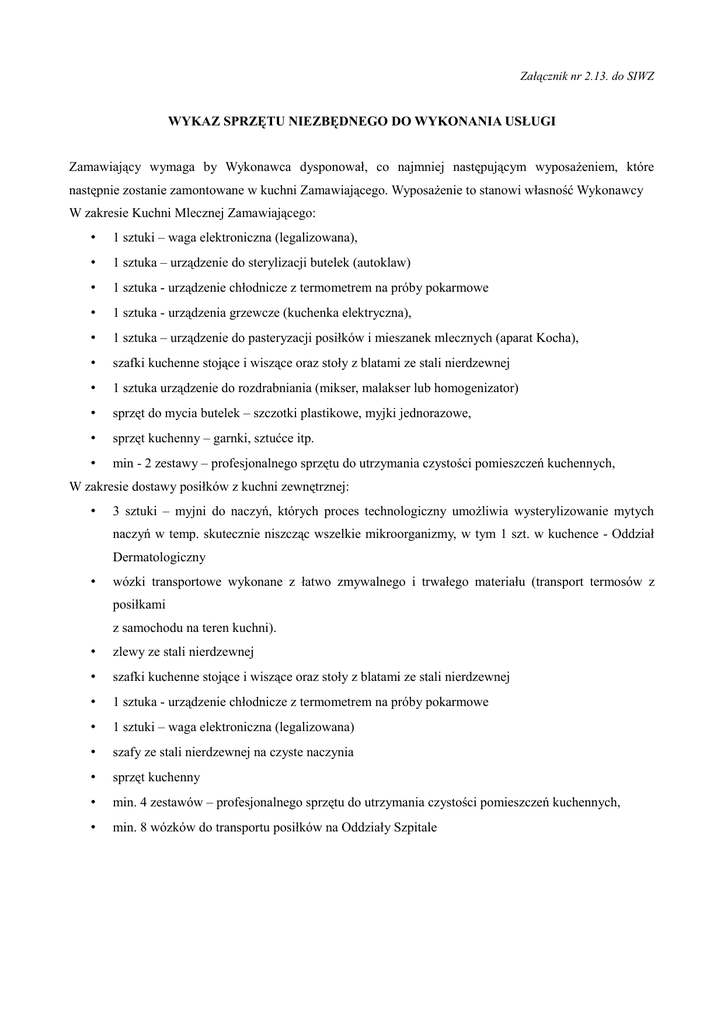 Załącznik nr 2.13. do SIWZ WYKAZ SPRZĘTU NIEZBĘDNEGO DO WYKONANIA USŁUGI Zamawiający wymaga by Wykonawca dysponował, co najmniej następującym wyposażeniem, które następnie zostanie zamontowane w kuchni Zamawiającego. Wyposażenie to stanowi własność Wykonawcy W zakresie Kuchni Mlecznej Zamawiającego: • 1 sztuki – waga elektroniczna (legalizowana), • 1 sztuka – urządzenie do sterylizacji butelek (autoklaw) • 1 sztuka - urządzenie chłodnicze z termometrem na próby pokarmowe • 1 sztuka - urządzenia grzewcze (kuchenka elektryczna), • 1 sztuka – urządzenie do pasteryzacji posiłków i mieszanek mlecznych (aparat Kocha), • szafki kuchenne stojące i wiszące oraz stoły z blatami ze stali nierdzewnej • 1 sztuka urządzenie do rozdrabniania (mikser, malakser lub homogenizator) • sprzęt do mycia butelek – szczotki plastikowe, myjki jednorazowe, • sprzęt kuchenny – garnki, sztućce itp. • min - 2 zestawy – profesjonalnego sprzętu do utrzymania czystości pomieszczeń kuchennych, W zakresie dostawy posiłków z kuchni zewnętrznej: • 3 sztuki – myjni do naczyń, których proces technologiczny umożliwia wysterylizowanie mytych naczyń w temp. skutecznie niszcząc wszelkie mikroorganizmy, w tym 1 szt. w kuchence - Oddział Dermatologiczny • wózki transportowe wykonane z łatwo zmywalnego i trwałego materiału (transport termosów z posiłkami z samochodu na teren kuchni). • zlewy ze stali nierdzewnej • szafki kuchenne stojące i wiszące oraz stoły z blatami ze stali nierdzewnej • 1 sztuka - urządzenie chłodnicze z termometrem na próby pokarmowe • 1 sztuki – waga elektroniczna (legalizowana) • szafy ze stali nierdzewnej na czyste naczynia • sprzęt kuchenny • min. 4 zestawów – profesjonalnego sprzętu do utrzymania czystości pomieszczeń kuchennych, • min. 8 wózków do transportu posiłków na Oddziały Szpitale