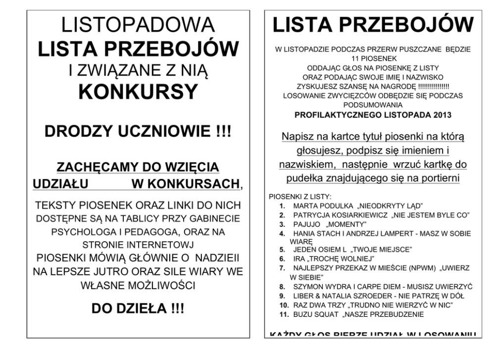 LISTOPADOWA LISTA PRZEBOJÓW I ZWIĄZANE Z NIĄ KONKURSY LISTA PRZEBOJÓW W LISTOPADZIE PODCZAS PRZERW PUSZCZANE BĘDZIE 11 PIOSENEK ODDAJĄC GŁOS NA PIOSENKĘ Z LISTY ORAZ PODAJĄC SWOJE IMIĘ I NAZWISKO ZYSKUJESZ SZANSĘ NA NAGRODĘ !!!!!!!!!!!!!!!! LOSOWANIE ZWYCIĘZCÓW ODBĘDZIE SIĘ PODCZAS PODSUMOWANIA PROFILAKTYCZNEGO LISTOPADA 2013 DRODZY UCZNIOWIE !!! ZACHĘCAMY DO WZIĘCIA UDZIAŁU W KONKURSACH, TEKSTY PIOSENEK ORAZ LINKI DO NICH DOSTĘPNE SĄ NA TABLICY PRZY GABINECIE PSYCHOLOGA I PEDAGOGA, ORAZ NA STRONIE INTERNETOWJ PIOSENKI MÓWIĄ GŁÓWNIE O NADZIEII NA LEPSZE JUTRO ORAZ SILE WIARY WE WŁASNE MOŻLIWOŚCI DO DZIEŁA !!! Napisz na kartce tytuł piosenki na którą głosujesz, podpisz się imieniem i nazwiskiem, następnie wrzuć kartkę do pudełka znajdującego się na portierni PIOSENKI Z LISTY: 1. MARTA PODULKA „NIEODKRYTY LĄD” 2. PATRYCJA KOSIARKIEWICZ „NIE JESTEM BYLE CO” 3. PAJUJO „MOMENTY” 4. HANIA STACH I ANDRZEJ LAMPERT - MASZ W SOBIE WIARĘ 5. JEDEN OSIEM L „TWOJE MIEJSCE” 6. IRA „TROCHĘ WOLNIEJ” 7. NAJLEPSZY PRZEKAZ W MIEŚCIE (NPWM) „UWIERZ W SIEBIE” 8. SZYMON WYDRA I CARPE DIEM - MUSISZ UWIERZYĆ 9. LIBER & NATALIA SZROEDER - NIE PATRZĘ W DÓŁ 10. RAZ DWA TRZY „TRUDNO NIE WIERZYĆ W NIC” 11. BUZU SQUAT „NASZE PRZEBUDZENIE KAŻDY GŁOS BIERZE UDZIAŁ W LOSOWANIU KONKURS LITERACKI TEKST ZAINSPIROWANY PIOSENKĄ 1. WSŁUCHAJ SIĘ W TEKSTY PIOSENEK GRANYCH W SZKOLE W LISTOPADZIE / TEKSTY DOSTĘPNE SĄ NA TABLICY PRZY GABINECIE PEDAGOGA I PSYCHOLOGA, A TAKŻE W INTERNECIE NA STRONIE TEKSTOWO / 2. WYBIEŻ FRAGMENT PIOSENKI, KTÓRY CIĘ W SPOSÓB SZCZEGÓLNY PORUSZYŁ 3. STWÓRZ WIERSZ, OPOWIADANIE, ROZPRAWKĘ LUB INNY TEKST NAWIĄZUJĄCY DO WYBRANEGO PRZEZ CIEBIE „CYTATU” KONKURS PLASTYCZNY ILUSTRACJA DO PIOSENKI 1. WSŁUCHAJ SIĘ W MUZYKĘ ORAZ TEKSTY PIOSENEK GRANYCH W SZKOLE W LISTOPADZIE / TEKSTY DOSTĘPNE SĄ NA TABLICY PRZY GABINECIE PEDAGOGA I PSYCHOLOGA, A TAKŻE W INTERNECIE NA STRONIE TEKSTOWO ORAZ YOU TUBE/ 2. WYKORZYSTAJ WYOBRAŹNIĘ I WSŁUCHAJ SIĘ W SWOJE EMOCJE 3. STWÓRZ ILUSTRACJIĘ DO PIOSENKI WYBRANEJ Z LISTY PRZEBOJÓW 4. TECHNIKA WYKONANIA : DOWOLNA 5. FORMAT PRAC : A3 tj. DUŻY BLOK RYSUNKOWY TERMIN ODDANIA PRAC: PONIEDZIAŁEK TERMIN ODDANIA PRAC: PONIEDZIAŁEK 25 25 LISTOPADA OSOBY PRZYJMUJĄCE PRACE: PSYCHOLOG I PEDAGOG
