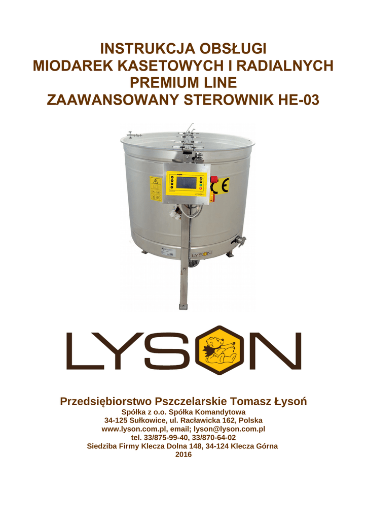 INSTRUKCJA OBSŁUGI MIODAREK KASETOWYCH I RADIALNYCH PREMIUM LINE ZAAWANSOWANY STEROWNIK HE-03 Przedsiębiorstwo Pszczelarskie Tomasz Łysoń Spółka z o.o. Spółka Komandytowa 34-125 Sułkowice, ul. Racławicka 162, Polska www.lyson.com.pl, email; [email protected] tel. 33/875-99-40, 33/870-64-02 Siedziba Firmy Klecza Dolna 148, 34-124 Klecza Górna 2016 1. Instrukcja obejmuje miodarki o kodach: Miodarki kasetowe PREMIUM LINE: W205000_P, W205001_P, W205400_P, W201600_P, W201601_P, W205500_P, W205300B_P, W2053001B_P, W20570B_P, W205200B_P, W2052001B_P, 209900B_P, W2099001B_P Miodarki radialne PREMIUM LINE: W2005000_P, W2006000_P, W2007000_P, W2008000_P Instrukcja obsługi 1. Ogólne zasady bezpieczeństwa użytkowania miodarki 1.1. Zasady użytkowania 1.2. Bezpieczeństwo elektryczne 1.3. Bezpieczeństwo użytkowania 2. Instrukcja użytkowania miodarki 2.1. Ogólne zasady przygotowania miodarki do pracy 2.2. Zasady użytkowania 3. Schemat miodarki 4. Charakterystyka miodarek PREMIUM LINE 4.1. Miodarki radialne 4.2. Miodarki kasetowe 4.3. Parametry techniczne miodarek 4.4. Sterowanie w miodarkach PREMIUM LINE 4.4.1. Zaawansowane sterowanie automatyczne HE-03 5. Instrukcja obsługi sterownika w miodarkach PREMIUM LINE 5.1. Praca w trybie manualnym. 5.2. Praca w trybie automatycznym 5.3. Menu systemowe sterownika 5.4. Raport błędów 6. Przechowywanie miodarek 7. Konserwacja i czyszczenie miodarki 7.1. Demontaż kosza w miodarkach PREMIUM LINE 8. Utylizacja 9. Gwarancja 1 1. Ogólne zasady bezpieczeństwa użytkowania miodarki Przed rozpoczęciem użytkowania urządzenia należy przeczytać instrukcję użytkowania i postępować według wskazówek w niej zawartych. Producent nie odpowiada za szkody spowodowane użytkowaniem urządzenia niezgodnie z jego przeznaczeniem lub niewłaściwą jego obsługą. 1.1. Zasady użytkowania 1. Miodarka przeznaczona jest do odwirowywania miodu z ramek. 2. Miodarkę przed wirowaniem należy dokładnie umyć gorącą wodą z niewielką ilością preparatów dopuszczonych do mycia urządzeń przeznaczonych do kontaktu z żywnością, lub za pomocą myjki ciśnieniowej, pamiętając o zabezpieczeniu elementów elektronicznych i łożysk przed zamoczeniem!!! 3.Po umyciu dokładnie spłukać. 1.2. Bezpieczeństwo elektryczne 1.3. Bezpieczeństwo użytkowania 1. Niniejszy sprzęt nie jest przeznaczony do użytkowania przez osoby (w tym dzieci) o ograniczonej zdolności fizycznej, czuciowej lub psychicznej lub osoby nie mające doświadczenia lub znajomości sprzętu, chyba, że odbywa się to pod nadzorem lub zgodnie z instrukcją użytkowania sprzętu, przekazanej przez osoby odpowiadające za ich bezpieczeństwo. Należy zwracać uwagę na dzieci, aby nie bawiły się miodarką. 2. W przypadku uszkodzenia miodarki, w celu uniknięcia zagrożenia, naprawę może przeprowadzić tylko specjalistyczny zakład naprawczy albo wykwalifikowana osoba. 3. Zabrania się prowadzić jakichkolwiek prac konserwacyjnych podczas pracy urządzenia. 4. Wszystkie osłony podczas pracy muszą być trwale przymocowane do miodarki. 5. W przypadku jakiegokolwiek zagrożenia należy bezzwłocznie użyć wyłącznika bezpieczeństwa. Ponowne uruchomienie miodarki może nastąpić po wyeliminowaniu zagrożenia. 6. Urządzenia te nie są przeznaczone do pracy na zewnątrz pomieszczeń, mogą być eksploatowane tylko wewnątrz pomieszczeń. 7. Miodarki posiadające podgrzewane dno i/ lub bęben wyposażone są w cyfrowy regulator temperatury (w zakresie od 30-55º C). 8. Urządzenia nie wolno włączać i przechowywać przy temperaturze poniżej 0º C. Miodarki nie należy włączać, gdy temperatura otoczenia jest niższa niż 5ºC. Przed uruchomieniem miodarki, w przypadku gdy została ona przeniesiona z pomieszczenia o niższej temperaturze do pomieszczenia o wyższej temperaturze, należy odczekać aż osiągnie ona temperaturę otoczenia. 1. Instalacja elektryczna zasilająca musi być wyposażona w wyłącznik różnicowo-prądowy o znamionowym prądzie zadziałania i nie wyższym niż 30mA. Okresowo należy sprawdzać działanie wyłącznika nadprądowego 2. Jeżeli przewód zasilający nieodłączany lub przewód łączeniowy ulegnie uszkodzeniu i trzeba go wymienić, to czynność ta powinna być wykonana u gwaranta lub przez specjalistyczny zakład naprawczy albo przez wykwalifikowaną osobę w celu uniknięcia zagrożenia. Nie używać miodarki, gdy przewód zasilający lub łączeniowy jest uszkodzony. 3. Przed włączeniem urządzenia do sieci należy upewnić się, że sterowanie jest wyłączone. Wyłącznik na panelu sterowania powinien znajdować się w pozycji „0”. 4. Należy upewnić się, czy napięcie nominalne miodarki i źródła zasilania są zgodne. 5. Podczas podłączania do sieci należy zachować ostrożność. Ręce muszą być suche! Podłoże, na Zakaz naprawiania urządzenia w ruchu którym stoi wirówka powinno być suche! 6. W momencie uruchamiania miodarki przycisk „STOP awaryjny” powinien pozostać wyłączony (należy przekręcić tak, aby wyskoczył). Wciśnięcie przycisku „STOP awaryjny” umożliwia natychmiastowe zatrzymanie pracy wirówki. Zakaz zdejmowania osłon podczas pracy urządzenia 7. Pokrywa miodarki podczas wirowania musi być zamknięta! Zabrania się otwierania pokrywy miodarki Miejsce pracy podczas wirowania. 8. Nie należy przestawiać miodarki podczas wirowania. Powinno być oświetlone oraz utrzymane w należytej 9. Należy chronić silnik oraz sterowanie przed wilgocią; czystości. (również podczas przechowywania) 10. Zabrania się ciągnąć za przewód zasilający. Przewód zasilający należy trzymać z dala od źródeł ciepła, ostrych krawędzi oraz dbać o jego dobry stan. 1 2. INSTRUKCJA UŻYTKOWANIA MIODARKI 2.1. Ogólne zasady przygotowania miodarki do pracy 1. Ustawić miodarkę w miejscu do tego celu wyznaczonym. 2. Przymocować miodarkę do podłoża, celem uniknięcia jej przestawienia podczas wiro